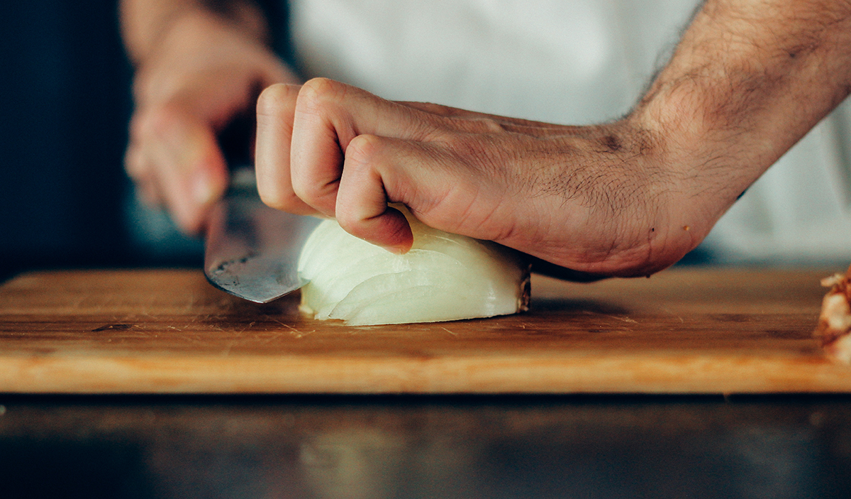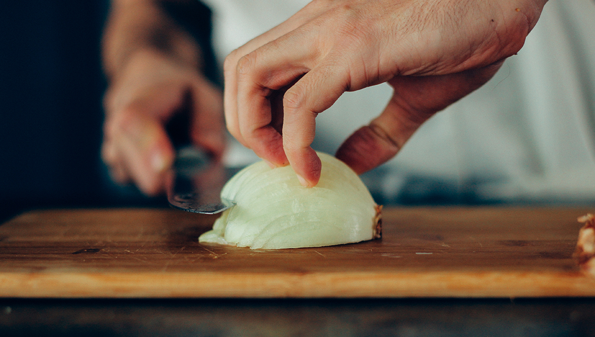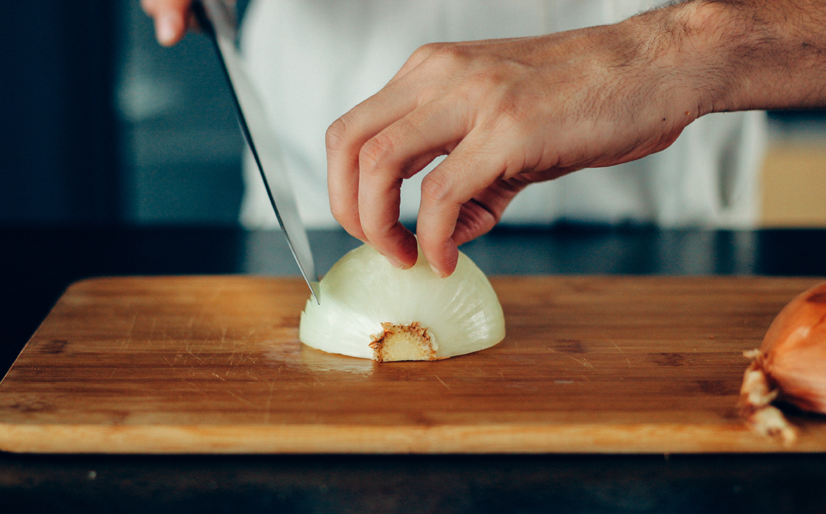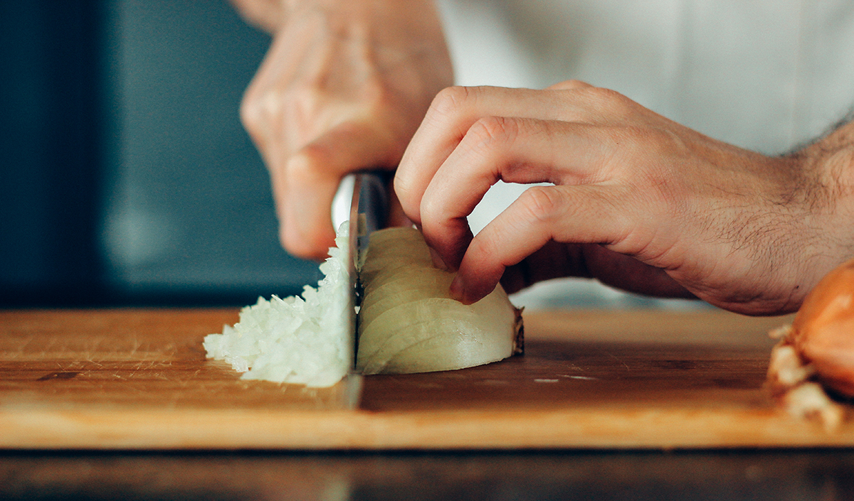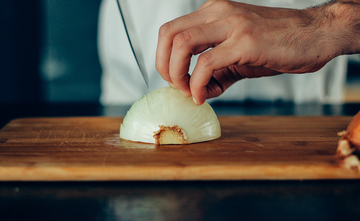 Pelá la cebolla y el ajo. La cebolla, cortala en doble cincelado o como te sea más fácil. El ajo picalo lo más chico posible, agregale un chorrito de aceite para que no se oxide y reservalos. Dejá la cebolla remojando en vinagre con sal unos diez minutos.