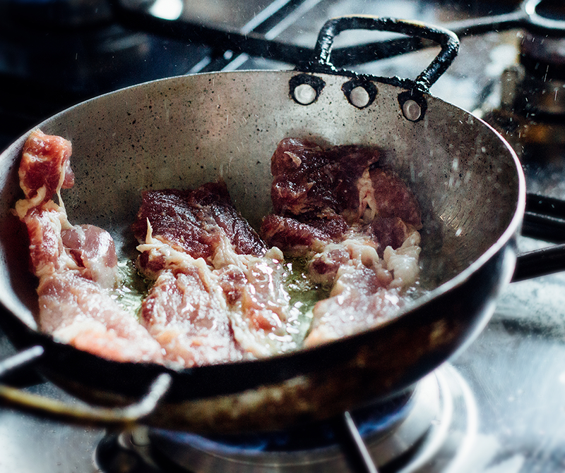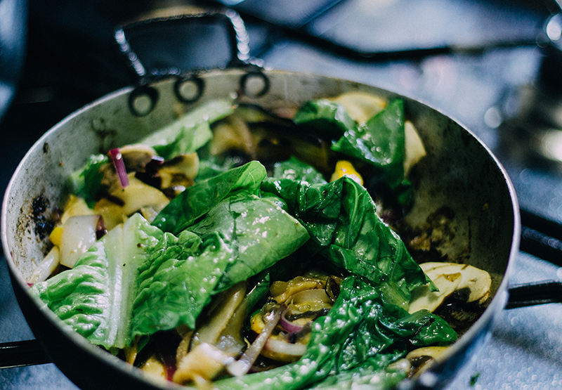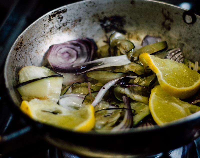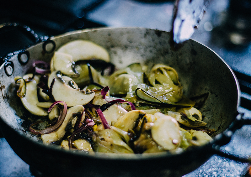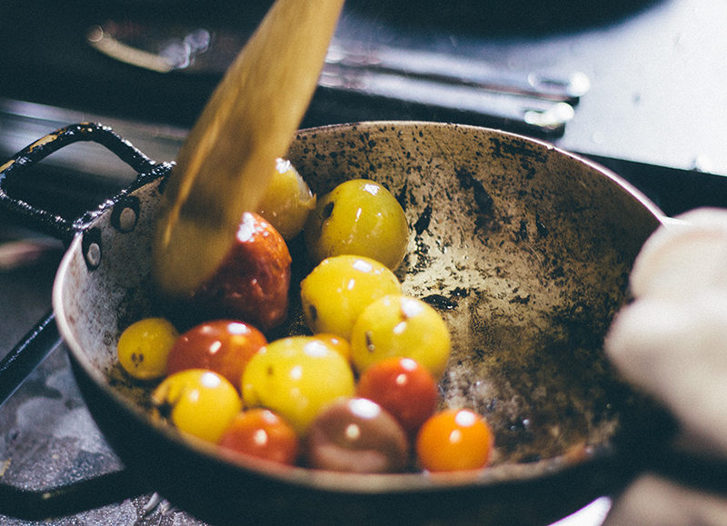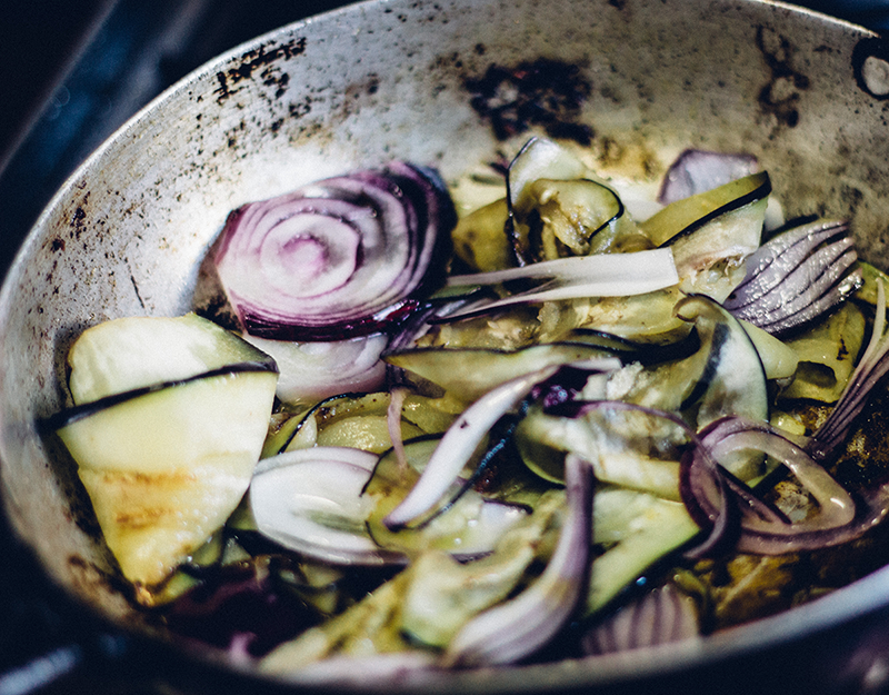 En la misma sartén donde salteaste la bondiola retirá el excedente de grasa y salteá las verduras a fuego alto, luego regulá a medio-bajo para que no se quemen. Por cada verdura agregá un poco de sal para que suden los jugos, no las toques mucho para que se adhieran un poco a la sartén y ahí vas removiendo (idealmente, con una cuchara de madera). Los tomates son lo último que agregás para que no se deshagan.