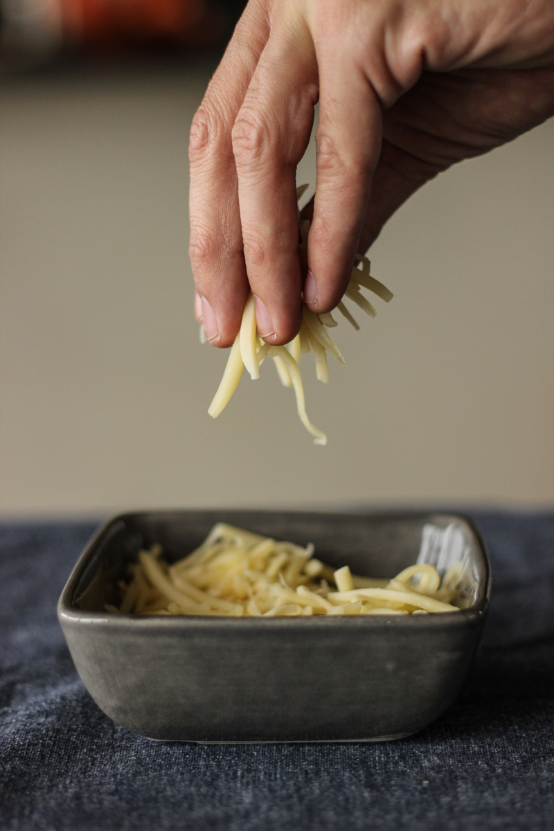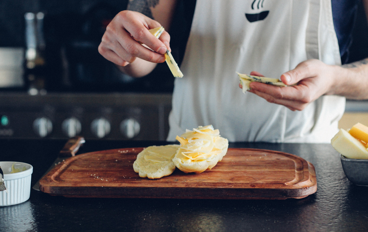 Arrancá precalentando el horno a 180°C. Cortá los quesos en fetas. Lo más fácil es hacerlo con una espátula para cortar queso, o en su defecto, una mandolina. Sino, podés usar un cuchillo, pero en el caso del queso azul, que es bastante difícil de cortar en fetas, hacelo lo más fino posible. Reservalos en la heladera.