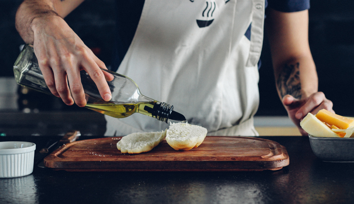 Abrí cada ciabatta a la mitad y colocale un chorrito de aceite de oliva a una de las bases del pan. Untalo con el aderezo y agregale los quesos