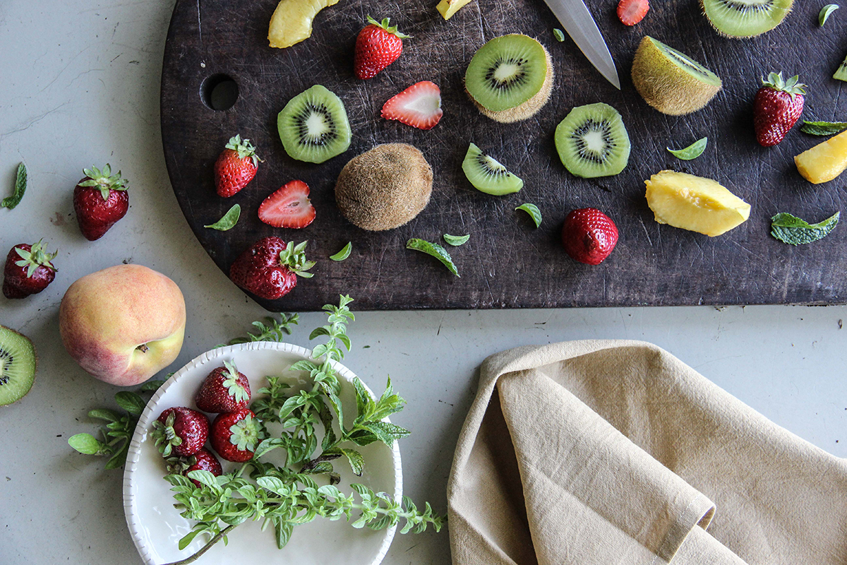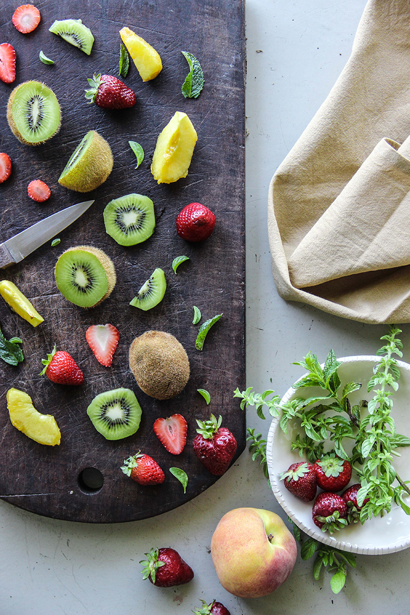 Picá las frutas, llevalas a la jarra junto con el vodka, el vino blanco, el triple sec y el jugo de limón, sumándole las ramitas de menta. Guardala en la heladera por aproximadamente dos horas.