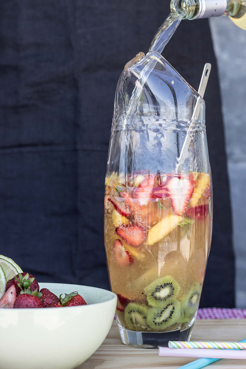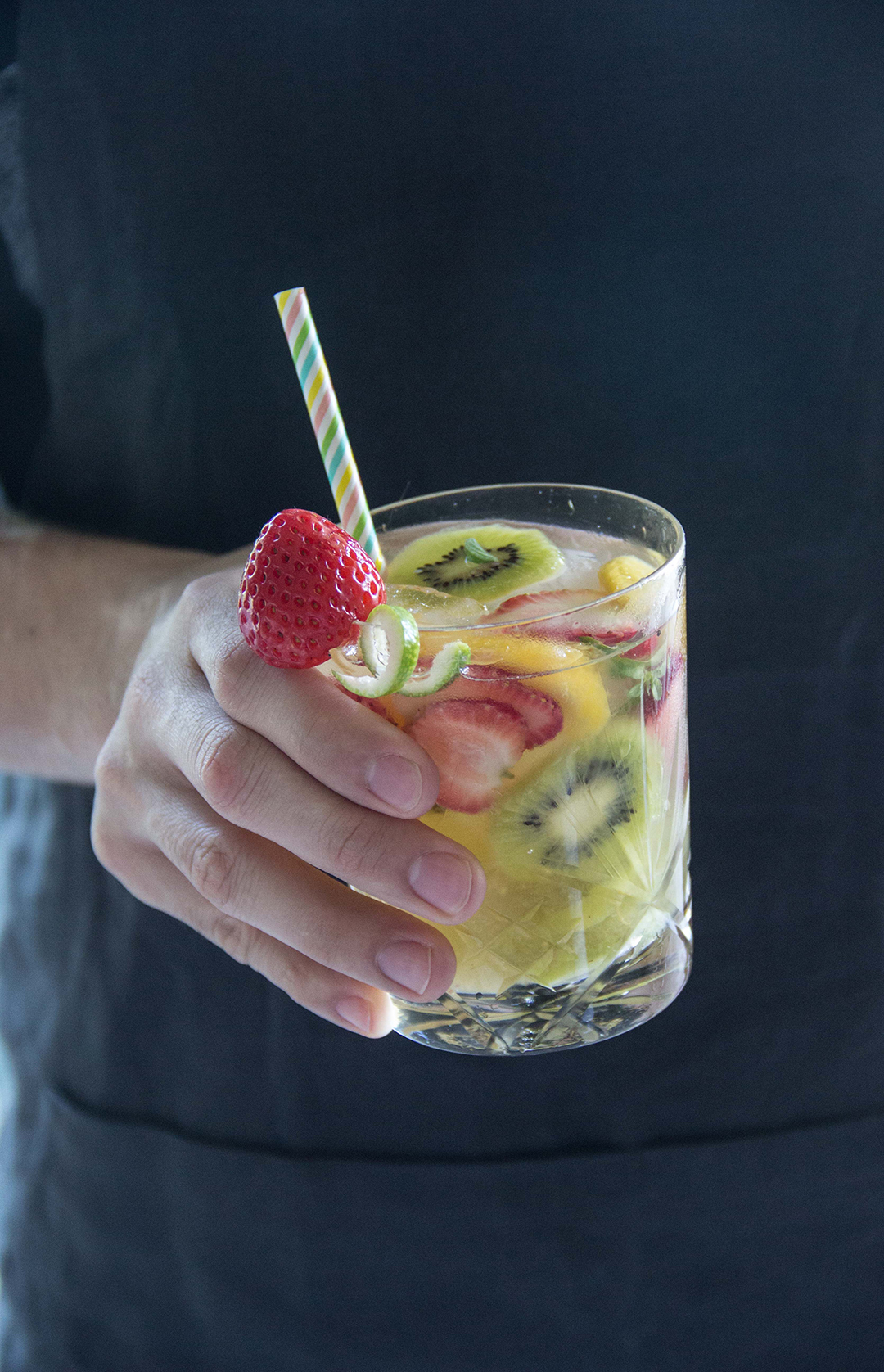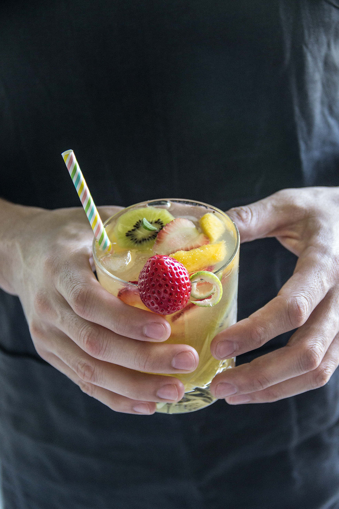 Llegó el último fin de semana extra largo del año, y decidimos celebrarlo con un brindis veraniego. La sangría es una bebida que nace en España, pensada para refrescarse en verano, y que consiste típicamente en vino tinto, alguna fruta picada, endulzante y licor. Como siempre, nosotros quisimos darle una vuelta y, en vez de servirla con tinto nos fuimos al blanco para una variedad más frutal, ideal para compartir con amigos.