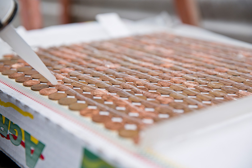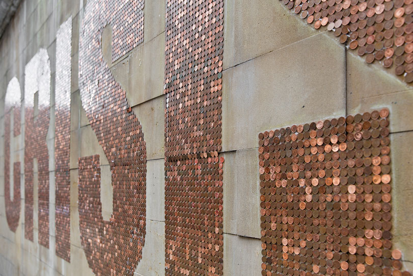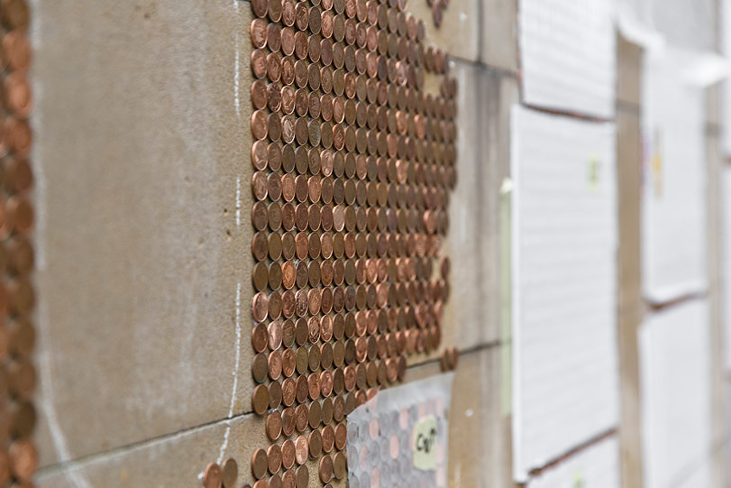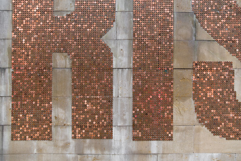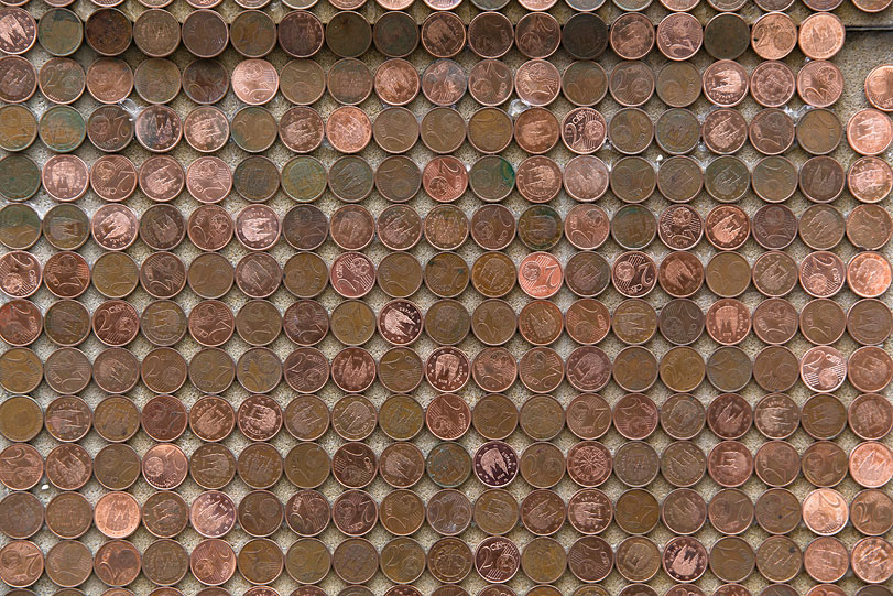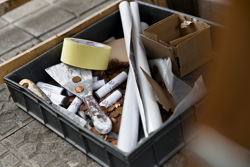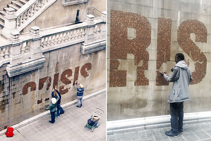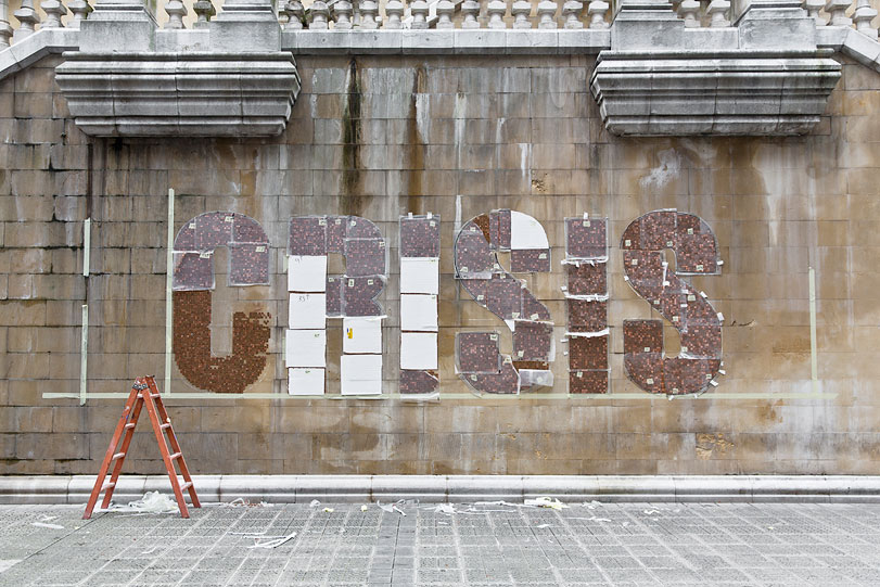 1000 euros en monedas de 2 centavos fueron pegados a una pared deletreando, en grandes letras en mayúscula, la palabra CRISIS, aludiendo a los duros tiempos que se viven en el país europeo.