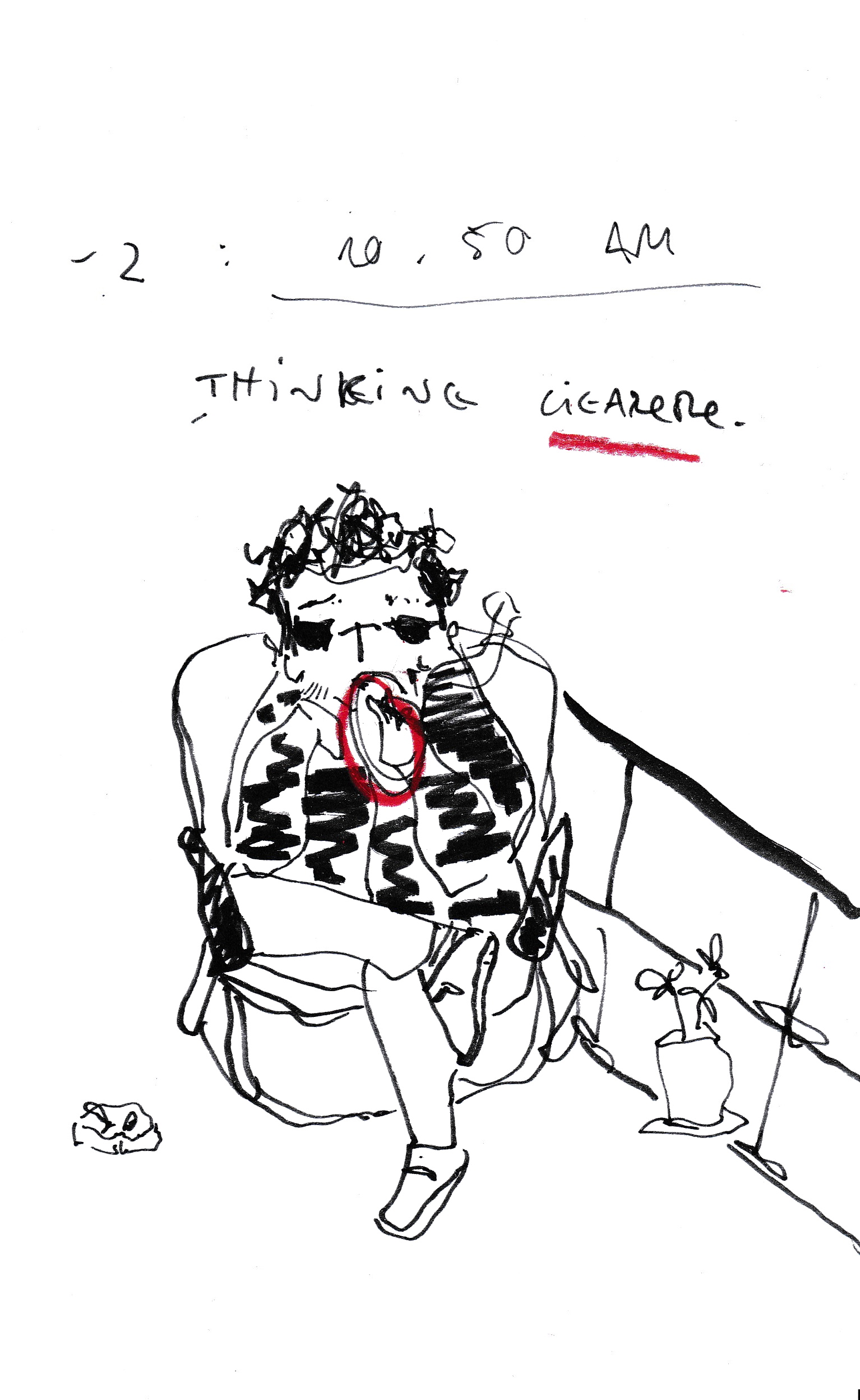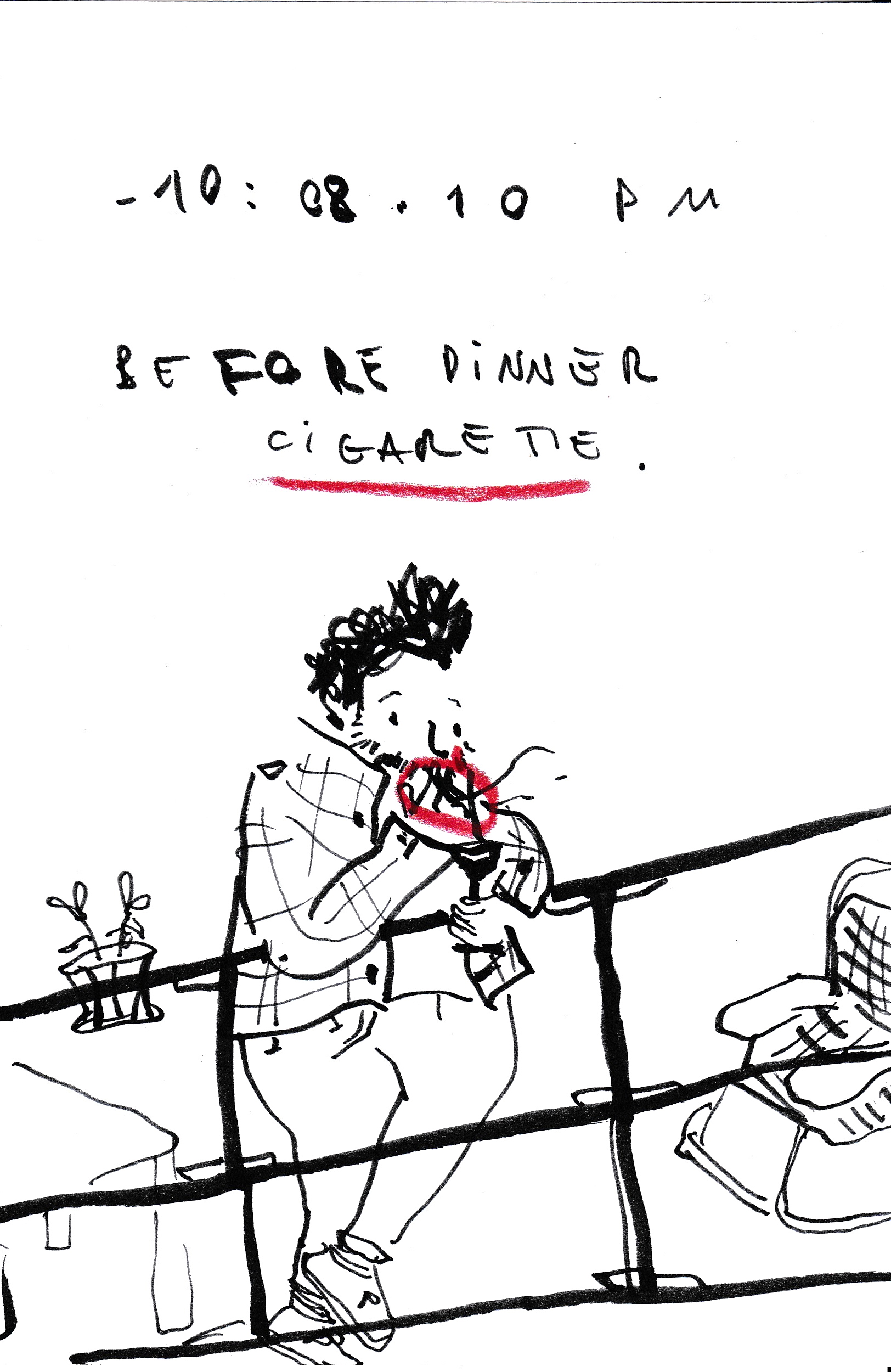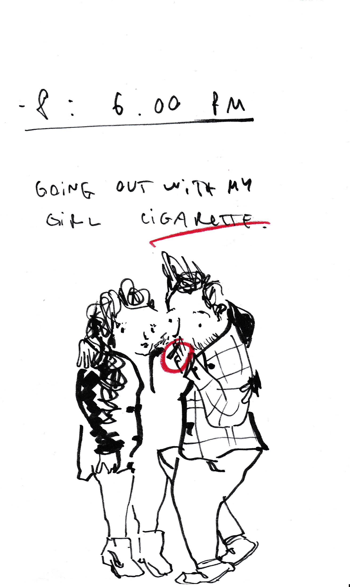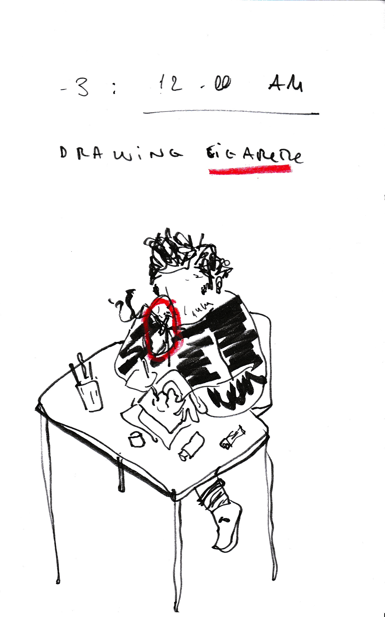 Ha creado su serie de ilustraciones “Smoking”, en donde ha investigado sobre su vicio de fumar dibujando durante un dia en todos los momentos en lo que fumó analizando cual cigarros podrían ser eliminados de mi día.