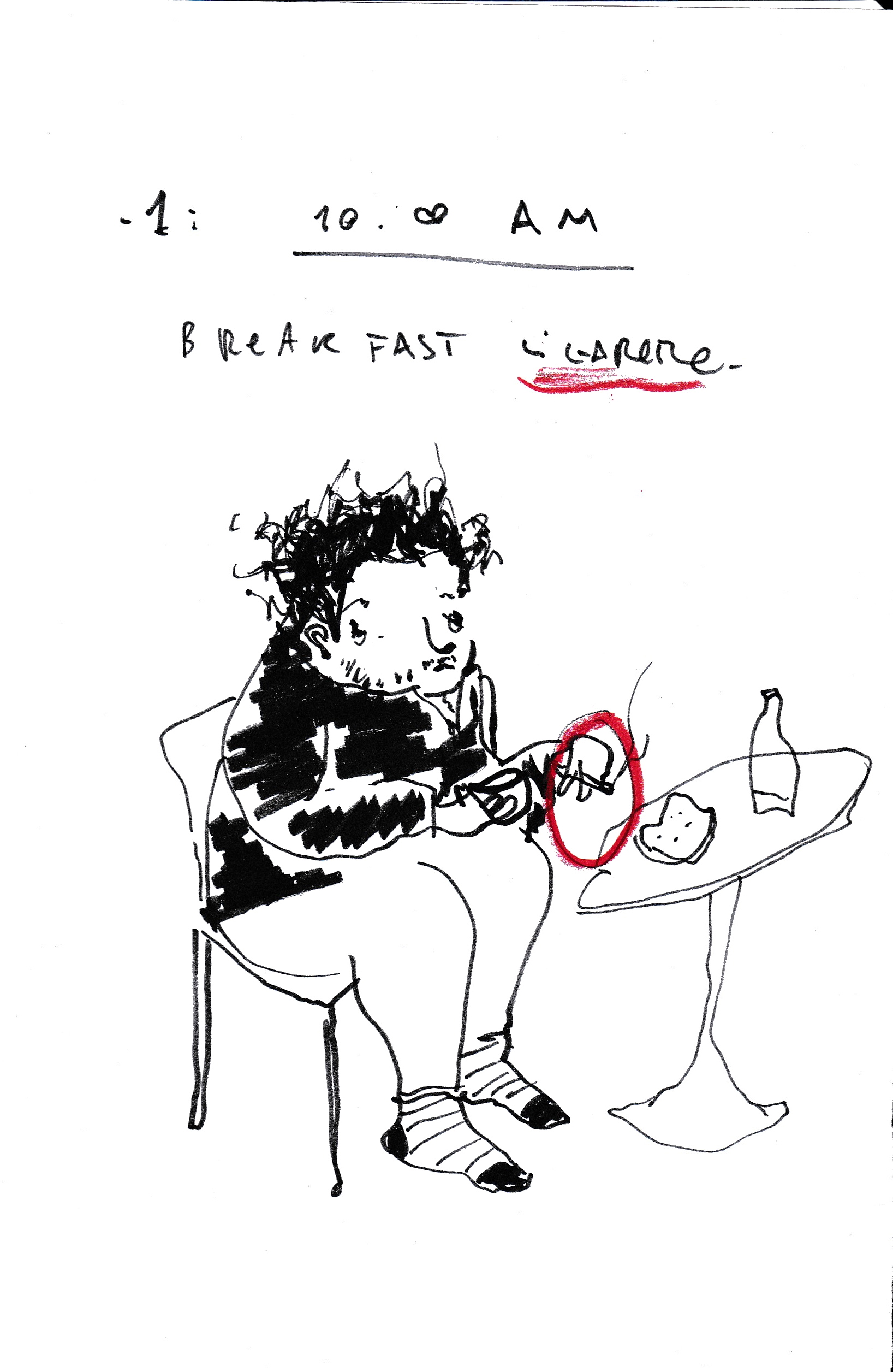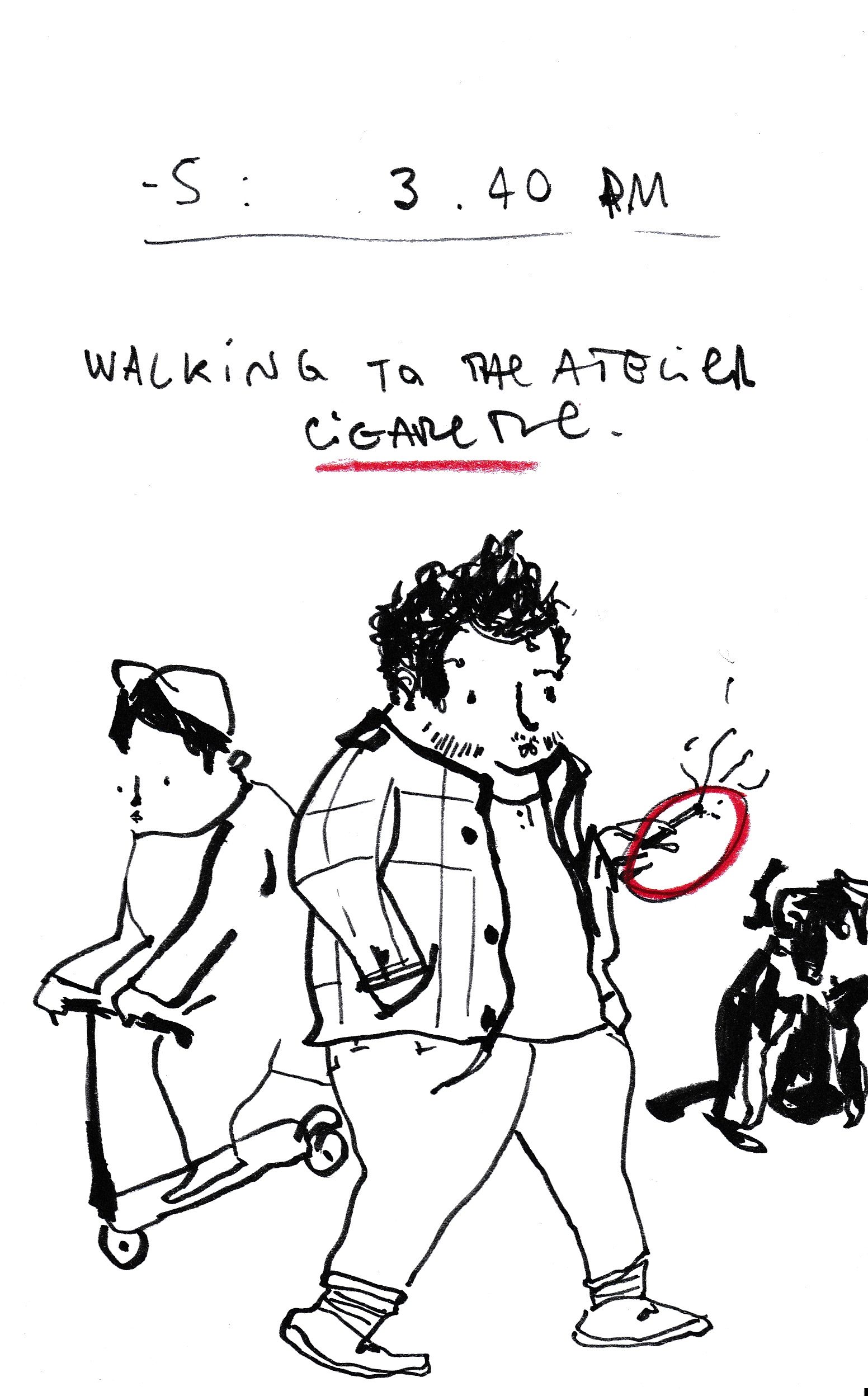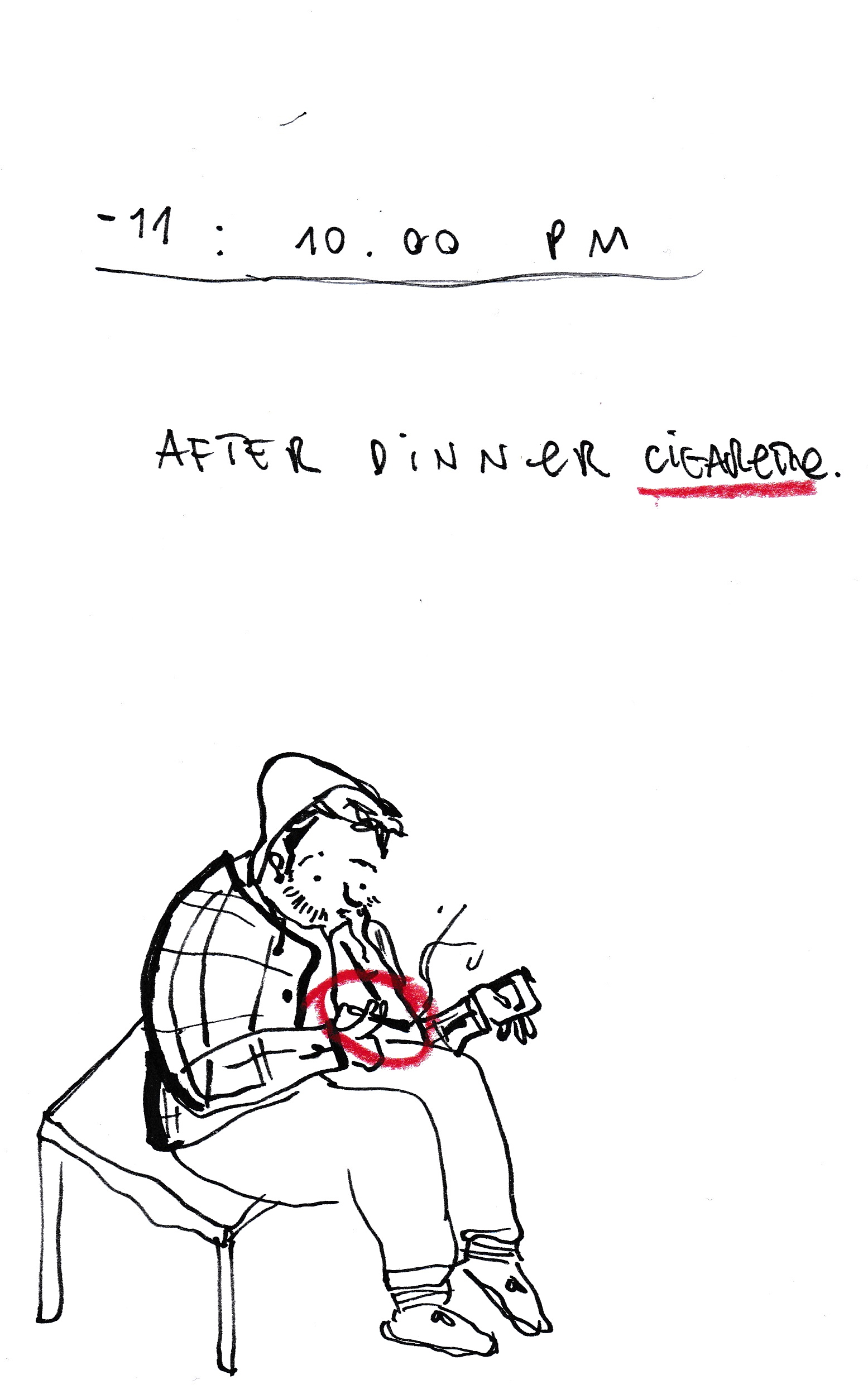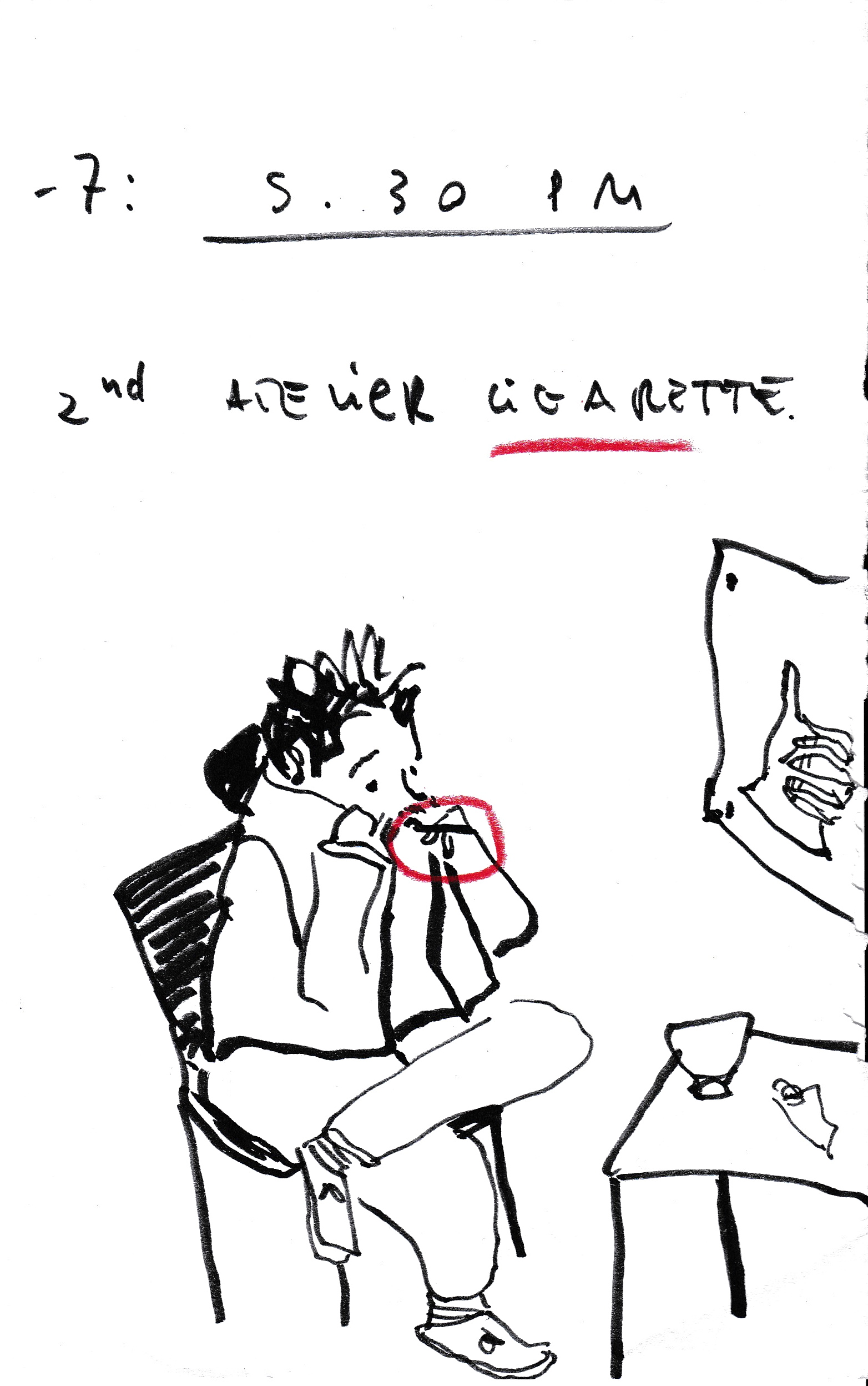 Ha creado su serie de ilustraciones “Smoking”, en donde ha investigado sobre su vicio de fumar dibujando durante un dia en todos los momentos en lo que fumó analizando cual cigarros podrían ser eliminados de mi día.