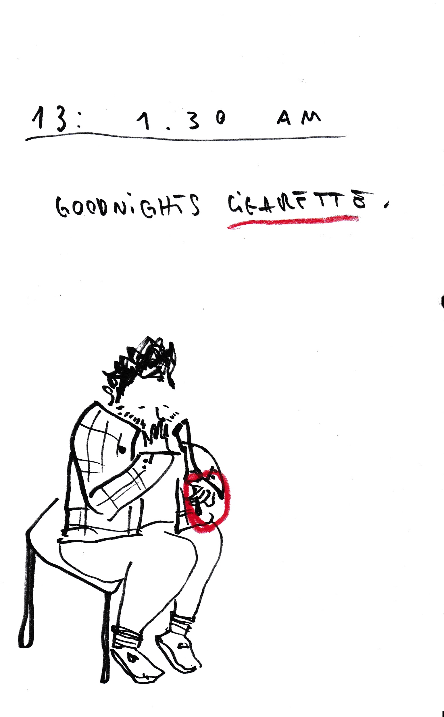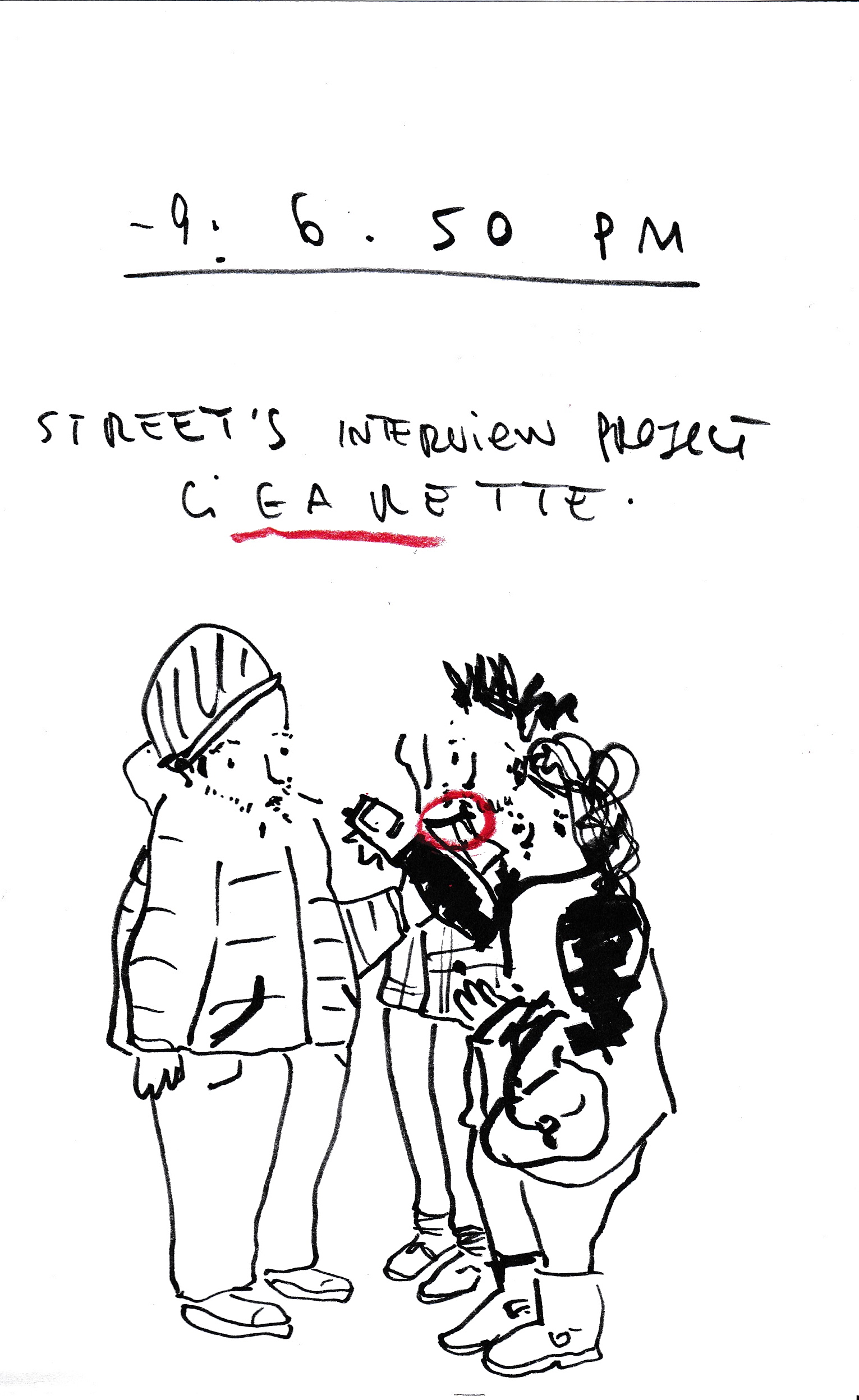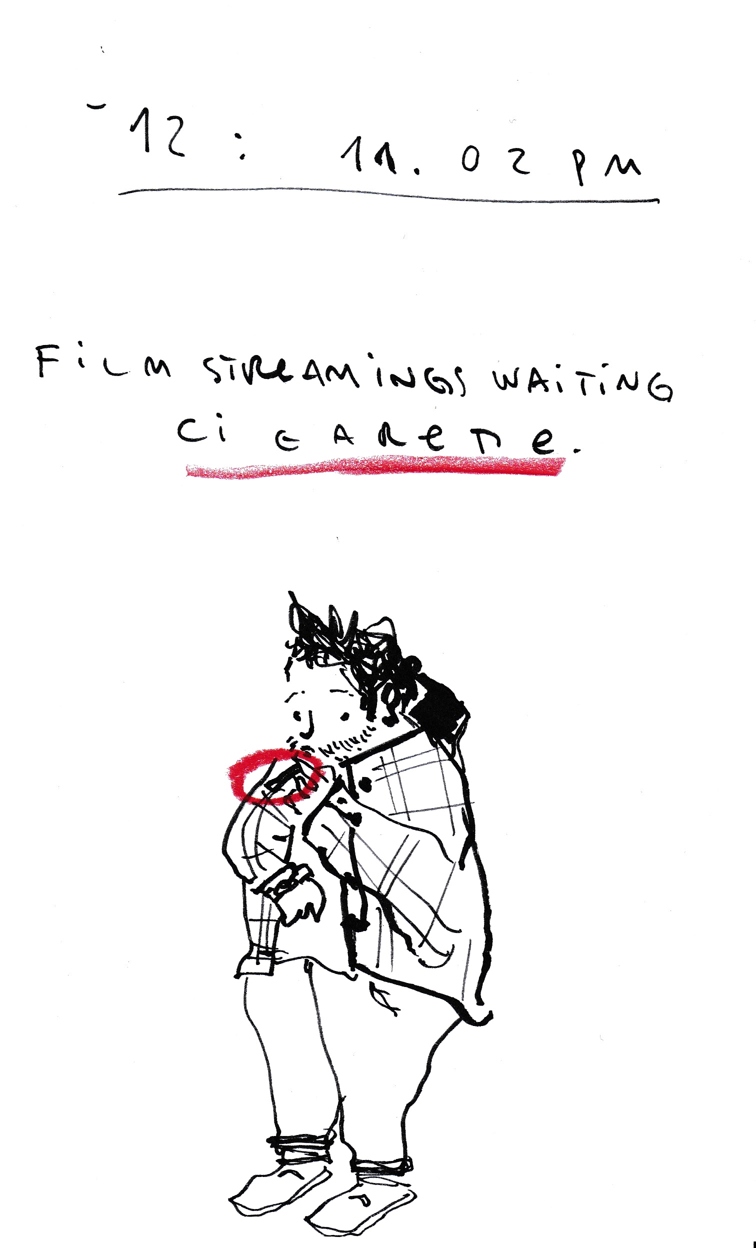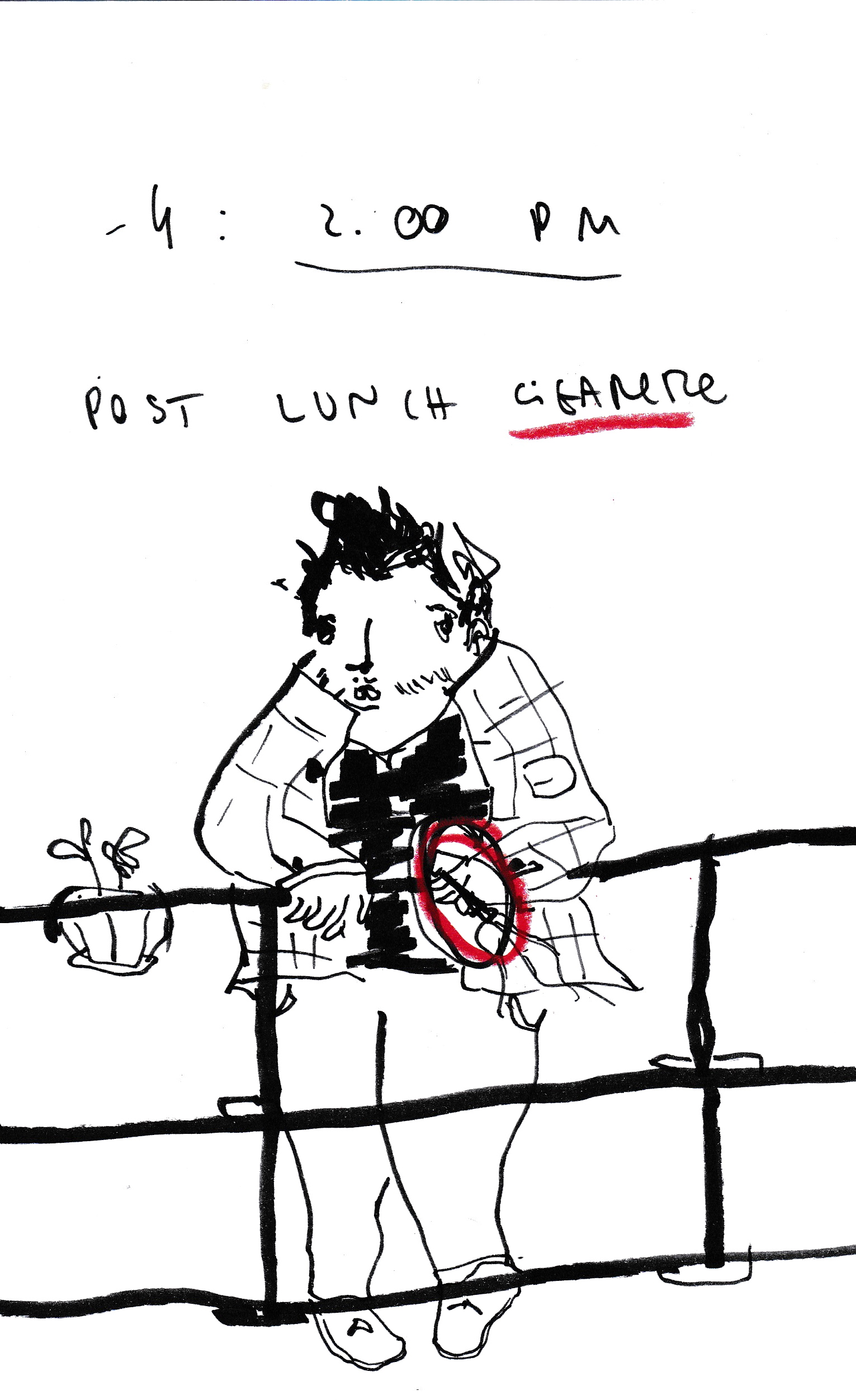 Ha creado su serie de ilustraciones “Smoking”, en donde ha investigado sobre su vicio de fumar dibujando durante un dia en todos los momentos en lo que fumó analizando cual cigarros podrían ser eliminados de mi día.