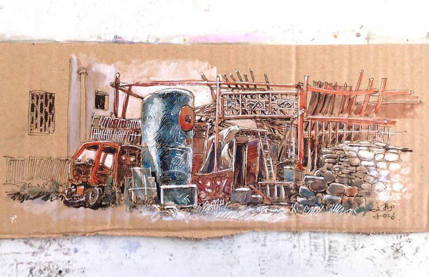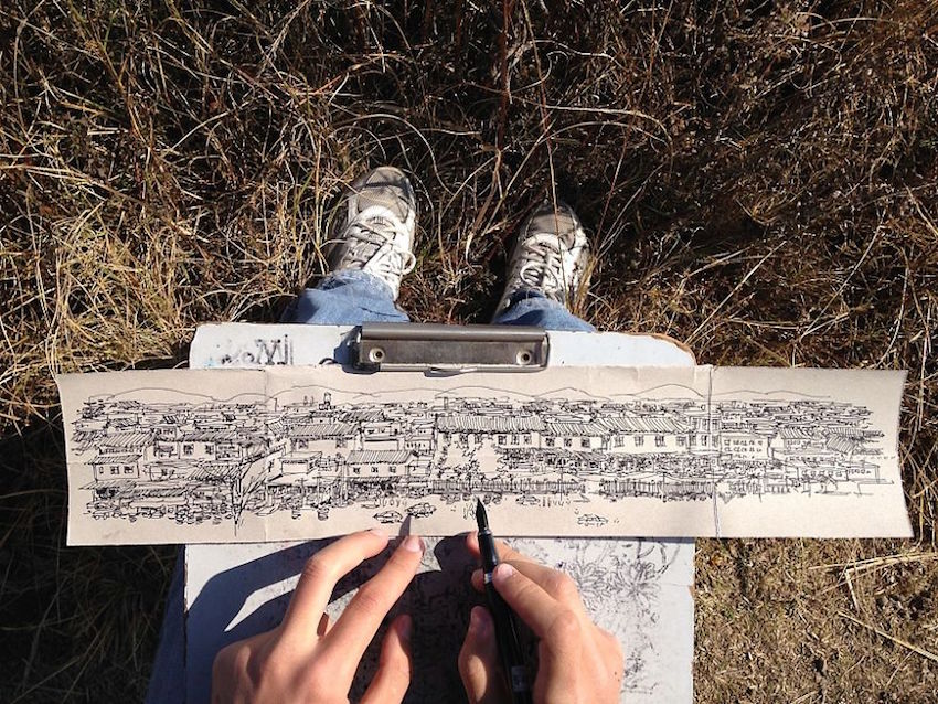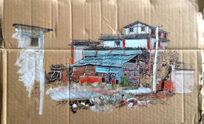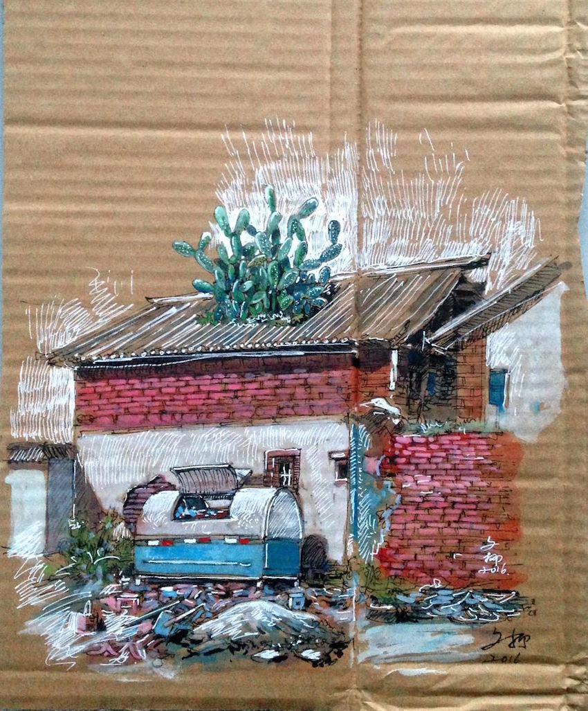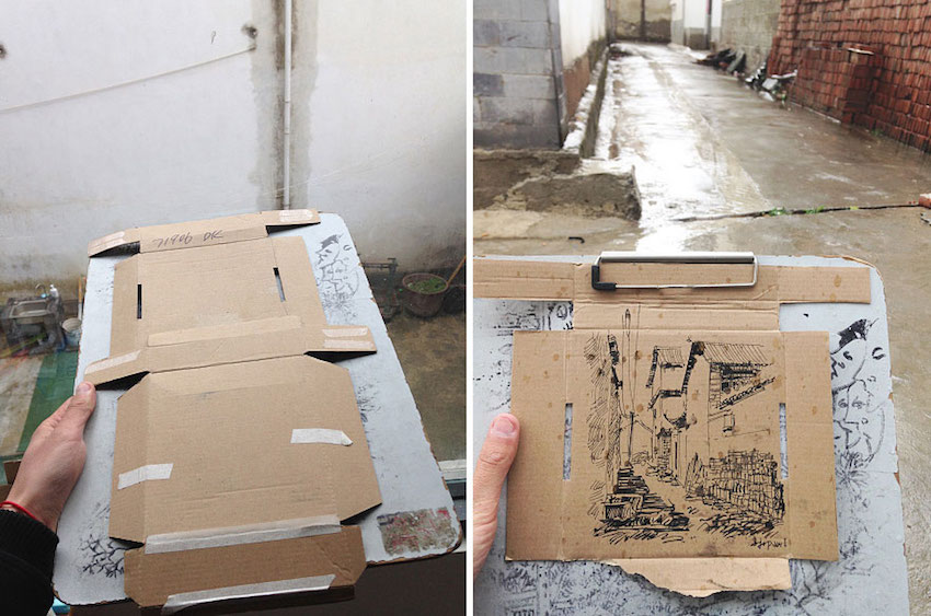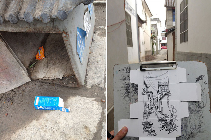 Wenyi es un artista chino que vaga por las calles de su ciudad natal, Dali, en la provincia de Yunnan, China, recolectando pedacitos de cartón de descarte para usar como lienzo. En ellos, dibuja lo que ve en el momento a sus alrededores, con técnicas que van desde un boceto rápido en lápiz hasta a paisajes a color. Una vez que termina, vuelve a colocarlos donde los encontró, inyectándole así un poco de arte a la cotidianidad.