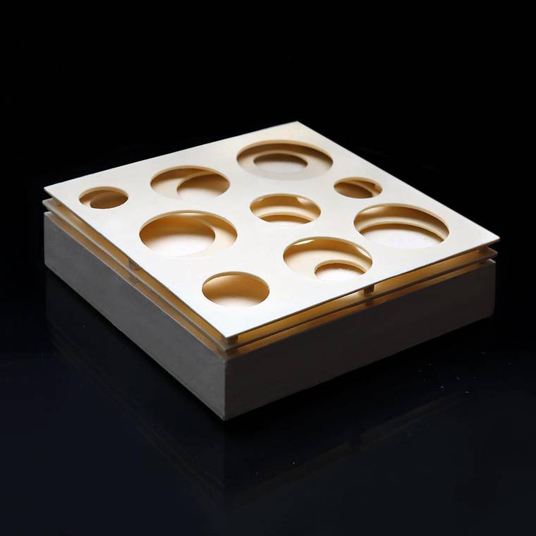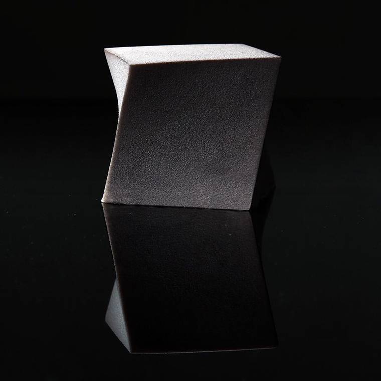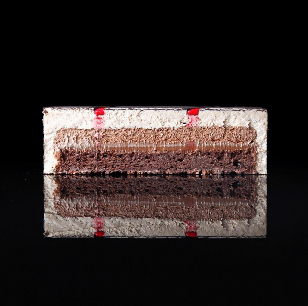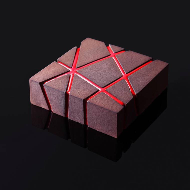 Ángulos pronunciados, volúmenes, relieves y hasta pisos en pequeñas láminas de chocolate son algunas de sus propuestas. Para crearlas, diseña sus propios moldes en 3DMAX, imprime la base en una impresora 3D, que luego usa para hacer el molde en silicona. Tan lindo, que da pena comerlo.