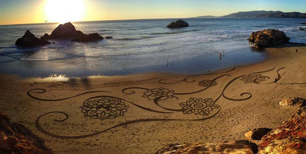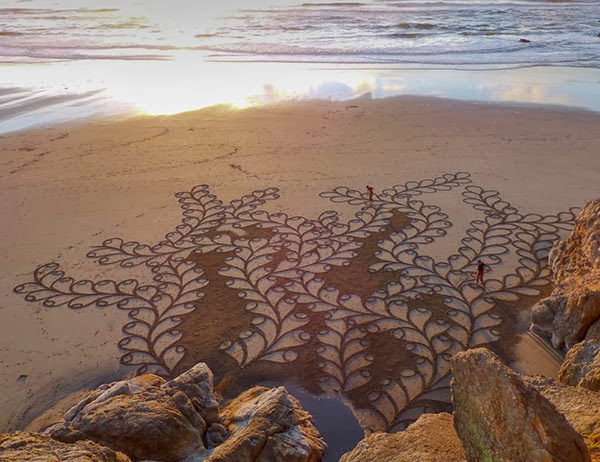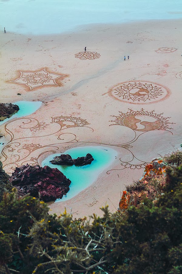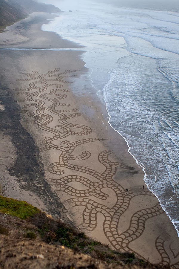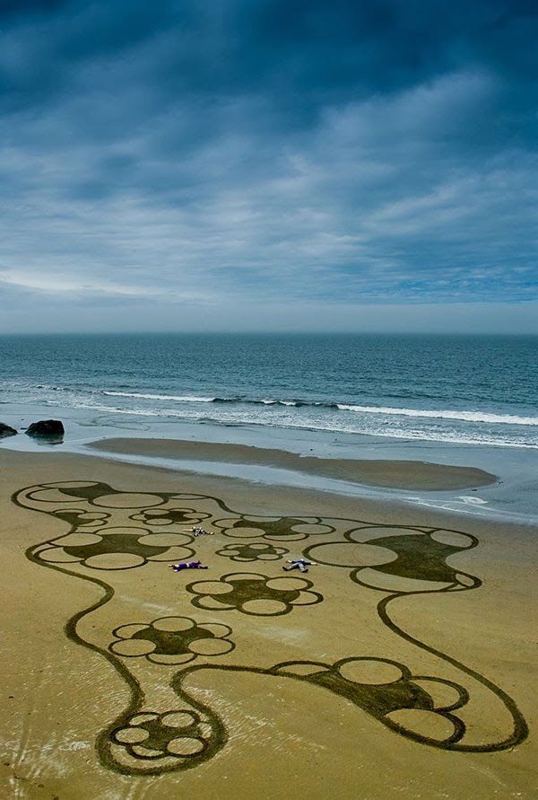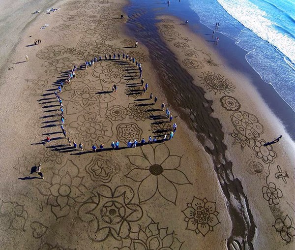 Amador crea estos impresionantes y gigantescos dibujos en la arena solamente con un rastrillo y algunos voluntarios.