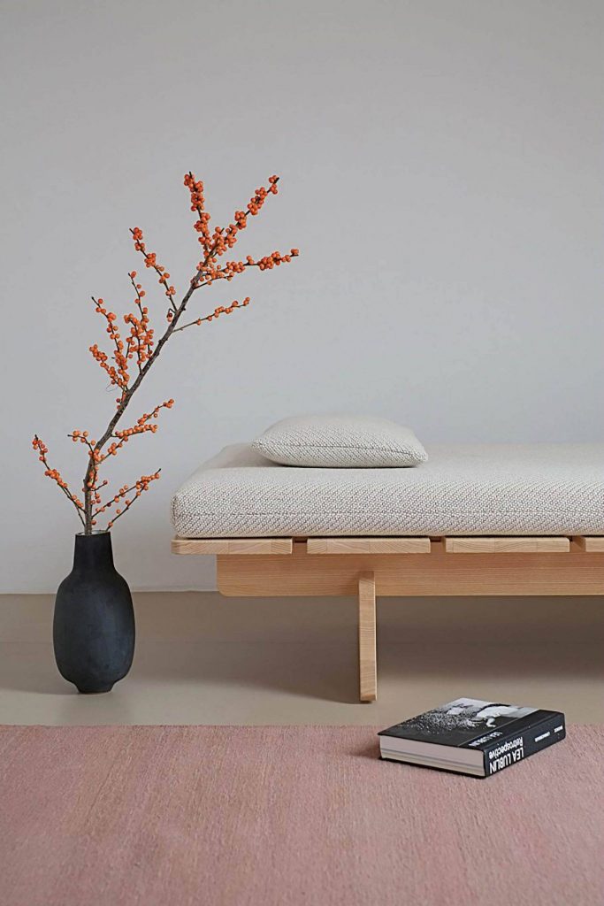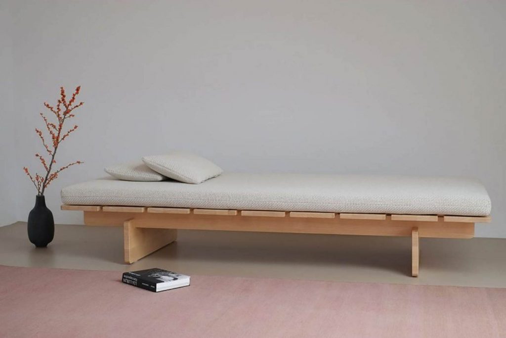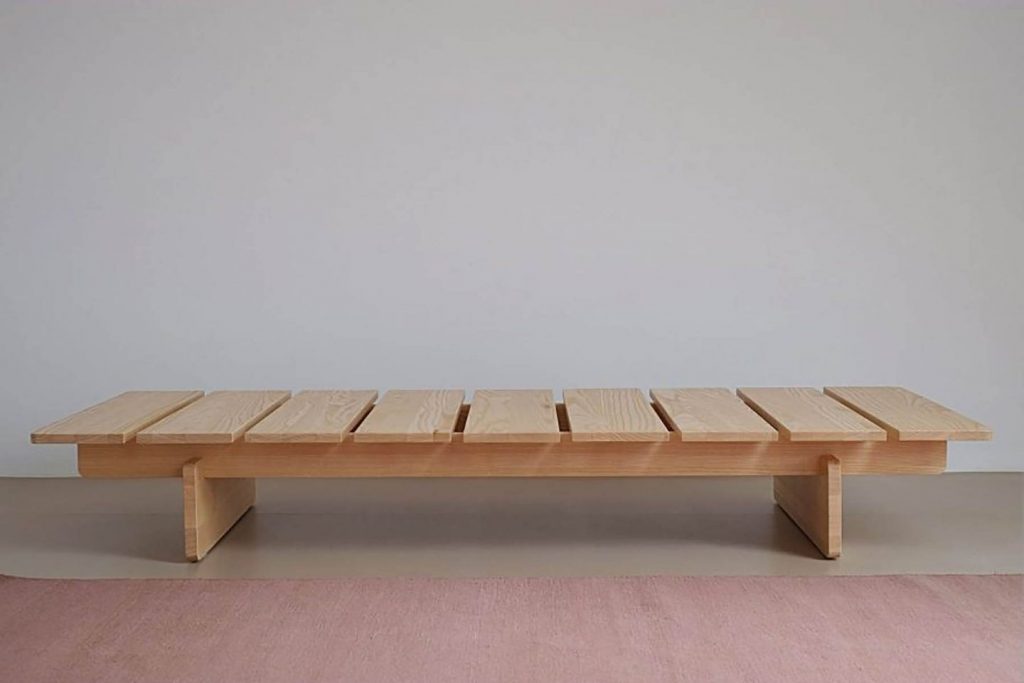 La construcción de este elegante y limpio sofá cama es simple pero refinado: nueve tablones se apoyan en cuatro tablas que se unen entre sí, formando la base de la cama. Los bordes redondeados de los elementos de madera maciza de fresno prestan lo que el diseñador llama un “toque suave” al diseño general.