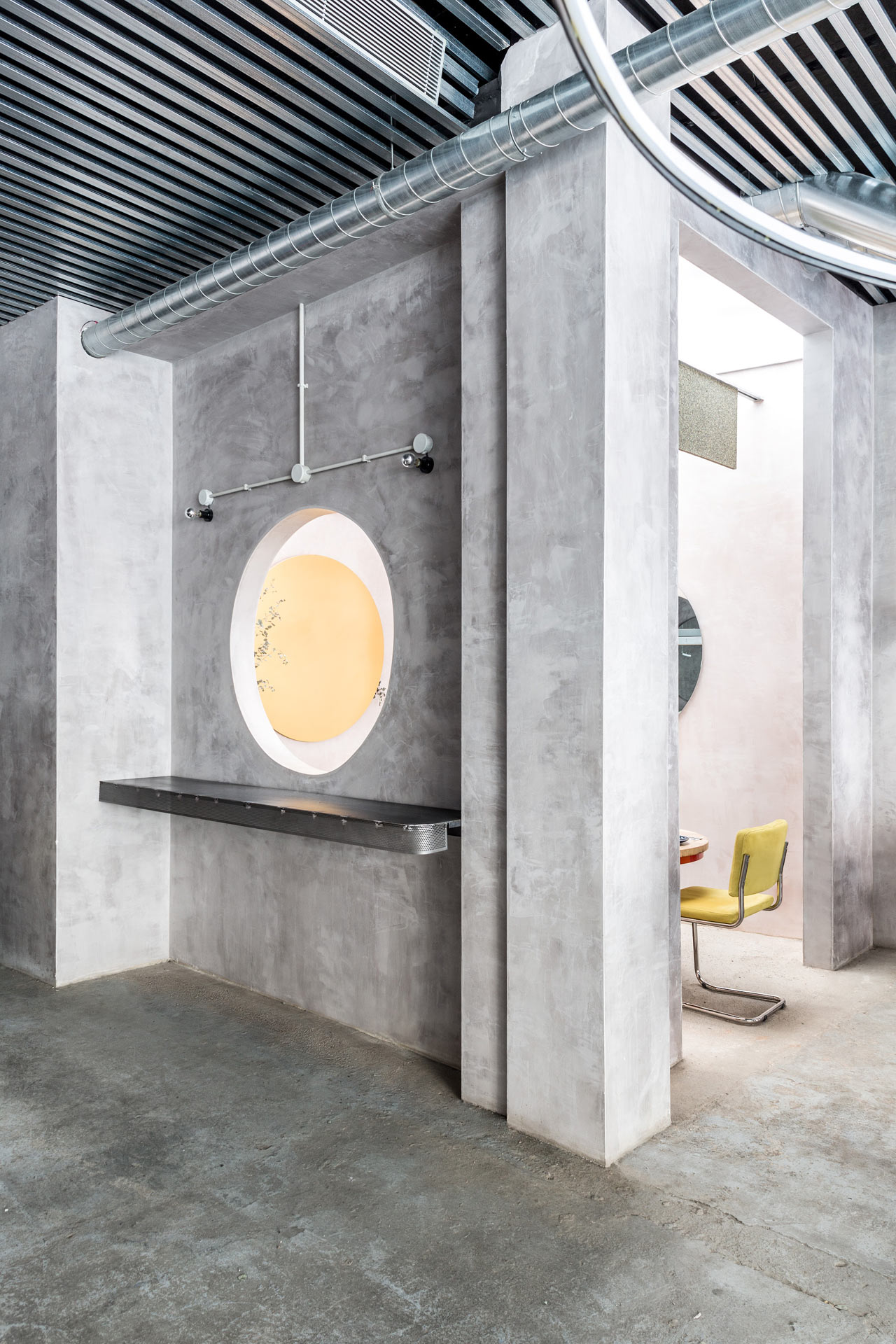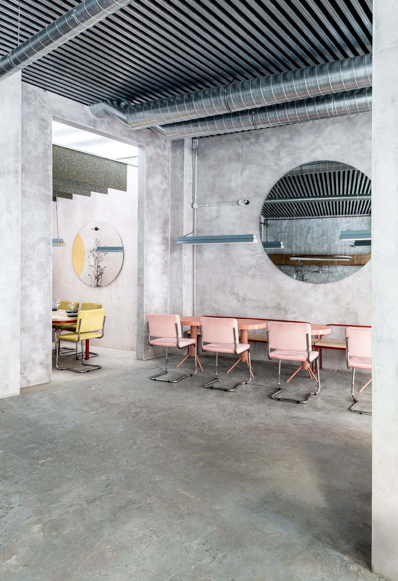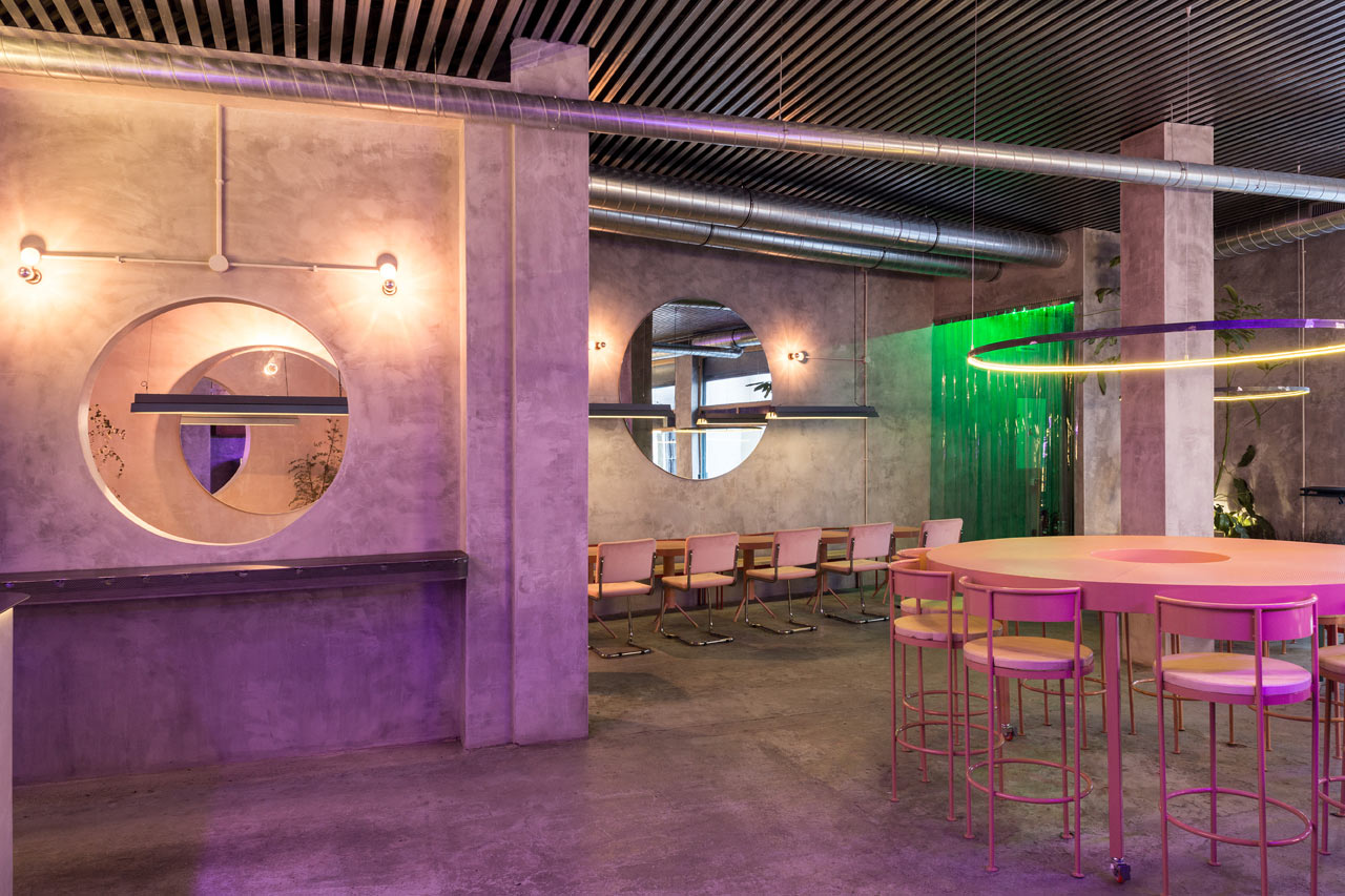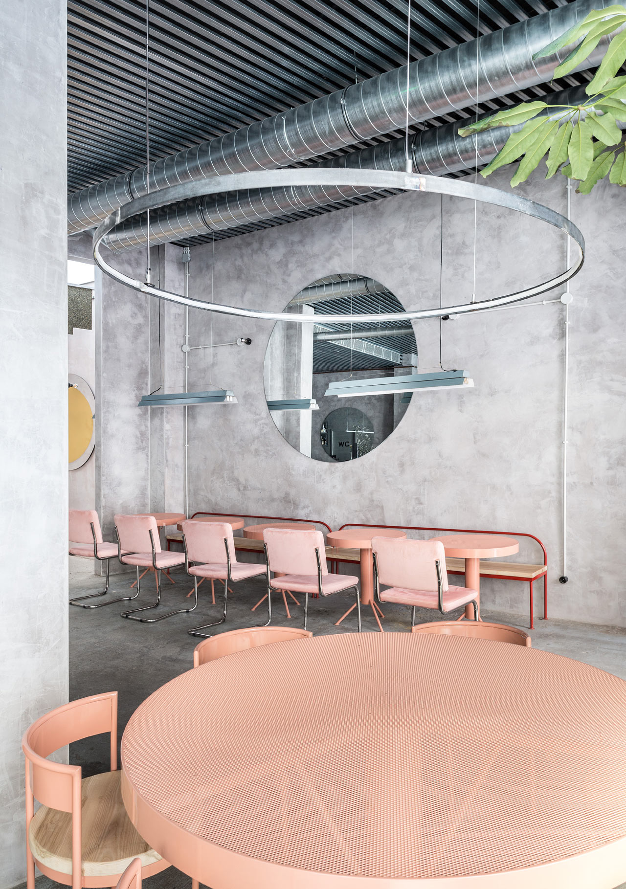 Plantas, colores y iluminación cálida aportan un aire fresco y comodidad al espacio gris.Diferentes apliques de metal perforado de colores ayudan a destacar la experiencia gastronómica de manera simple y no intrusiva. Por otra parte el círculo se usa como elemento de decoración en diferentes puntos para conectar las áreas. Las tuberías vistas, paneles de metal en el techo y una barra de bar en sinuoso cemento ayudan a continuar con el ambiente industrial.