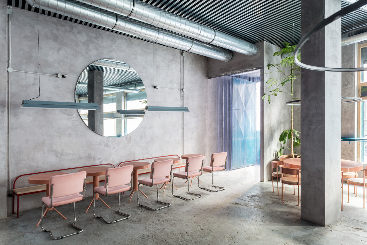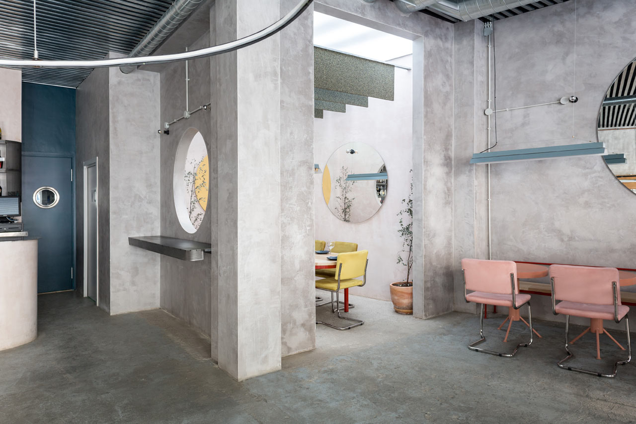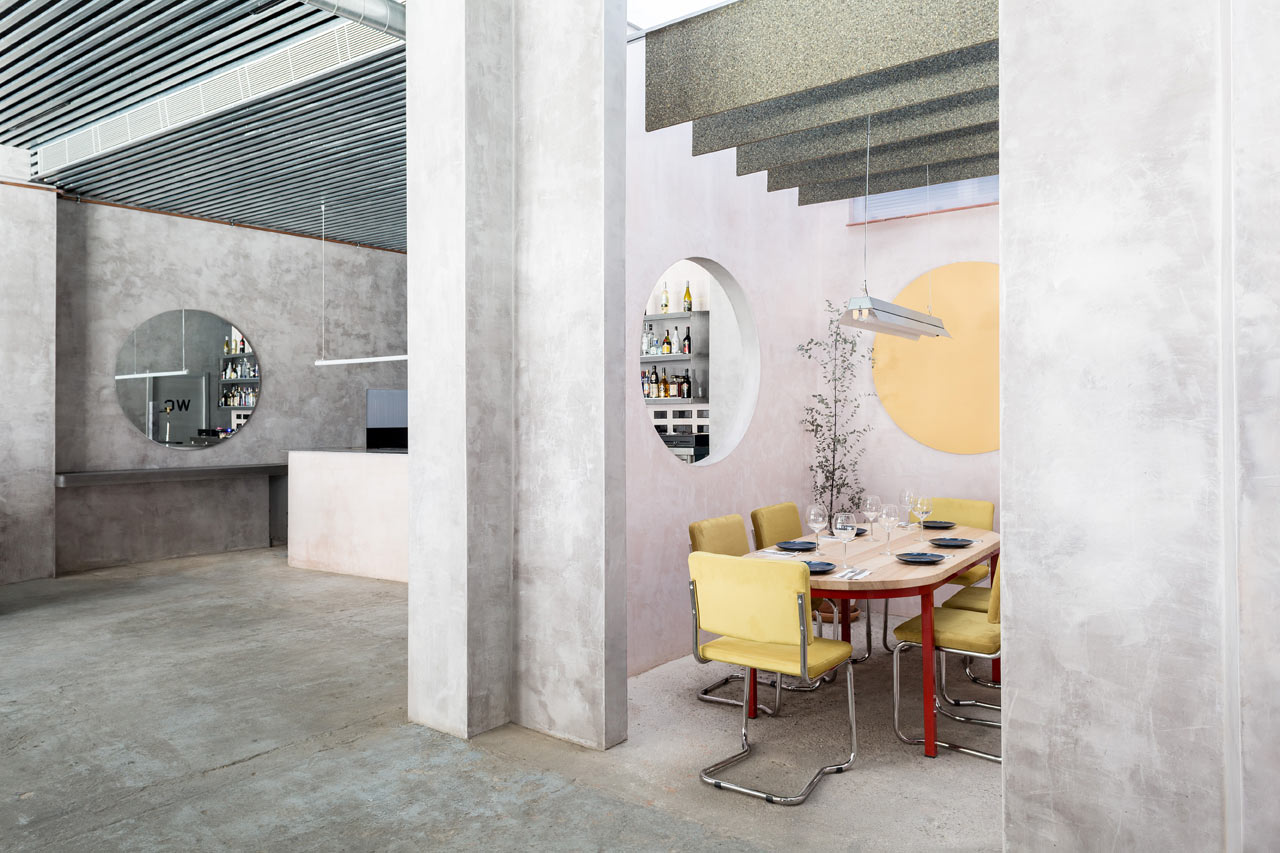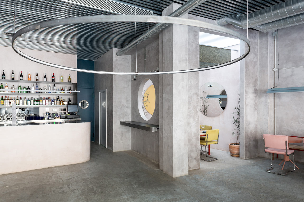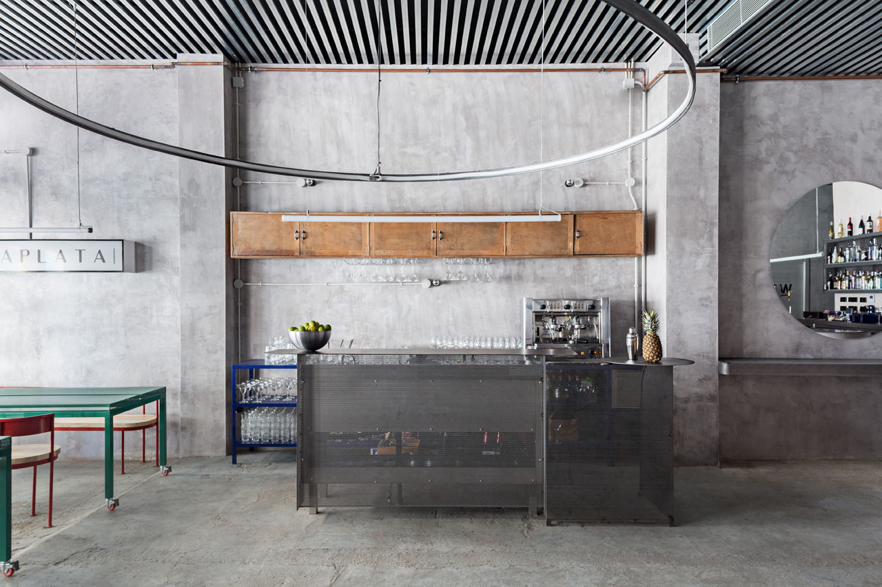 Plantas, colores y iluminación cálida aportan un aire fresco y comodidad al espacio gris.Diferentes apliques de metal perforado de colores ayudan a destacar la experiencia gastronómica de manera simple y no intrusiva. Por otra parte el círculo se usa como elemento de decoración en diferentes puntos para conectar las áreas. Las tuberías vistas, paneles de metal en el techo y una barra de bar en sinuoso cemento ayudan a continuar con el ambiente industrial.