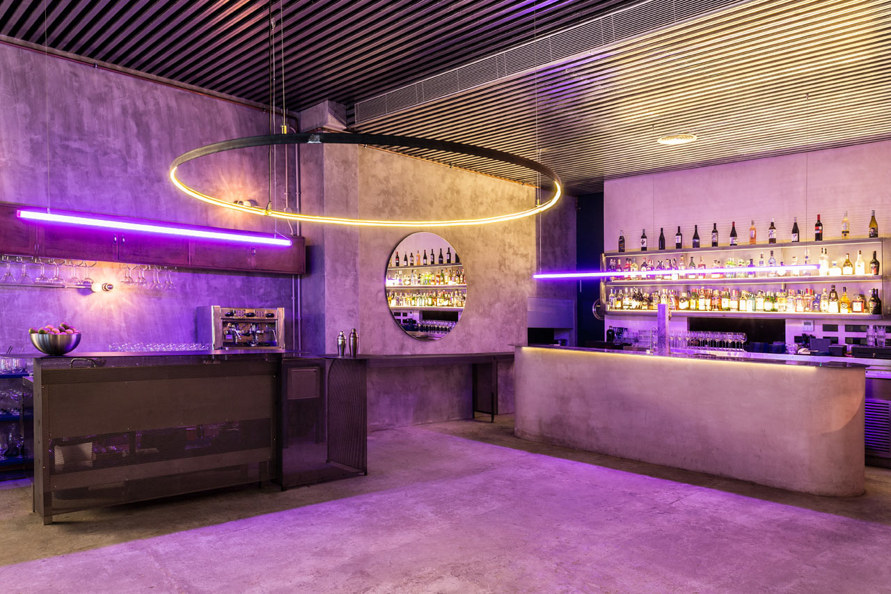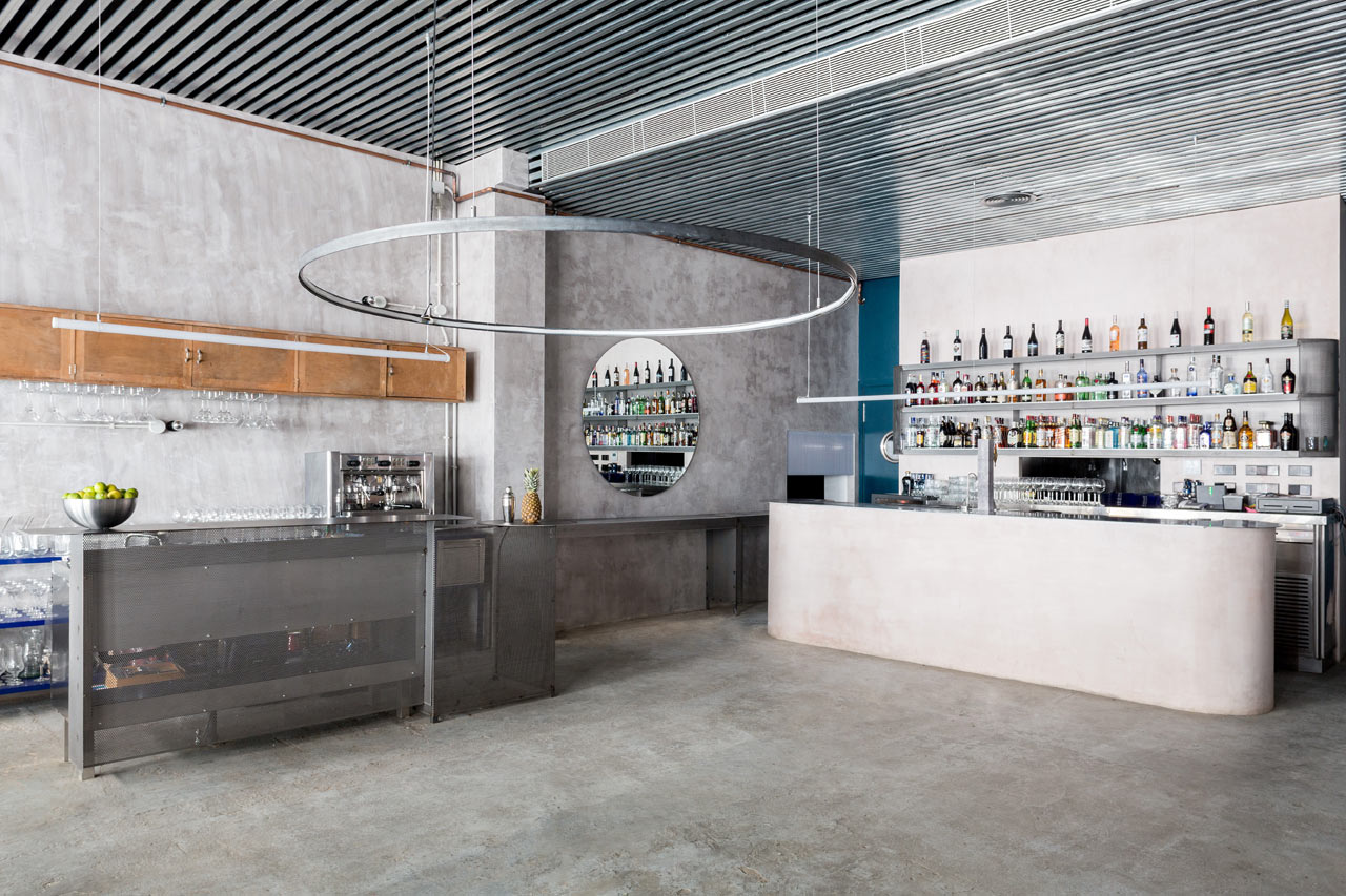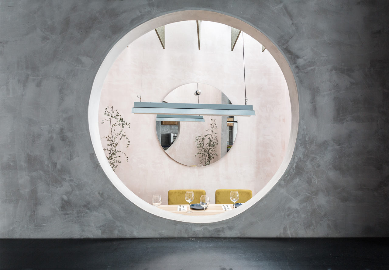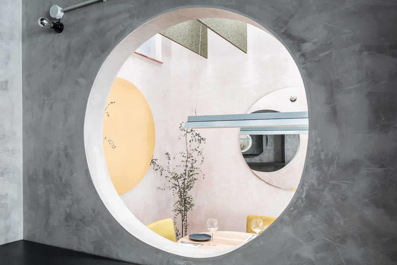 Plantas, colores y iluminación cálida aportan un aire fresco y comodidad al espacio gris.Diferentes apliques de metal perforado de colores ayudan a destacar la experiencia gastronómica de manera simple y no intrusiva. Por otra parte el círculo se usa como elemento de decoración en diferentes puntos para conectar las áreas. Las tuberías vistas, paneles de metal en el techo y una barra de bar en sinuoso cemento ayudan a continuar con el ambiente industrial.