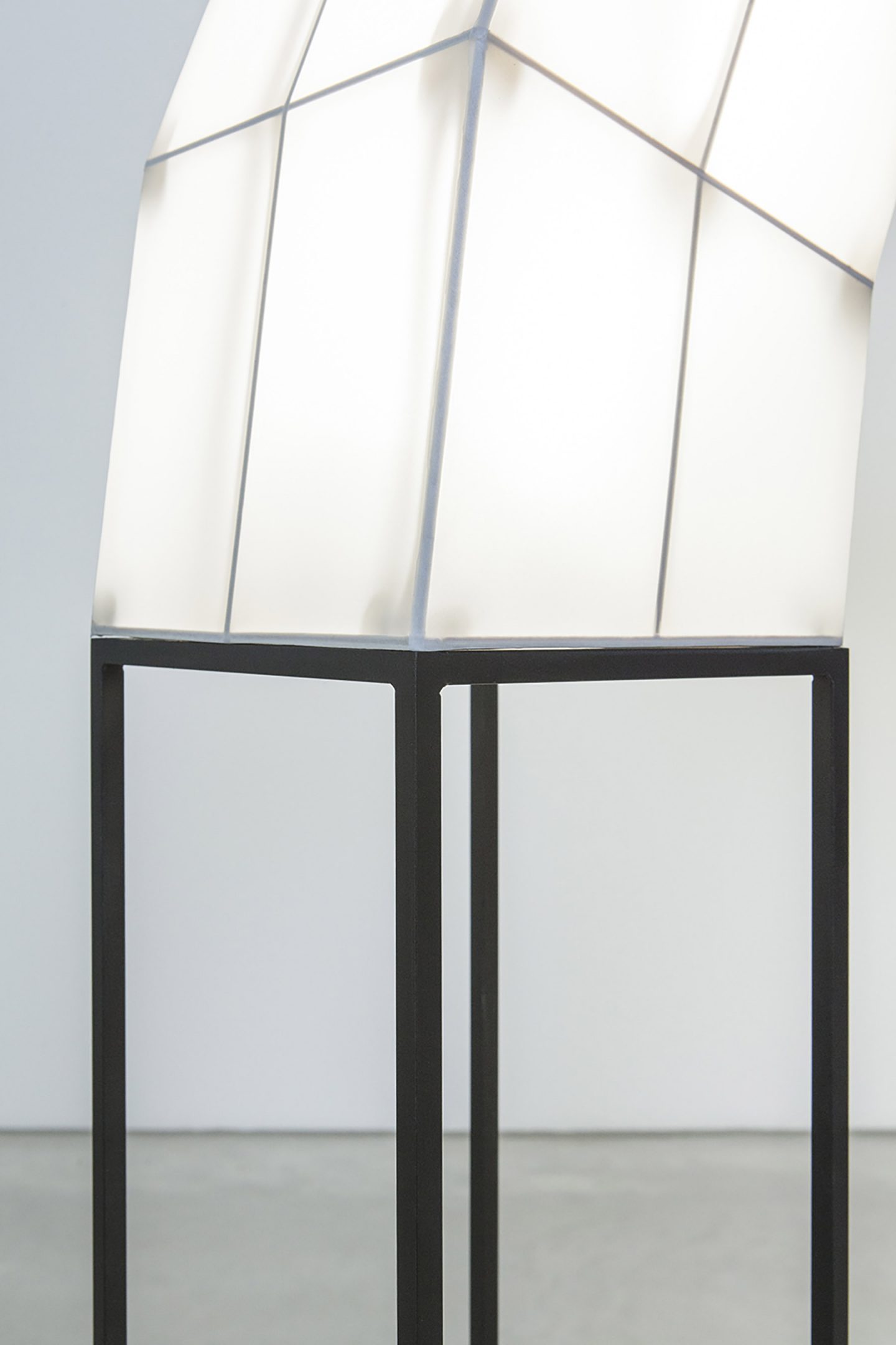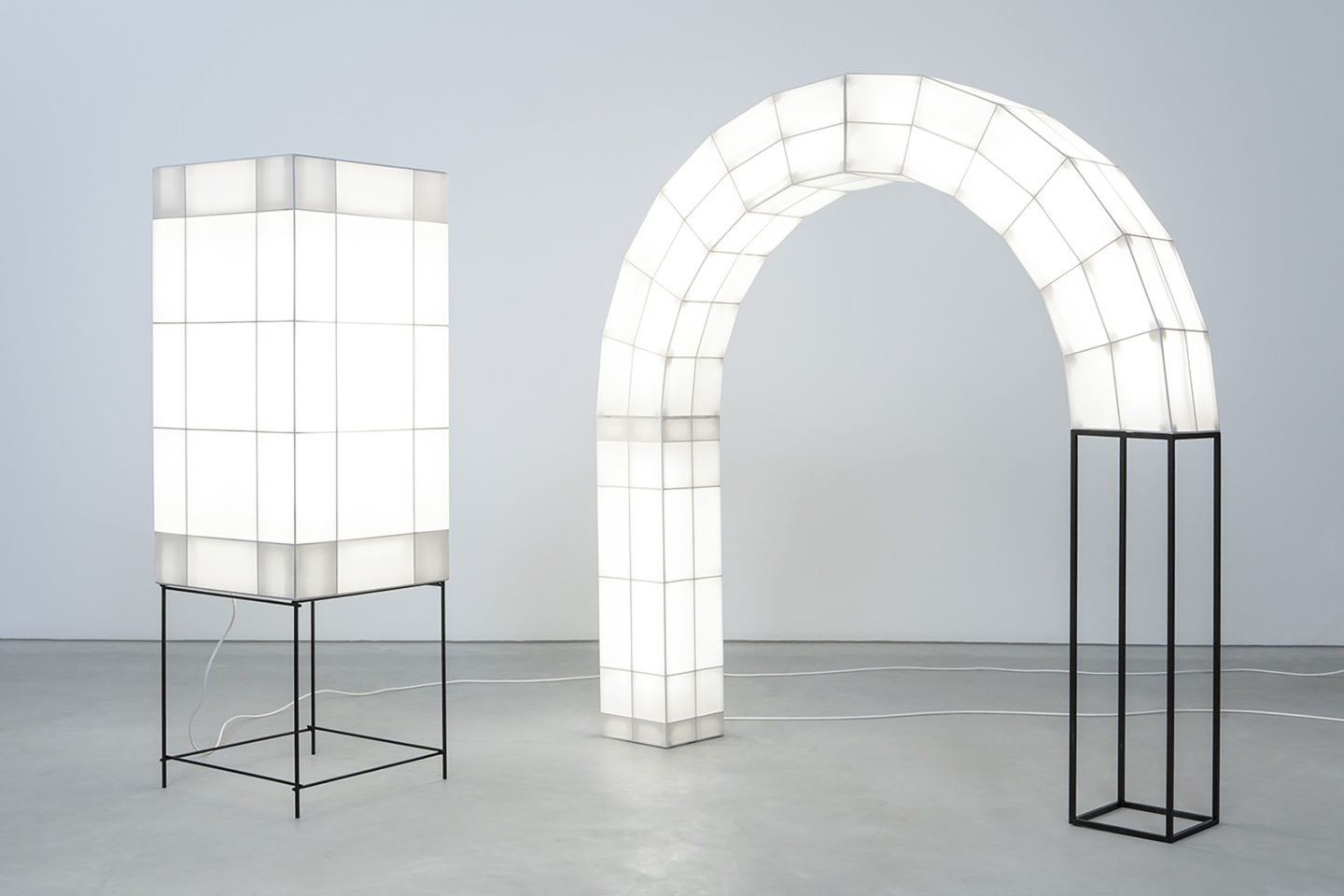 Inspirándose en la arquitectura clásica, los “marcos espaciales” son una colección de esculturas de luz que se doblan en arcos y columnas. Construidas a partir de contrachapado liviano, ensartadas con poliéster e iluminadas por LED, estas piezas son una exploración de la dualidad de la ligereza, en peso y en visión. Los “marcos espaciales”, aunque de forma escultórica, ofrecen un propósito práctico: “Al reducir los componentes y cambiar la materialidad”, explica el estudio, “los objetos surgen en un entorno doméstico o comercial, pero mantienen su carácter arquitectónico y autónomo.