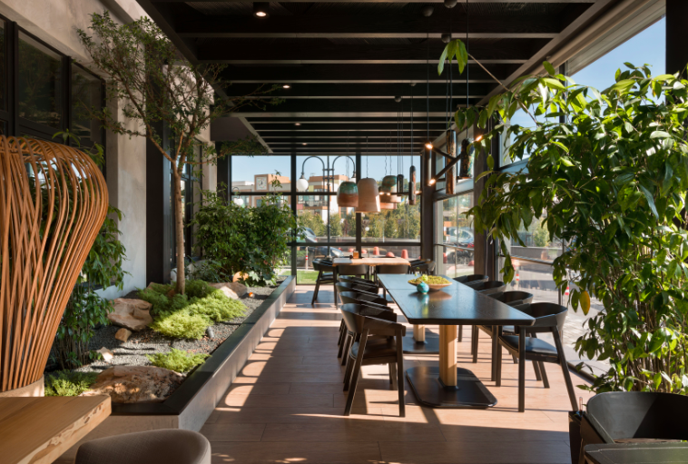 Fujiwara Yoshi es un restaurante japonés con alma ucraniana. Es un laberinto que no quieres irte. Aquí, la estética se llena de funcionalidad, las tuberías se convierten en lámparas, las flores crecen desde el techo y el musgo, desde las placas. Es un lugar para descansar los ojos, contener la respiración y saborear Japón.