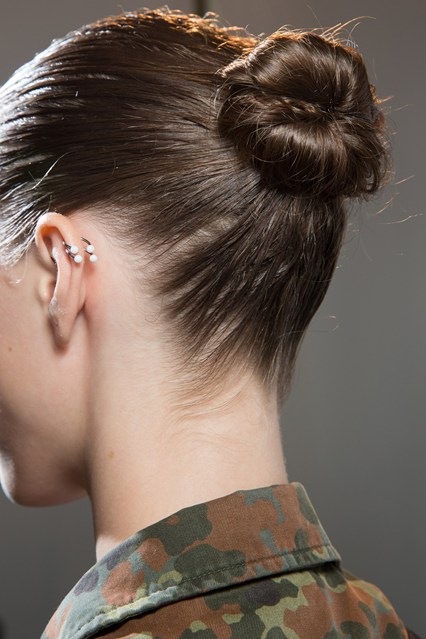 En materia de recogidos, la tendencia sigue la misma línea: ponytails o trenzas deshechas, flojas e informales, como las que mostró Zac Posen, y top knots bajos y con una terminación estrella: el efecto mojado. J Mendel, Marchesa, Paul Smith, Vivienne Westwood, Jason Wu fueron algunos que mostraron que el efecto wet es el gran elegido para darle una impronta moderna y futurista al pelo.