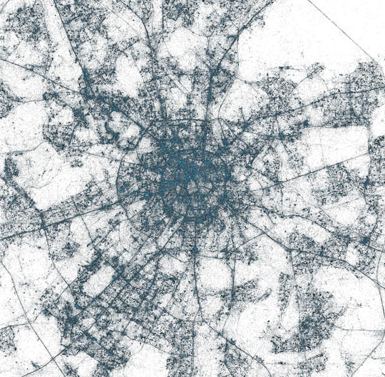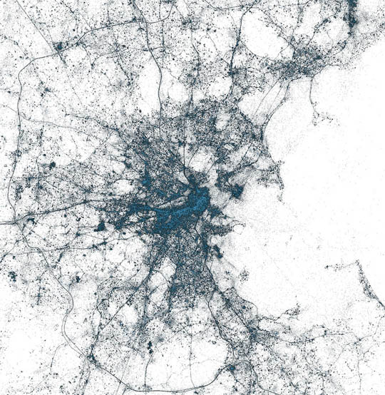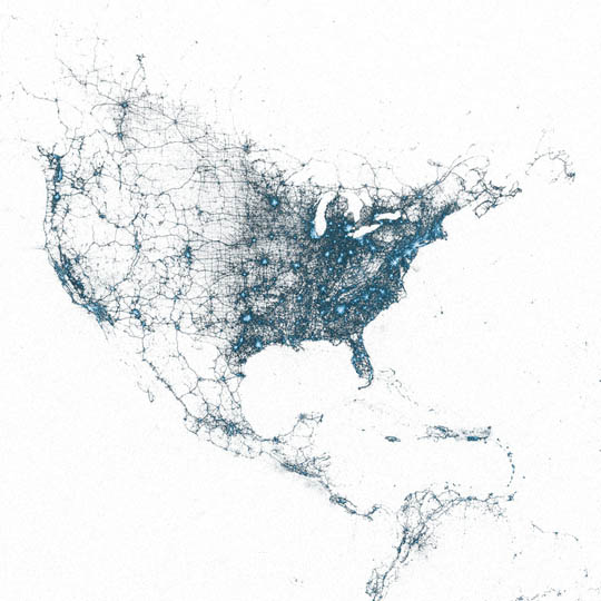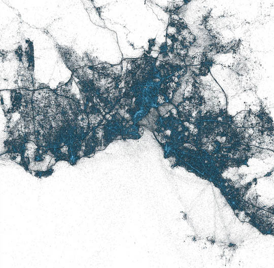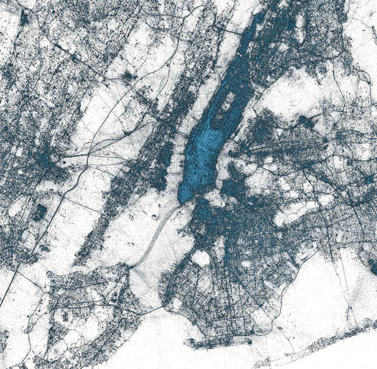 Estas imágenes sacadas con un satélite, representadas con millones de puntos, en donde cada punto es un tweet.
