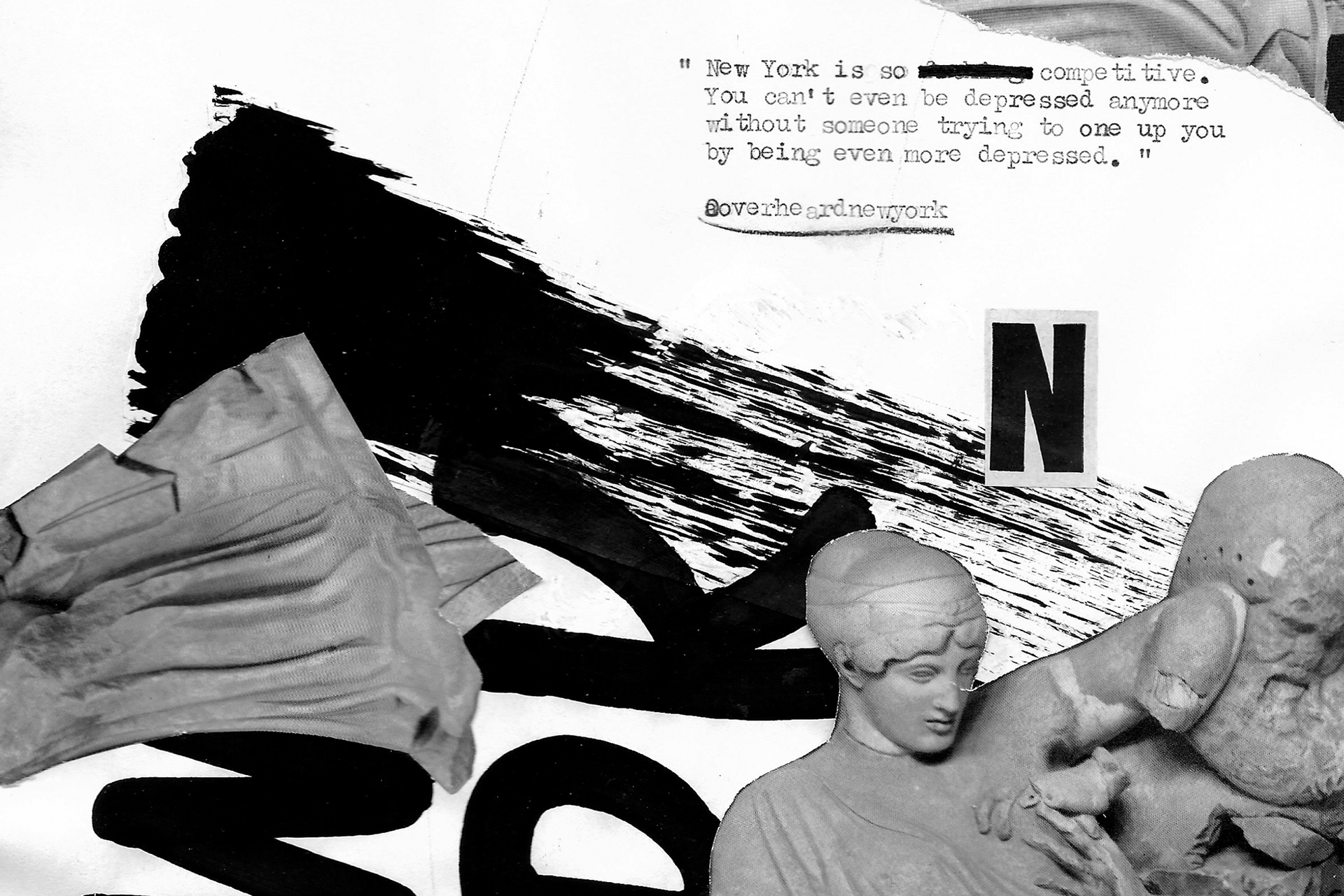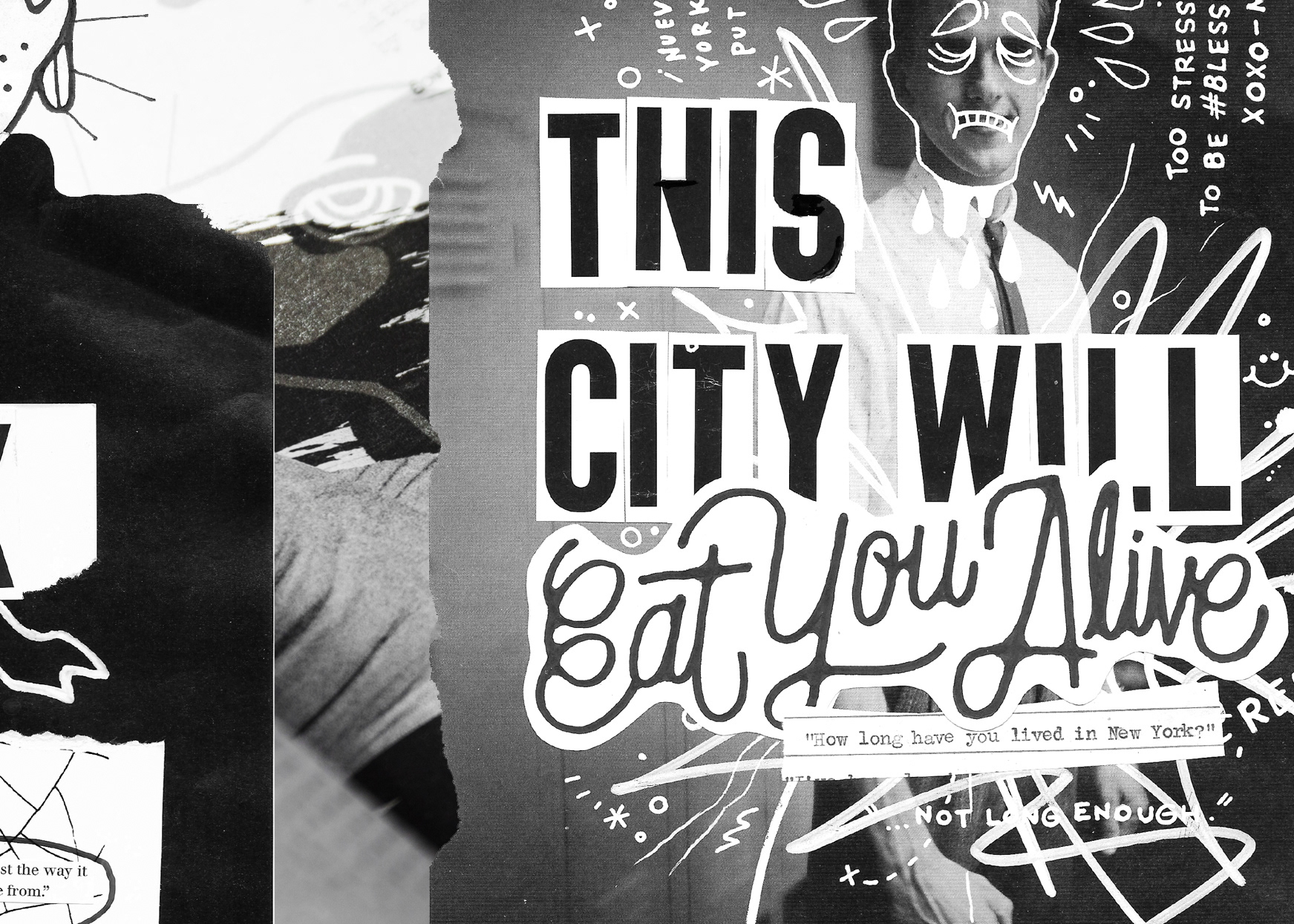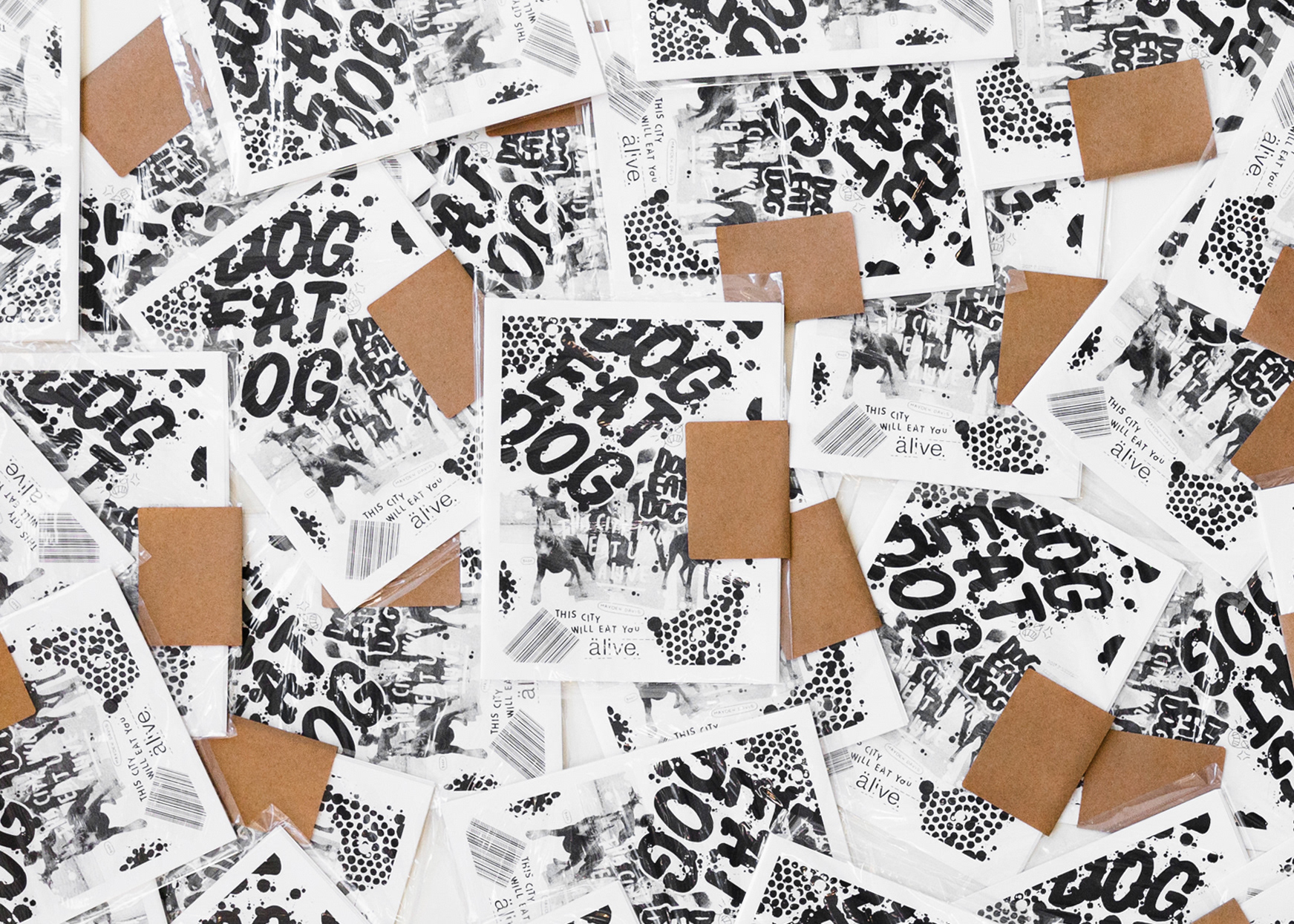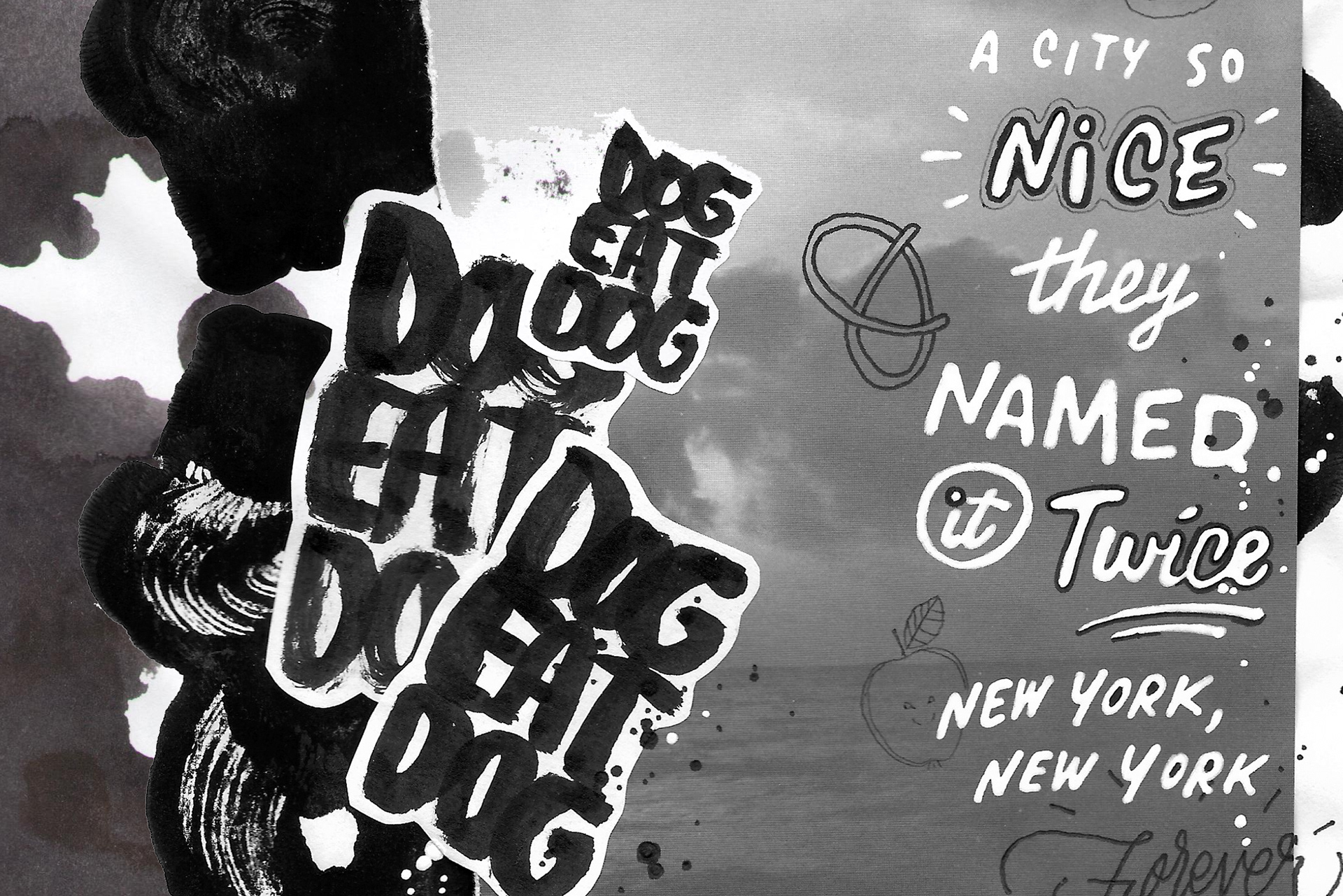 Este 8.5 “X11”, una página impresa en risógrafo de 32 páginas, Dog Eat Dog, comenzó cuando mi hermano pequeño vino a la ciudad de Nueva York para una pasantía de verano. Su disgusto inicial por Nueva York y su atmósfera abrasivamente competitiva generaron el tema de esta revista. Desatado e impreso en papel de periódico como el New York Times, estos grabados de collage celebran lo bueno, lo malo y lo feo de una ciudad tan agradable que la nombraron dos veces; Nueva York, NY.