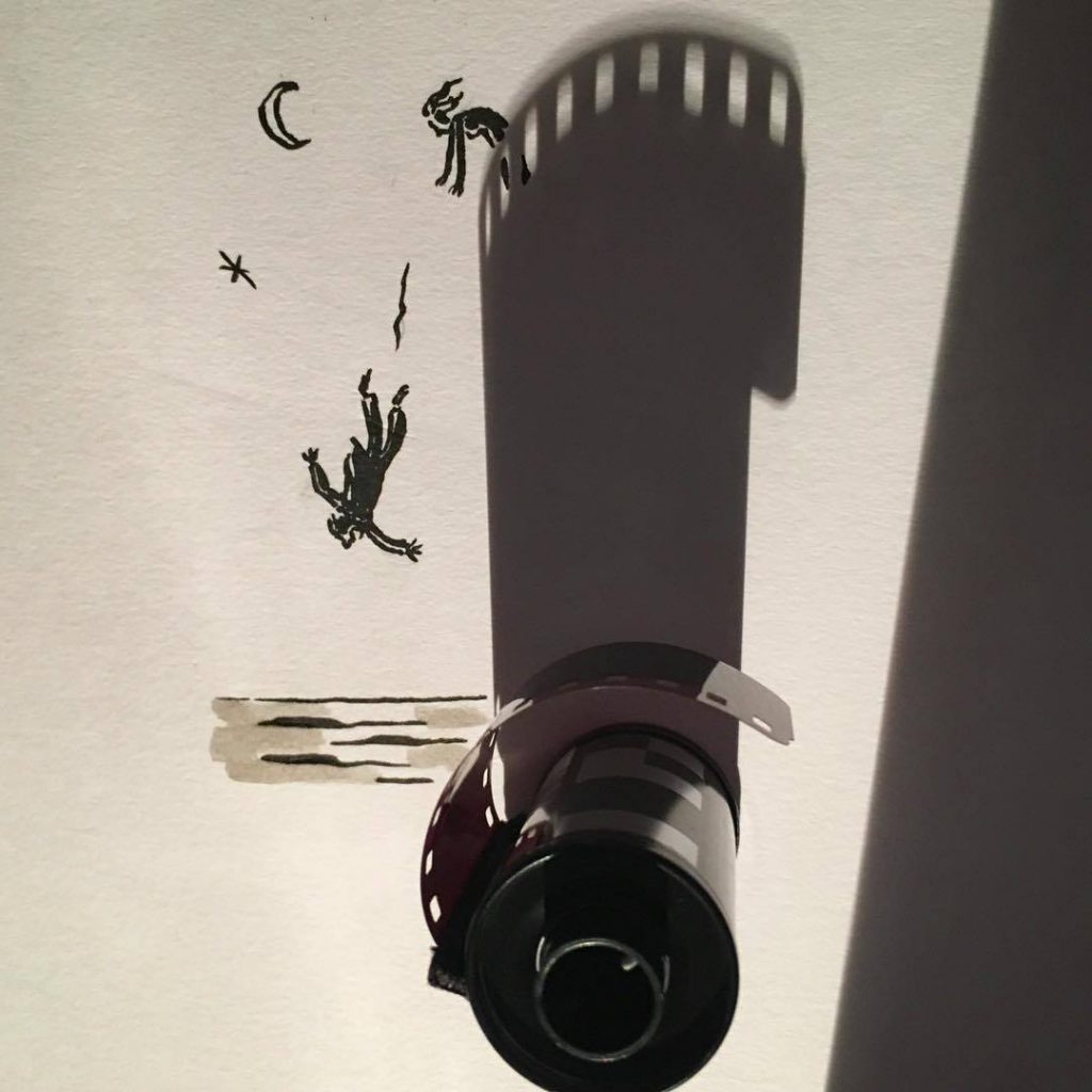Algo parecido es lo que hace el ilustrador y filmmaker belga Vincent Bal, que tuvo la excelente idea de jugar con la sombra de una serie de objetos cotidianos para hacer sus dibujos. Es así como un pato de hule se convierte en un ladrón, una cámara de fotos le da la forma al cuerpo de un fotógrafo e incluso la sombra coloreada de un vaso azul se transforma en el mar.