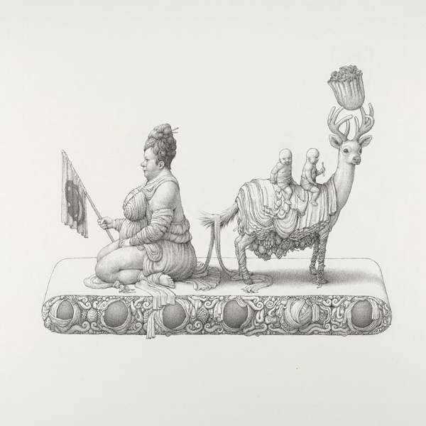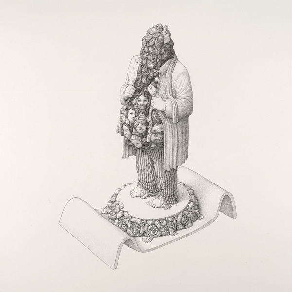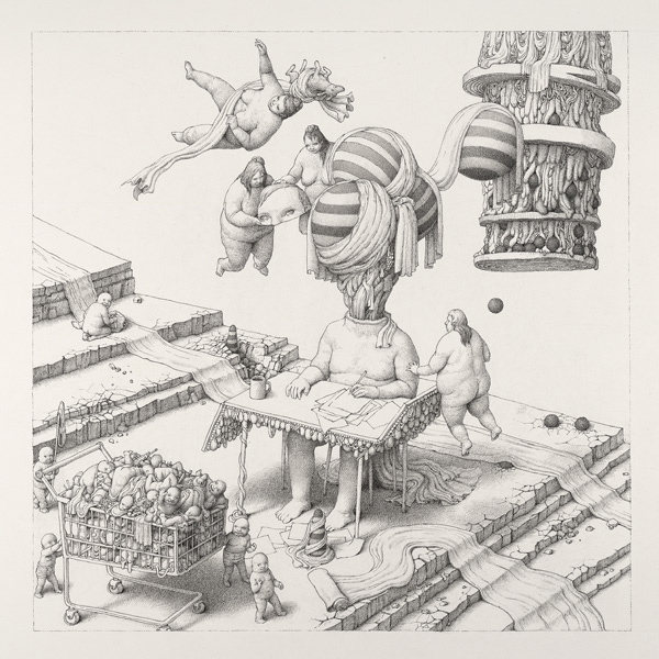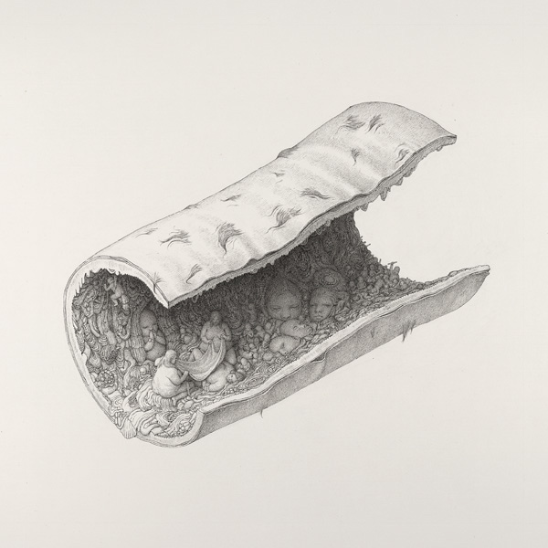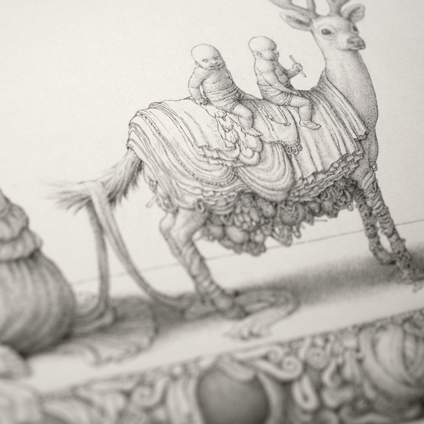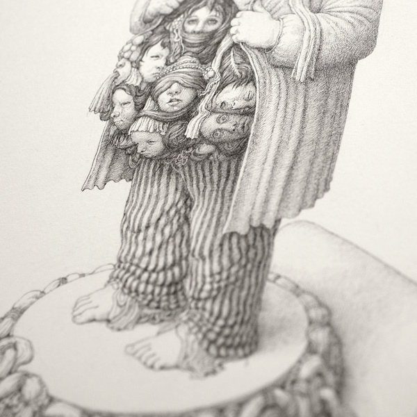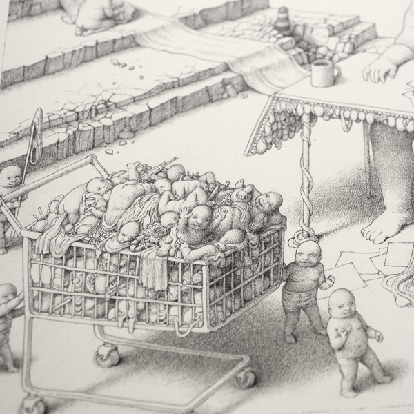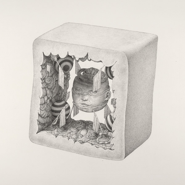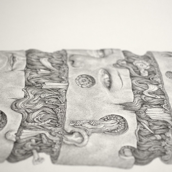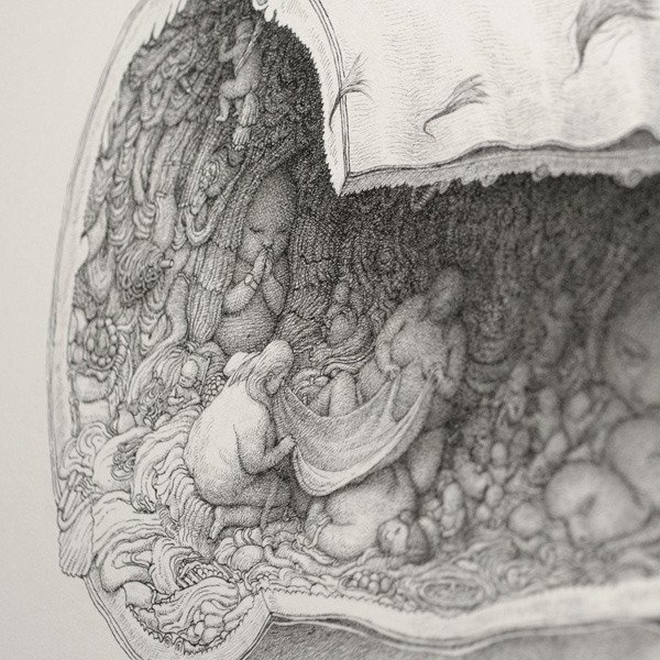 En su trabajo nos encontramos con una exploración entre el interior y lo de afuera, con recursos algo grotescos, criaturas rubenescas y cierta fijación por las cabezas. Las sombras las genera con finísimas líneas y puntos que generan, a su vez, tramas y texturas en los dibujos.