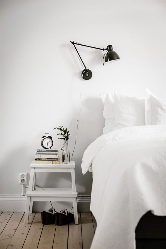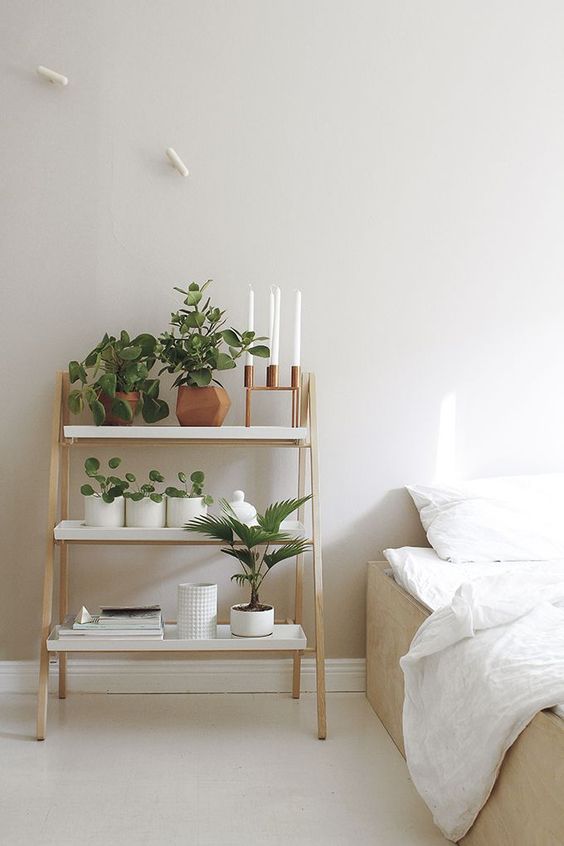 Somos fanáticos de usar escaleras como muebles (para muestra, basta un link). Una escalera pequeña, con tablas en los peldaños, puede ser una mesa de luz idea.