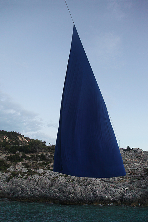 Entrelazado con la topografía y el clima diario, muestra una secuencia de vistas a lo largo del día. Por la mañana, un campo cuadrado azul se levita sobre la bahía. El viento sube alrededor del mediodía y levanta el tejido hasta una posición horizontal donde está flotando hasta la tarde. Por la noche, los vientos son calmantes y te enfrentas a una plaza oscura y en movimiento.