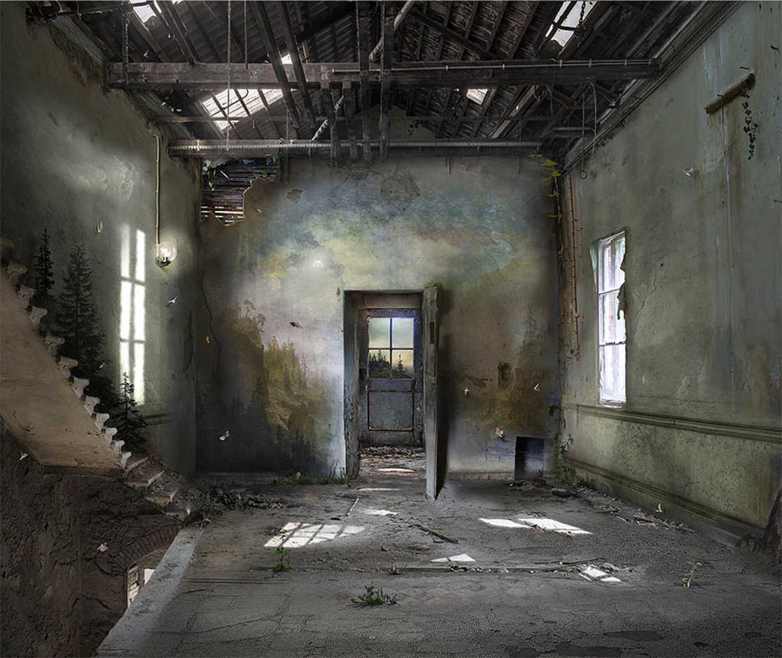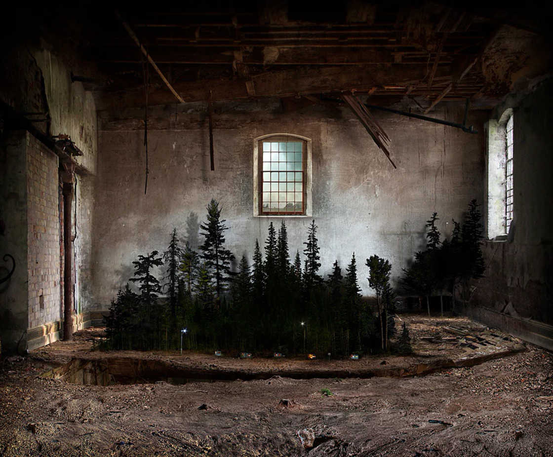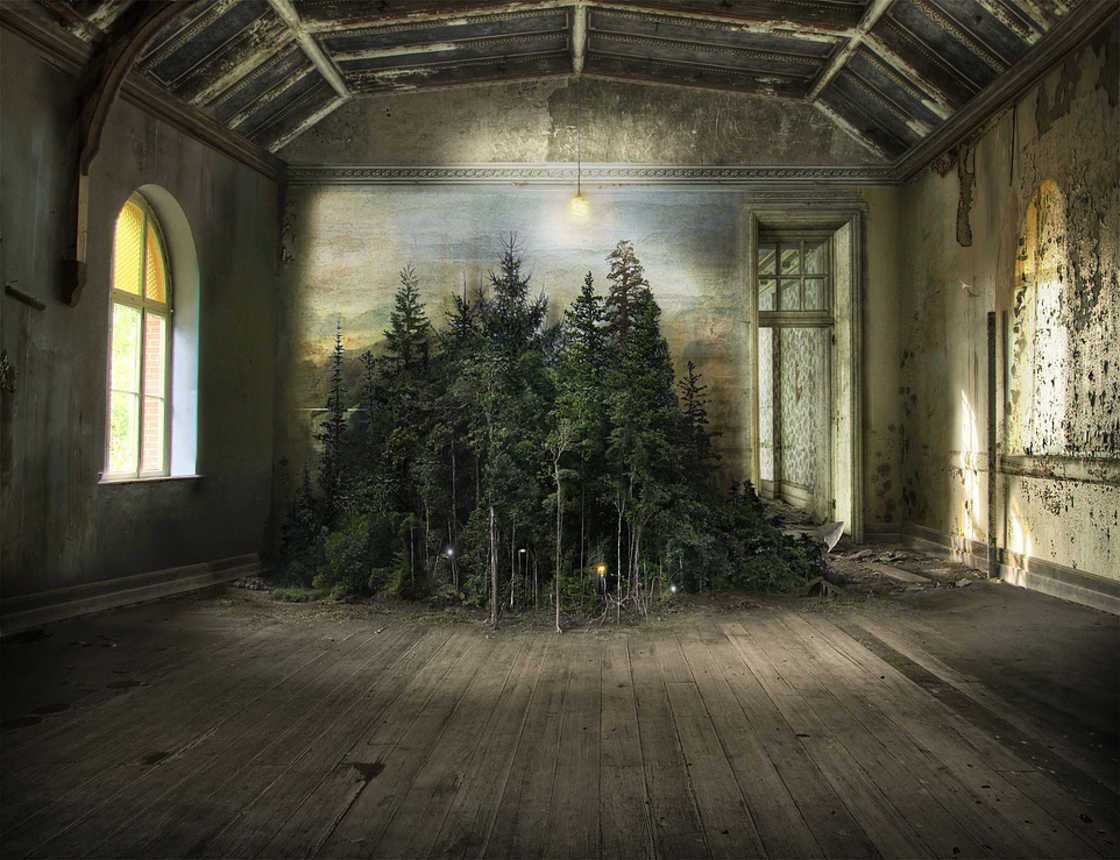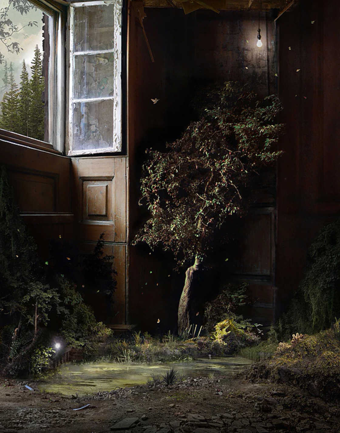 Con una mezcla de matte painting, collage y retoque digital, la artista británica Suzanne Moxhay invita a la naturaleza a lugares abandonados. Bosques, lagunas, una mezcla de arbolitos con musgo y una buena pizca de surrealismo resulta en una serie encantadora.