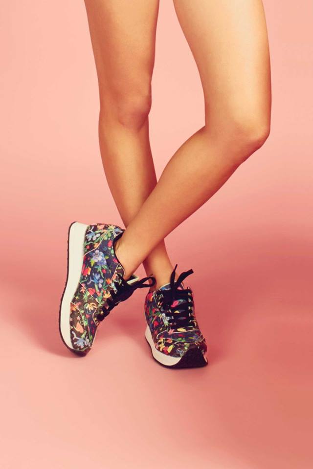 Además, bajo el concepto urbano-deportivo la marca lanza su propia línea de zapatillas retro running, estampadas con flores o en bloques de color.