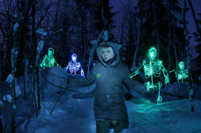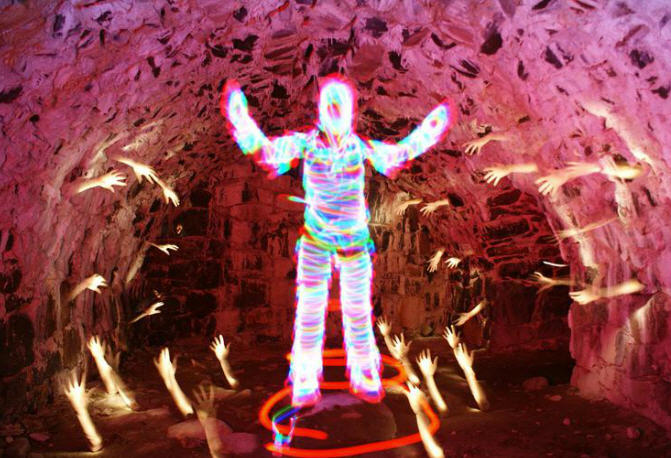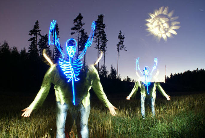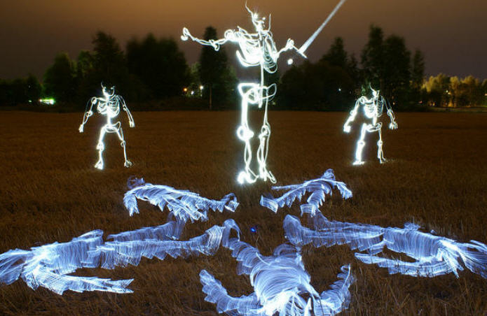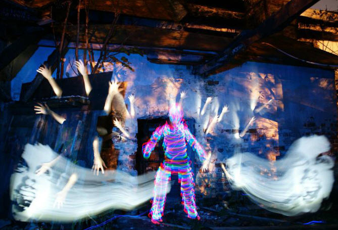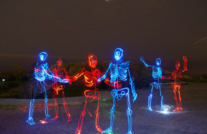 Utilizando una exposición prolongada y luces de diferentes colores, esqueletos y fantasmas son lo que mejor le sale hacer.