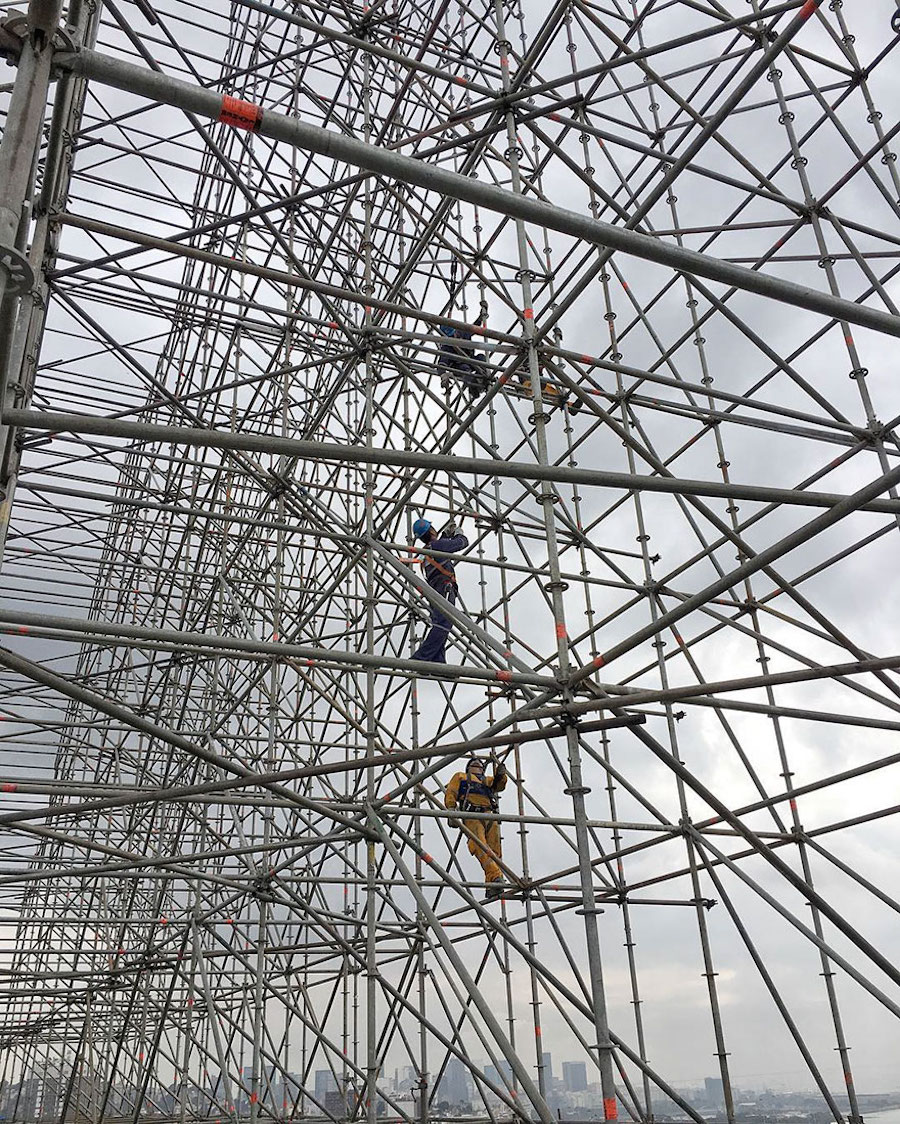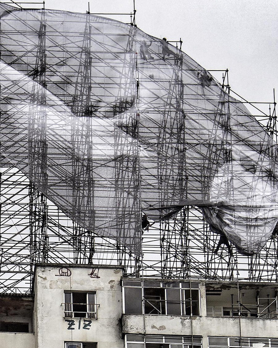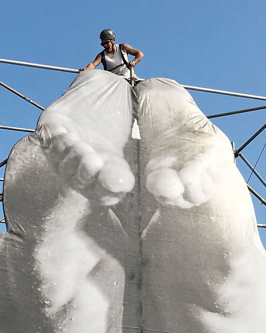 Si bien el concepto es el mismo que suele interpretar, con fotos en proporciones gigantes, la técnica que usó para realizarla esta vez es nueva para el artista, con andamios gigantes y telas impresas en vez de los típicos afiches de papel con los que suele manejarse.