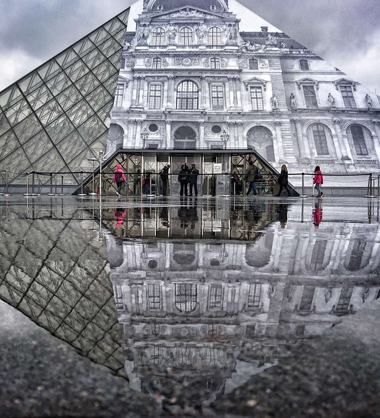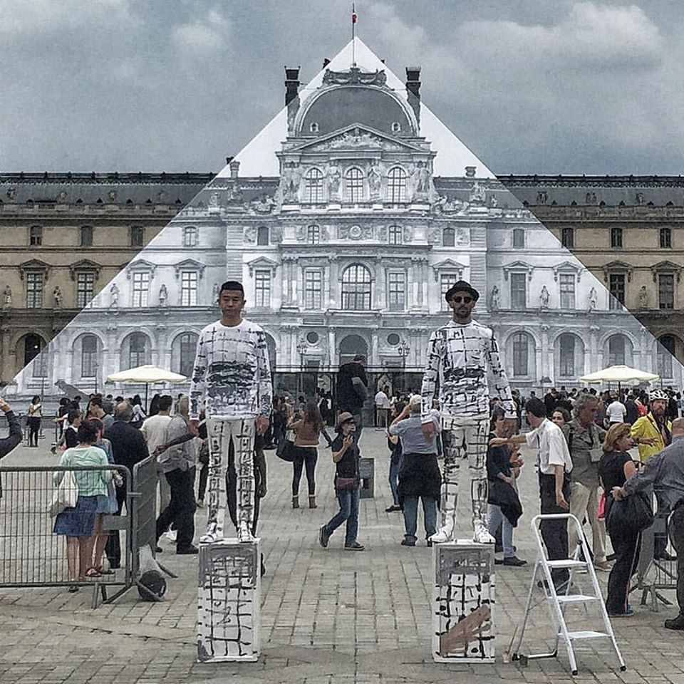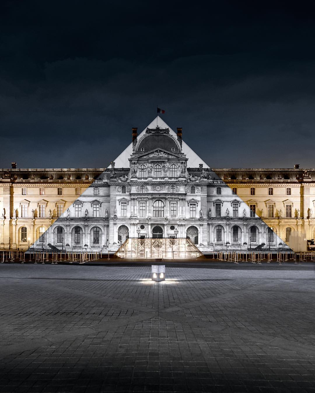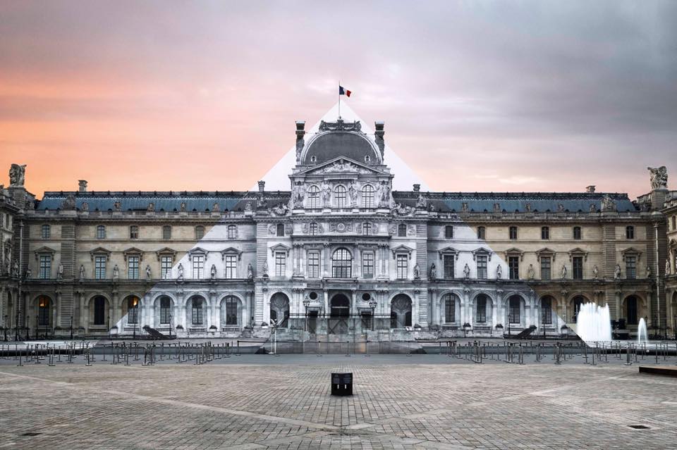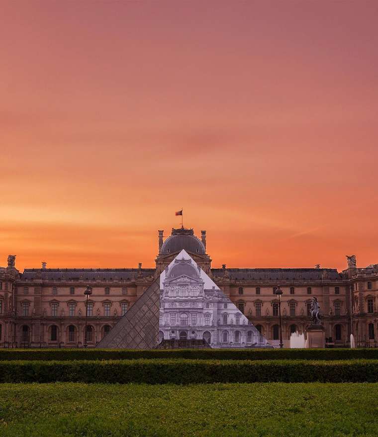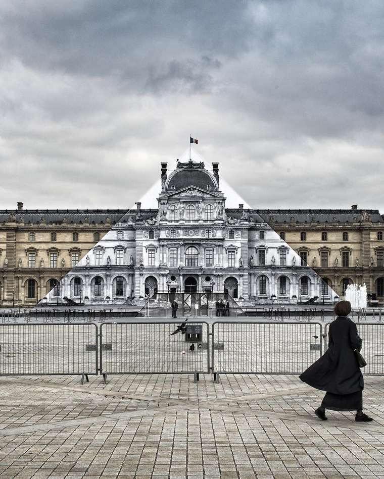 Algo tan inimaginable como eliminar un ícono de la cultura mundial como la pirámide del Louvre fue precisamente lo que se le ocurrió al artista francés JR (previamente), que utilizando un collage de dimensiones monumentales logró cubrir completamente la histórica fachada, haciéndola “desaparecer” por un día.