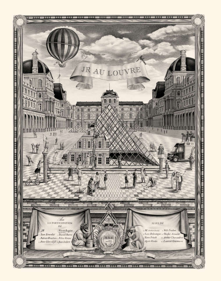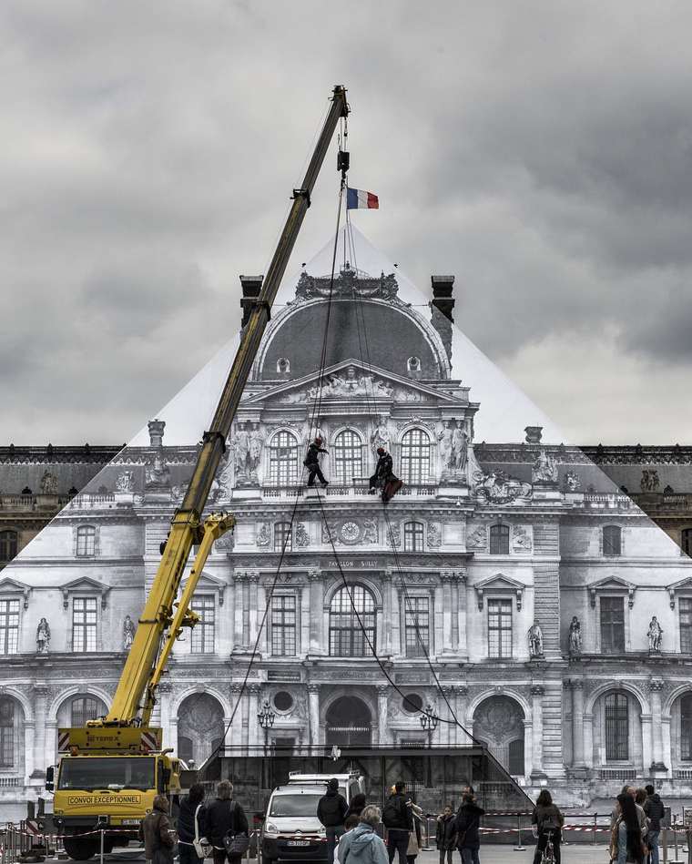 Este nuevo proyecto en el corazón de París fue parte del evento “JR au Louvre”, en el que el museo le encargó al artista que durante 24 horas realizara diferentes actividades, como entrevistas, workshops abiertos al público, desarrollo de films, degustaciones de comida frente a la Victoria de Samotracia entre otras.
