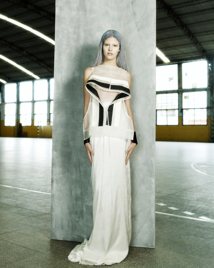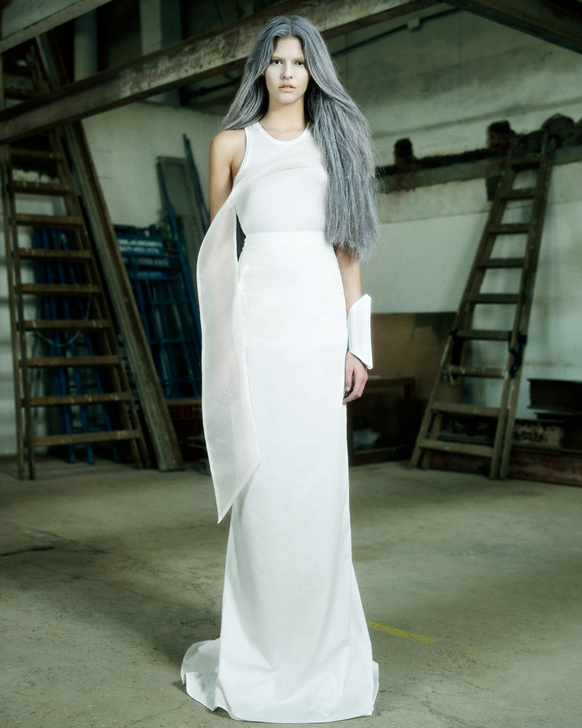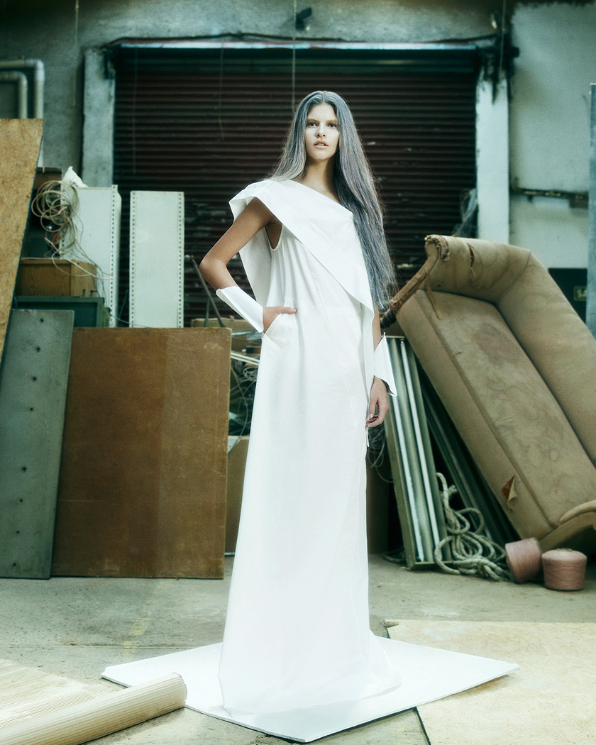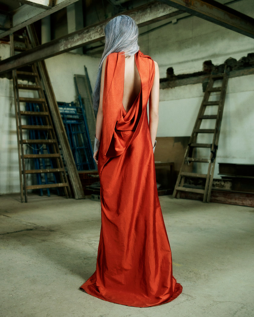 Son los vestidos el plato fuerte de la nueva colección, que se ciñen al torso y acompañan la figura con una sencillez y belleza insuperables. Cortando el aliento, los géneros caen libres hasta el suelo, donde se agrupan a los pies como delicados estanques de seda.