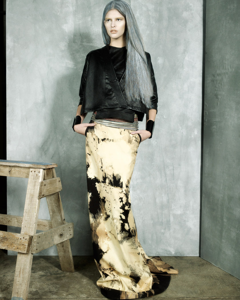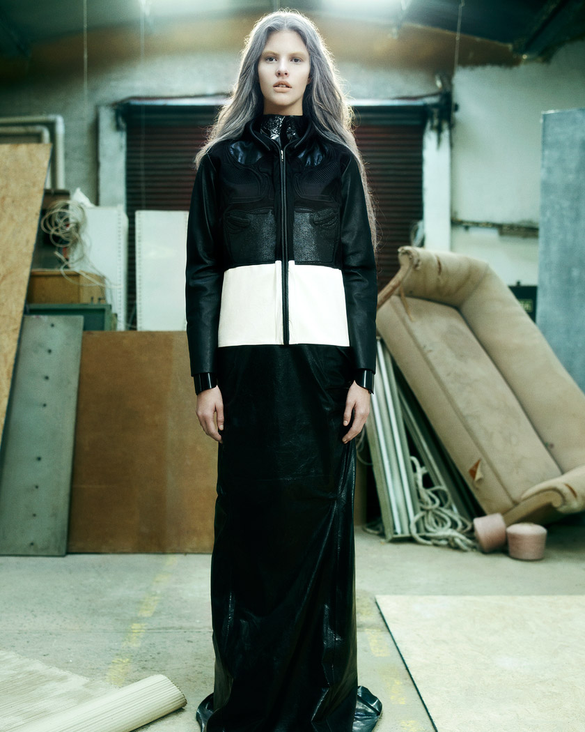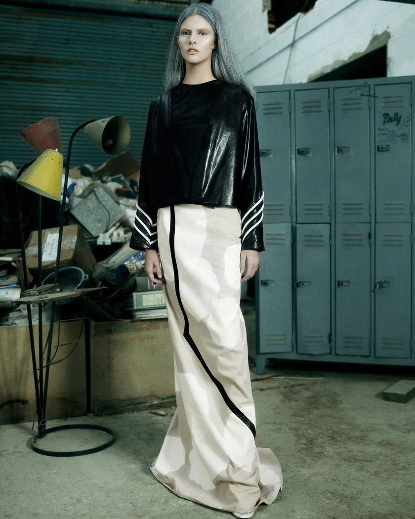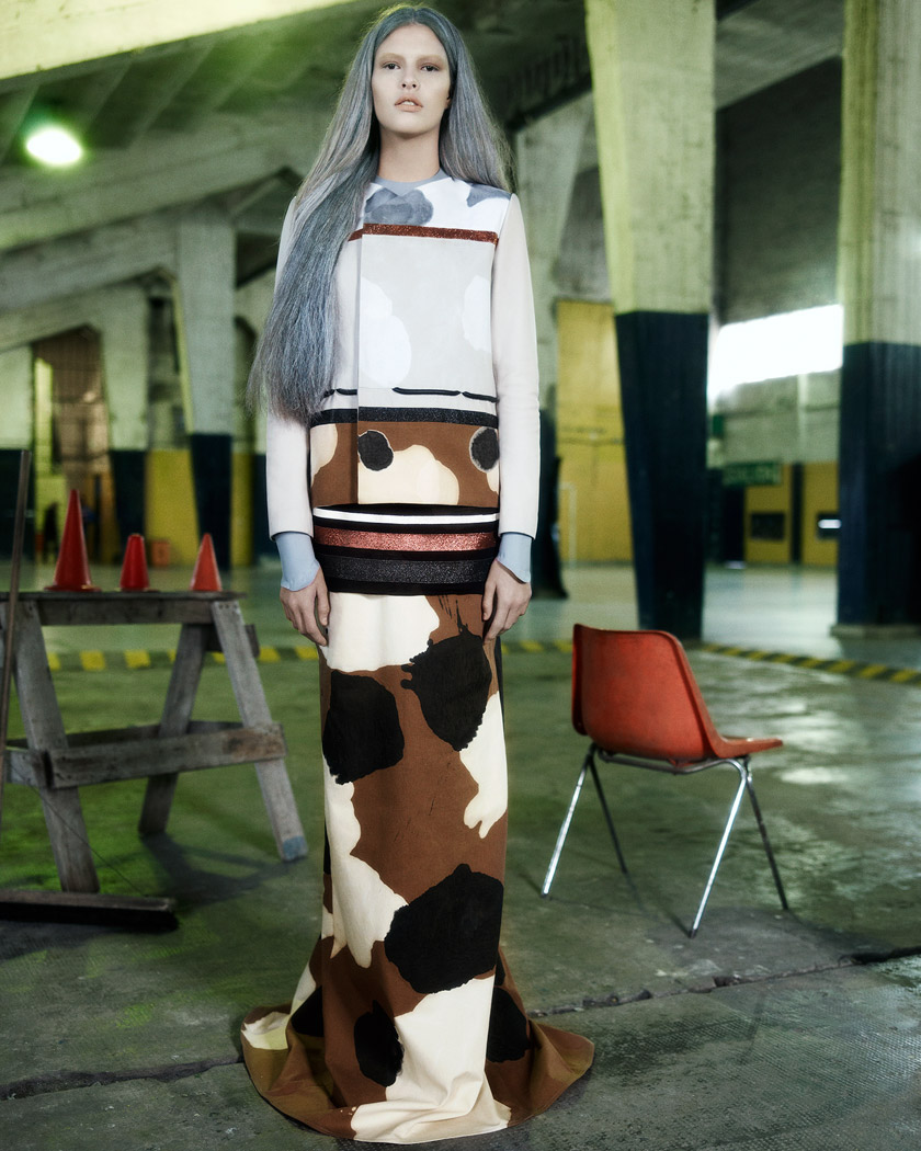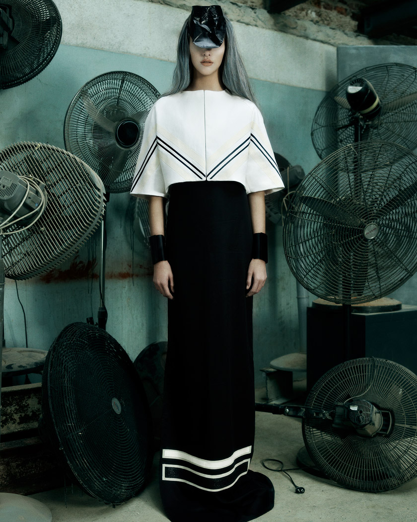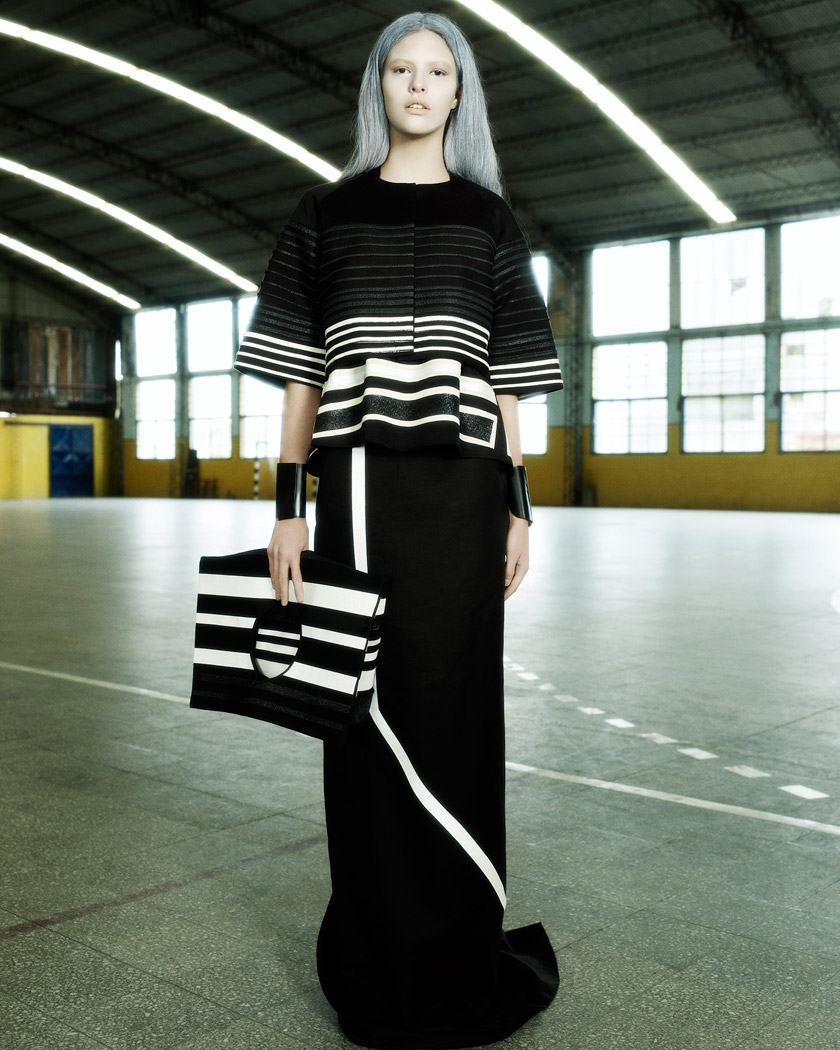 Es esta línea la que se recupera y sintetiza en estampas, el blanco y el negro dibujando tramas horizontales, en zig zag y con diferentes grosores y complementándose con paneles de transparencias, fieles tanto al op art como a las tendencias de la temporada.