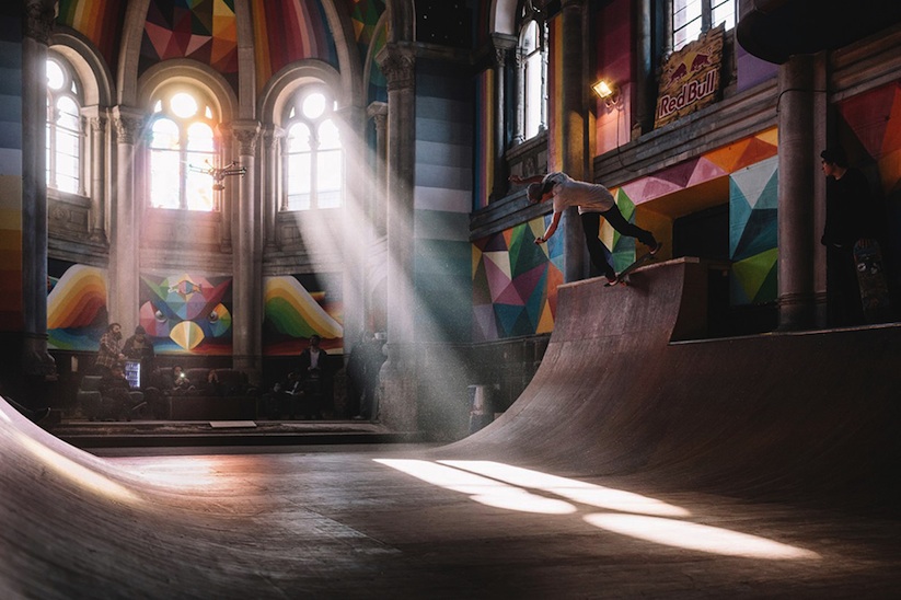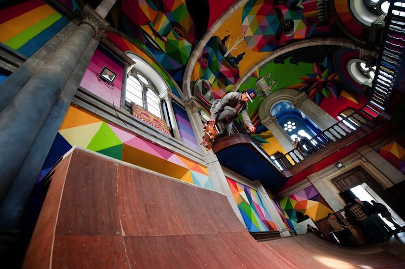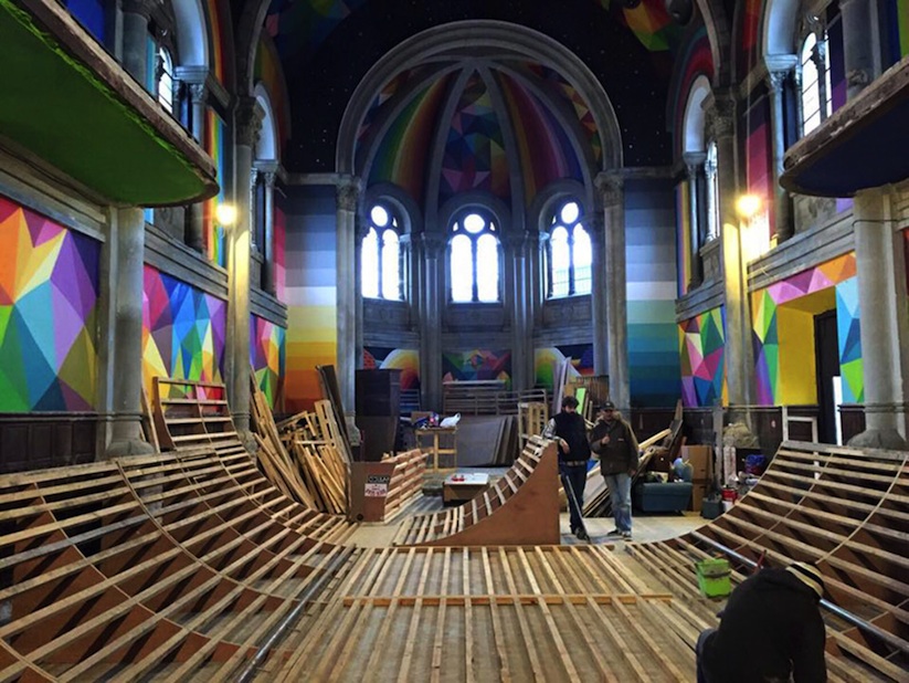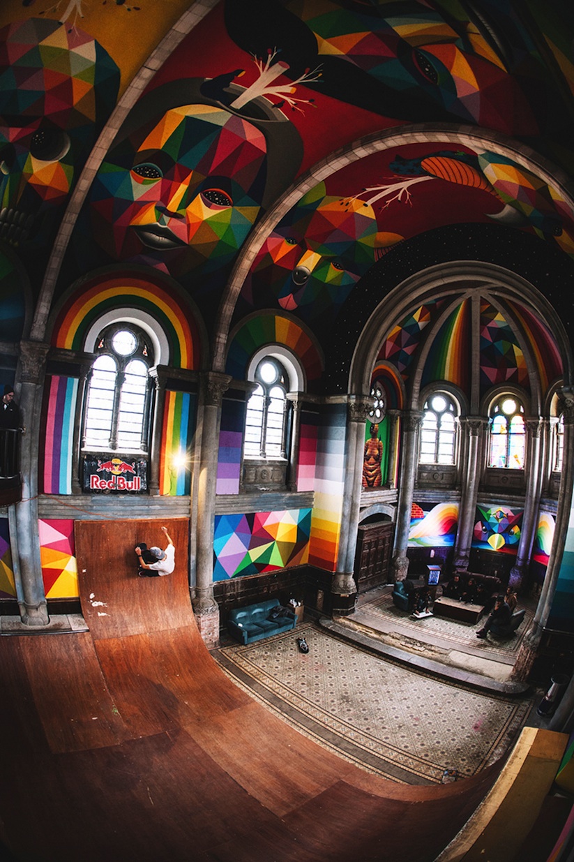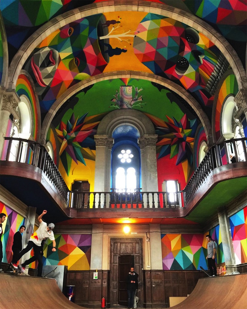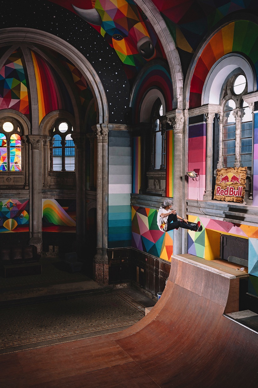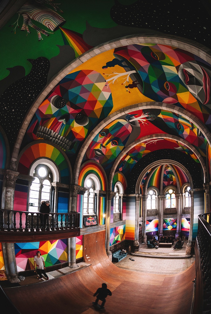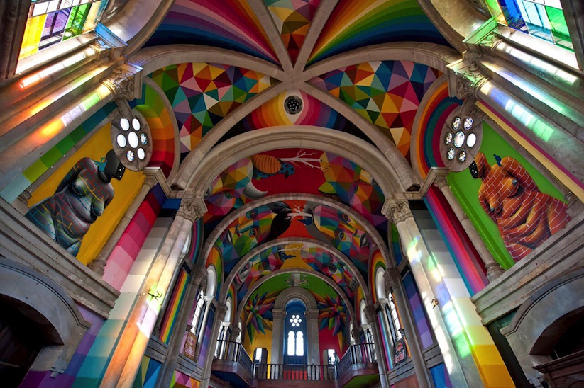 Okuda contó con la ayuda de Red Bull para llenar esta iglesia con sus pinturas brillantes y llenas de colores.