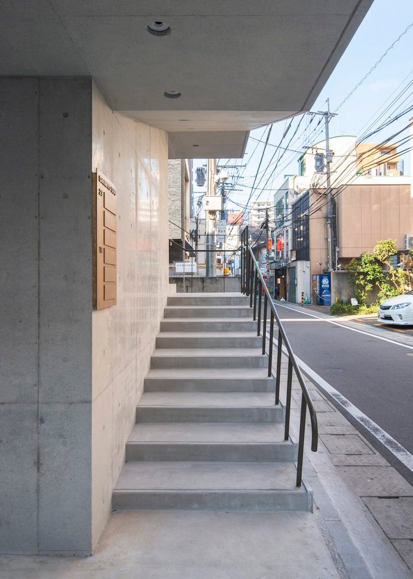 Basándose en su experiencia con el diseño comercial, Case-Real ha diseñado un volumen que se encuentra en el nivel del suelo para crear una zona de amortiguamiento que separa el callejón del edificio y para evitar el contacto directo desde la calle hasta la entrada. La circulación exterior se ha “esculpido” de la estructura compacta, creando una silueta distinta, mientras que el enfoque creado por el retroceso continúa hacia la escalera que conecta el piso superior. el edificio de alquiler se construye sobre la base de una estructura de marco, pero al tener todos sus pilares encerrados en la profundidad de sus paredes.