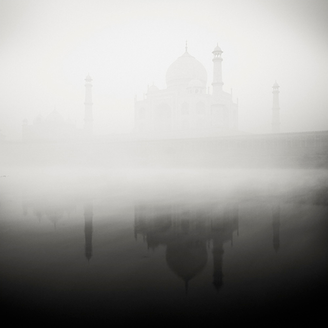 El ambiente refleja una soledad espiritual y un sentido de misterio con el Taj Mahal, que aparece como una sombra detrás de la niebla o la silueta de un elefante que impacta sobre el agua.