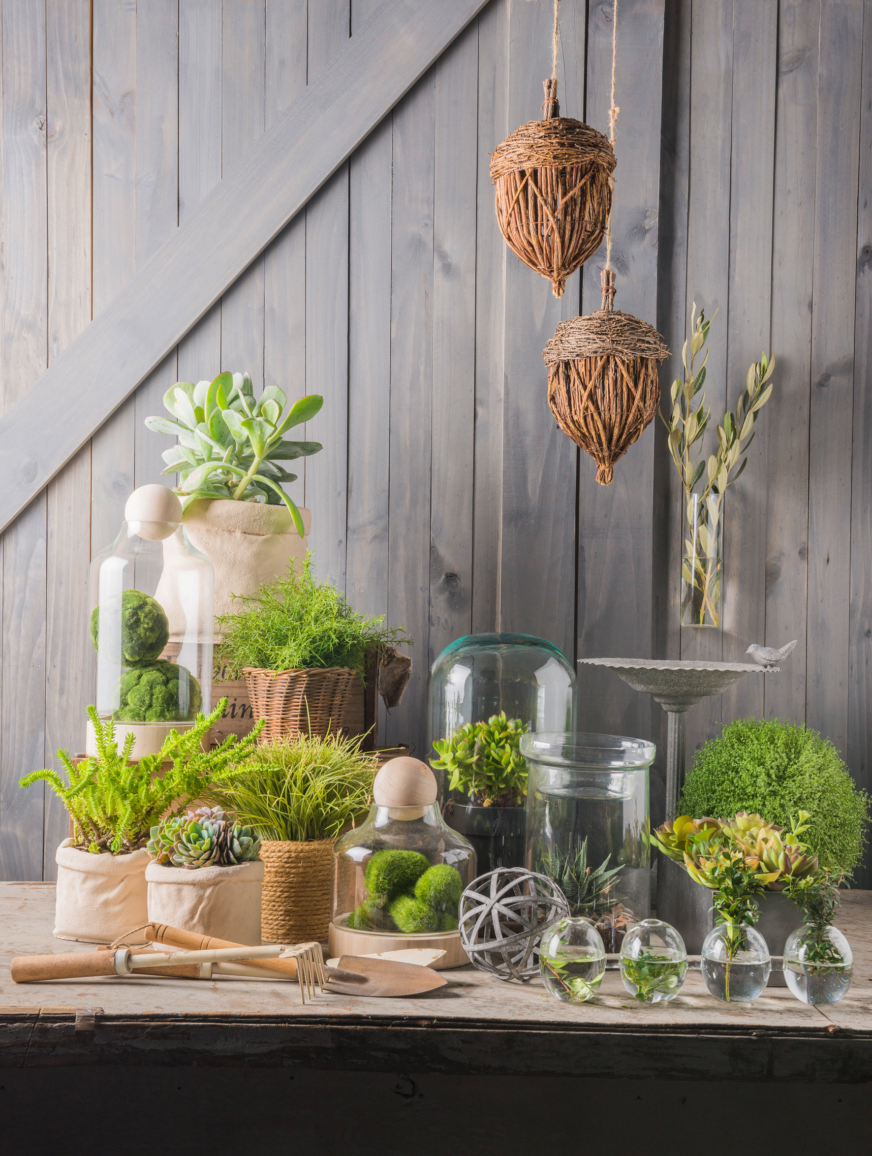 La primera nos propone realizar en casa nuestra propia huerta con impronta urbana, utilizando terrarios y macetas de diferentes formas, contenedores de hierbas en vidrio y pizarras para escribir con tiza. La paleta es verde lima, manzana, colorada, turquesa y marrón, complementada con crudo y realzada con objetos en zinc, yute y vidrio. Muebles armados a partir de pallets de madera, e intervenidos con pintura y detalles a mano completan la línea y acentúan la simpleza de los espacios.