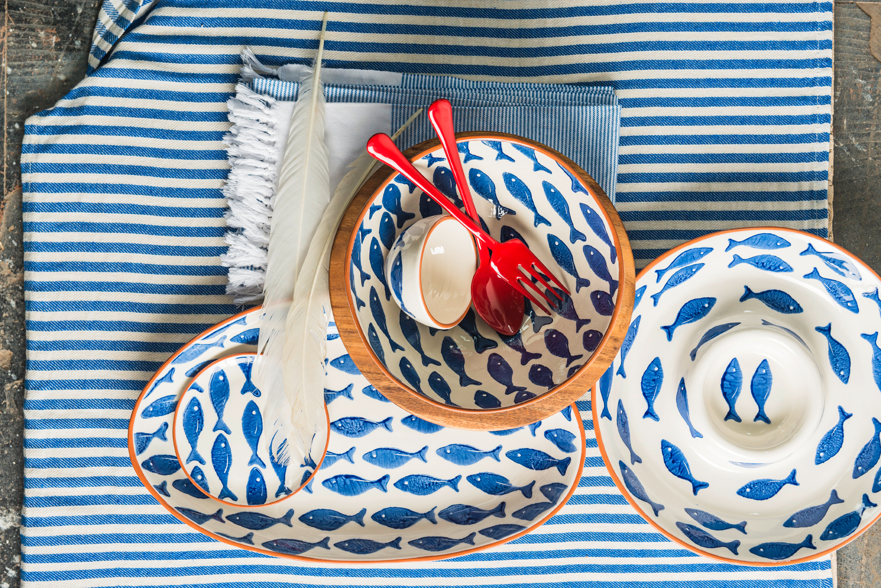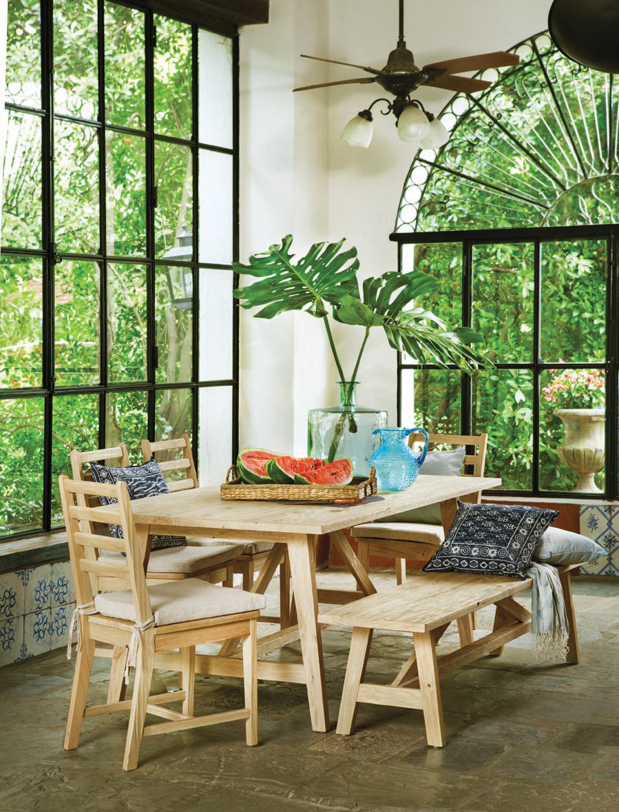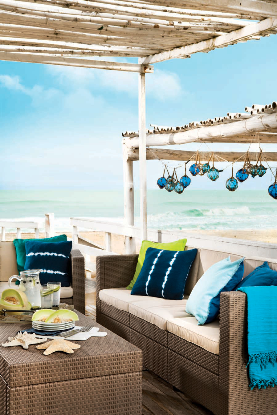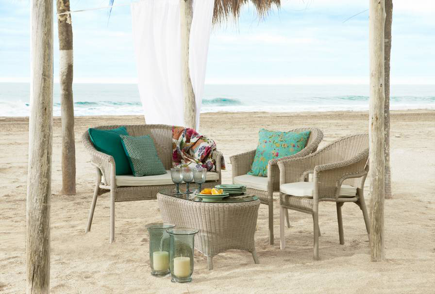 Por su parte, Under the Sea nos traslada al mediterráneo con su paleta que combina el blanco y crudo con una variedad infinita de azules, y objetos como canastos, redes náuticas, almohadones de lino y hamacas. La línea se completa con muebles de resina tabaco tejida, piezas estampadas con flores o batik y botellones de vidrio empolvado.