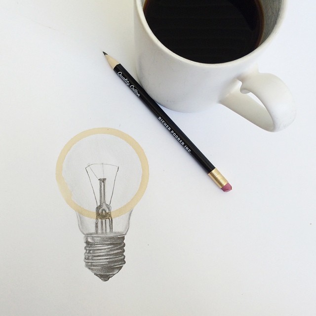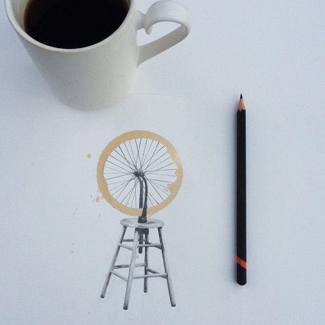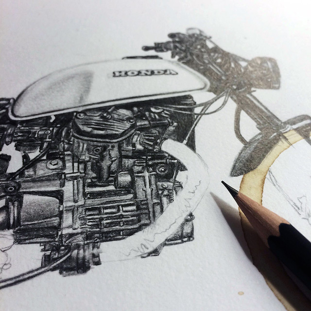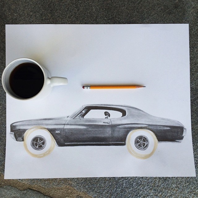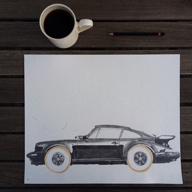 Café y lápiz negro en mano, el diseñador Carter Asmann completa las marcas que deja su taza de desayuno con dibujos de autos, motos y hasta cámaras de fotos.