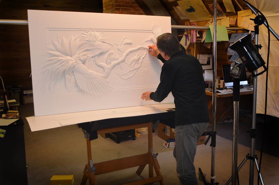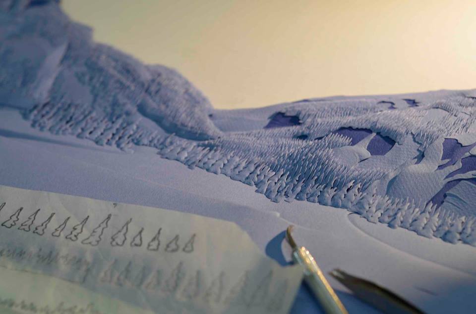 Para crear el complejo efecto tridimensional (un proceso que el artista comparte online), Nicholls arranca con un dibujo que luego, usando un bisturí de precisión, cutters y tijeras, va completando en capas, cortando cuidadosamente diferentes piezas que componen la textura y el volúmen y pegándolas en su lugar. Dependiendo de que tan compleja sea, cada obra puede tomarle desde algunos días hasta un par de años.