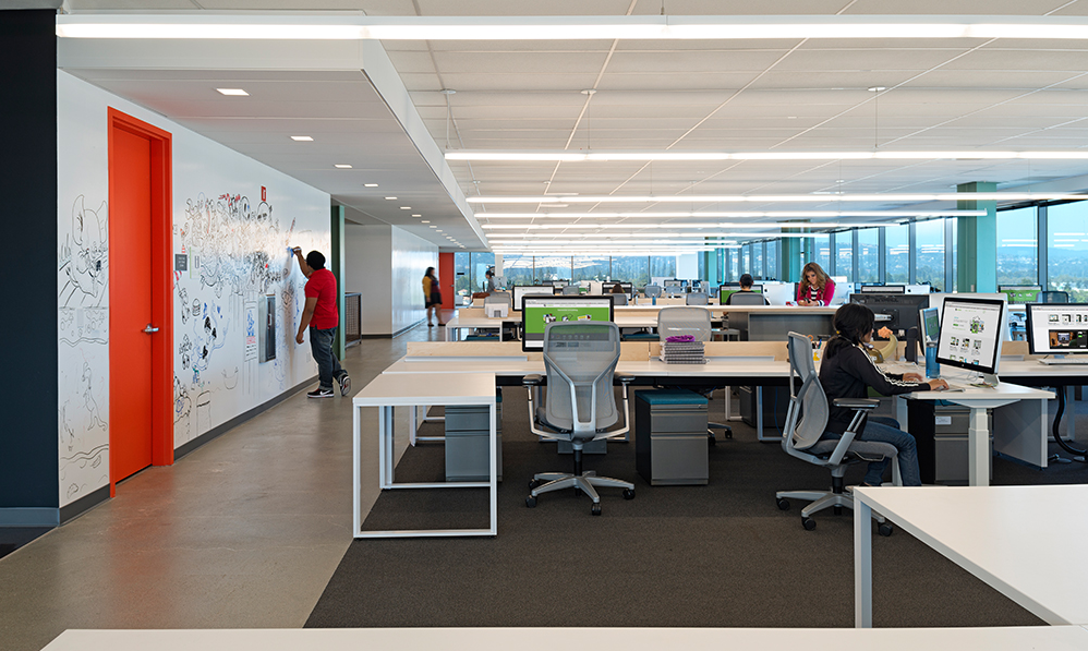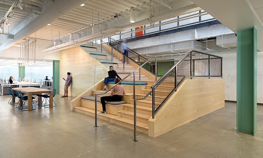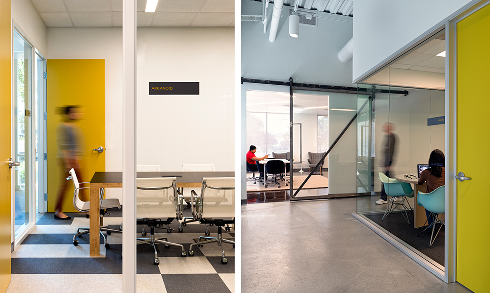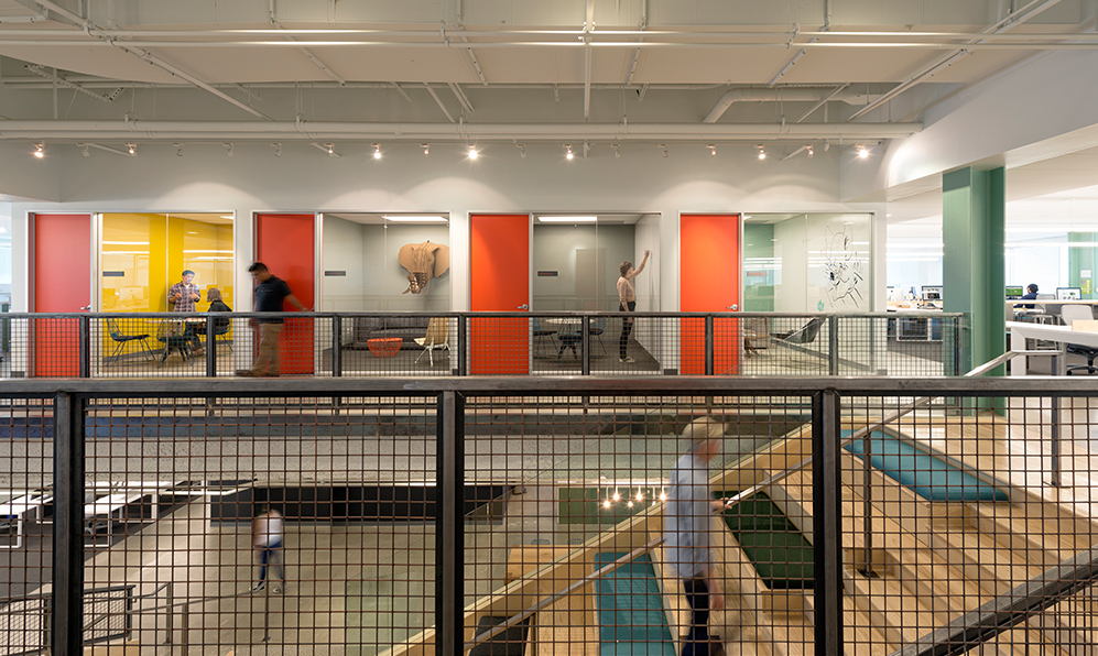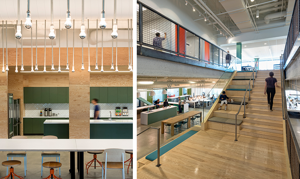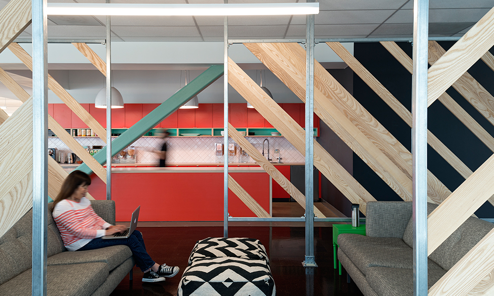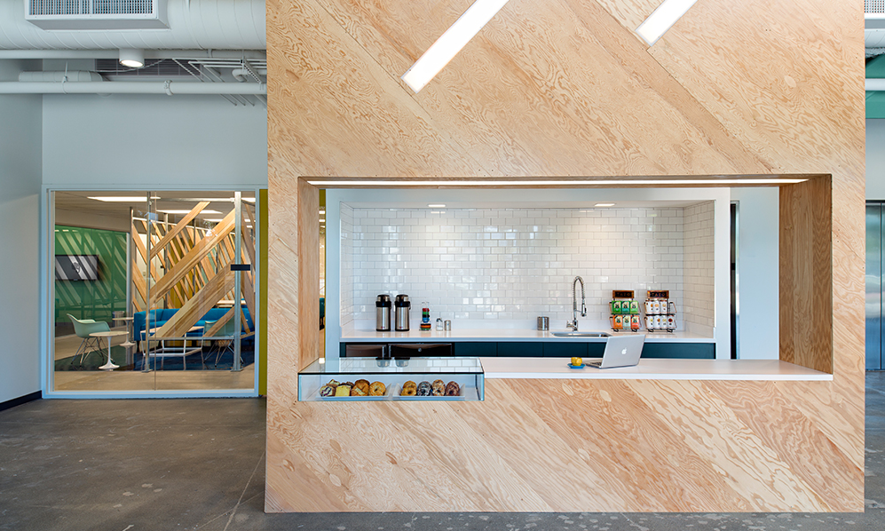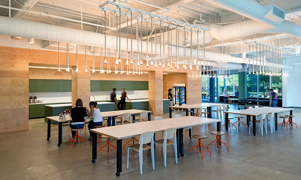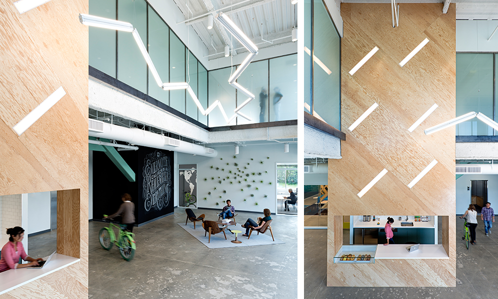 La consigna no era fácil: necesitaban un espacio de trabajo bajo un presupuesto estricto y un timing muy acelerado. Para esto, el estudio decidió que el proceso de construcción fuera parte de la estética, usando materiales limpios y modernos en reemplazo de terminaciones más lujosas. De esta forma, el bar y las salas de recreo fueron realizados en madera contrachapada, y la costosa señalética interna fue reemplazada por representaciones en tiza de la identidad de la compañía, a cargo de la artista Dana Tanamachi.