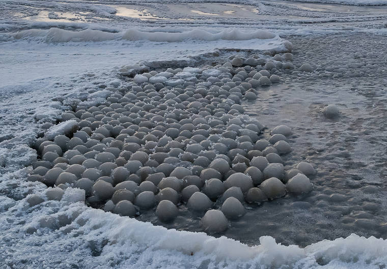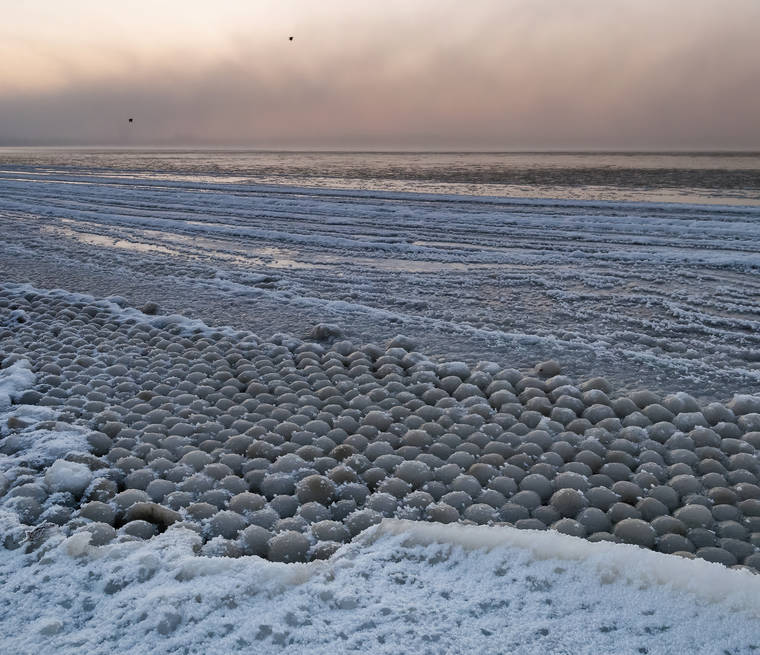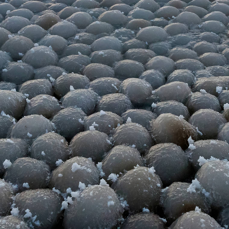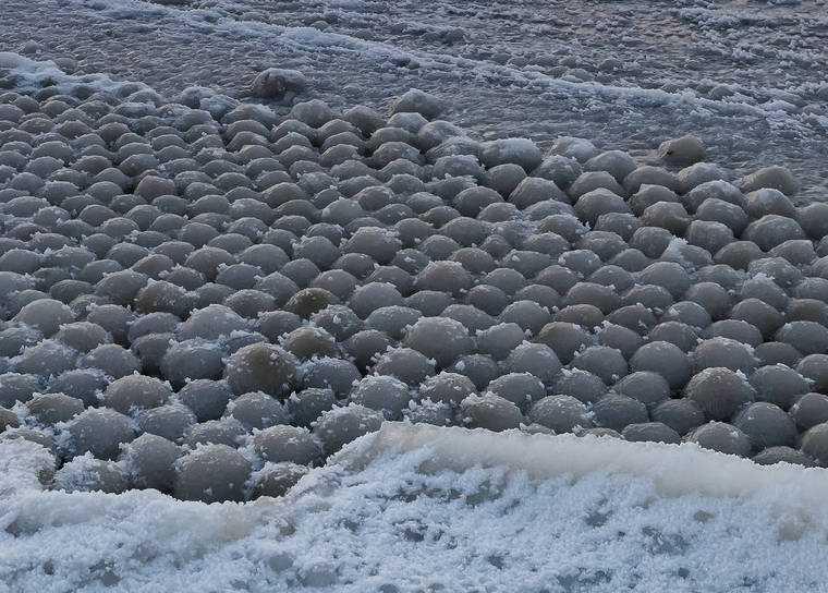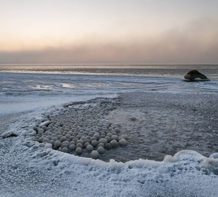 El fotógrafo Aleksandr Abrosimov capturó en las playas de Stroomi beach en Estonia un fenómeno natural extremadamente raro, que gracias a la combinación de una serie de factores climáticos muy particulares convierten a la mezcla de agua de mar y arena de la orilla en bolas de hielo de entre 5 y 10 centímetros de diámetro. Con la temperatura rondando los 20 grados bajo cero, este colchón que parece un envoltorio de plástico con burbujitas debe ser extremadamente frío para pisar.