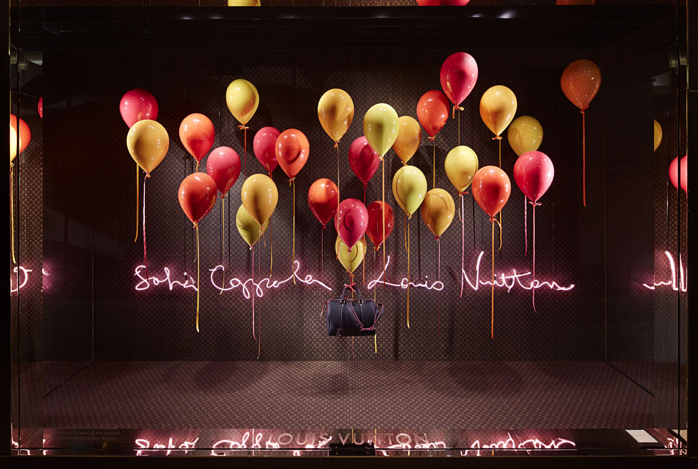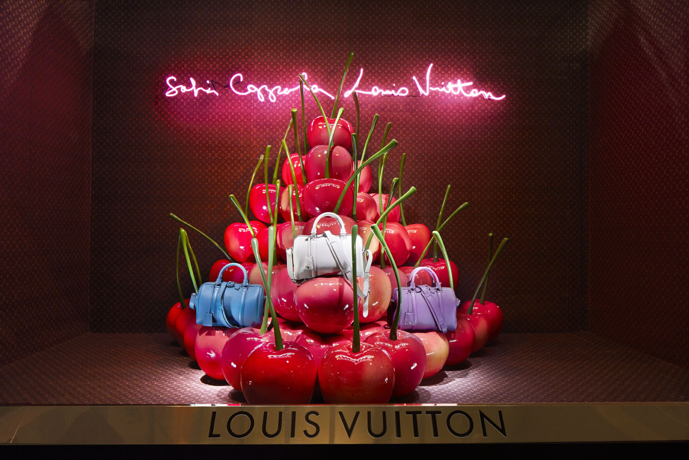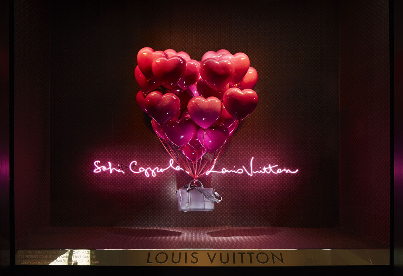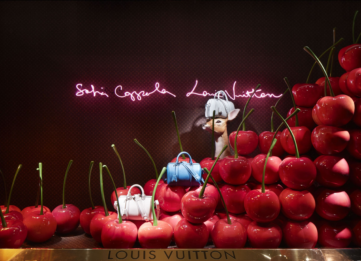 Para celebrar el lanzamiento la marca intervino las vidrieras de Le Bon Marché, uno de los locales favoritos de Sofía en París, íntegramente con un mundo de fantasía en el que los corazones y cerezas gigantes, globos, peonías y un pequeño ciervo se combinan con un fondo de monogramas y lettering en neón. No podría ser de otra forma, el resultado es fantástico.