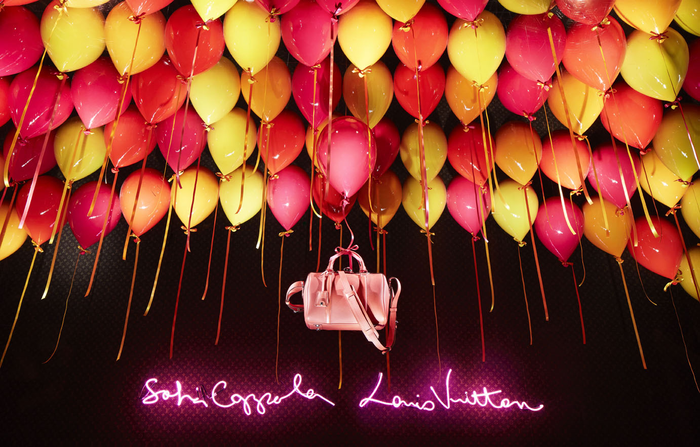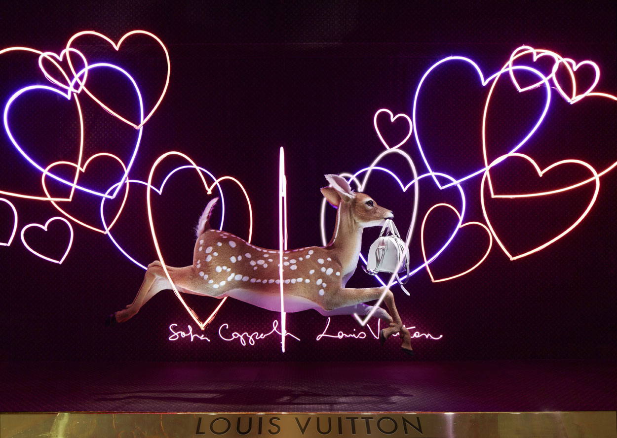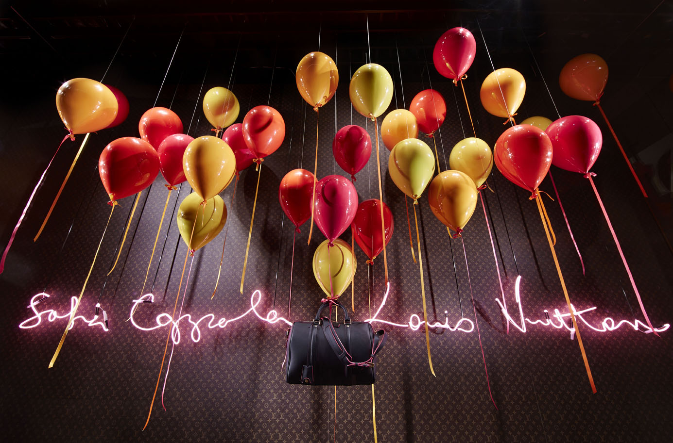 Para celebrar el lanzamiento la marca intervino las vidrieras de Le Bon Marché, uno de los locales favoritos de Sofía en París, íntegramente con un mundo de fantasía en el que los corazones y cerezas gigantes, globos, peonías y un pequeño ciervo se combinan con un fondo de monogramas y lettering en neón. No podría ser de otra forma, el resultado es fantástico.