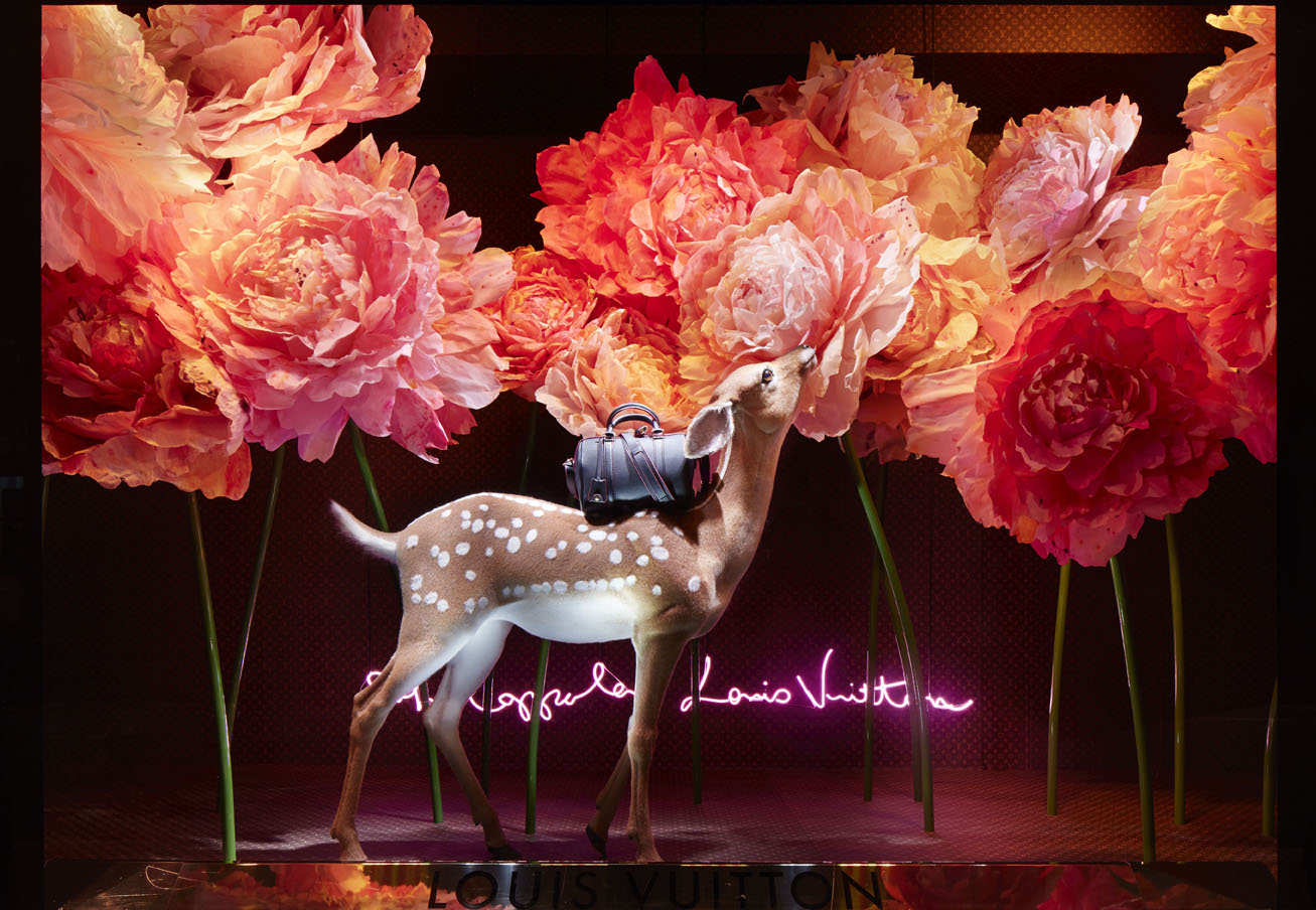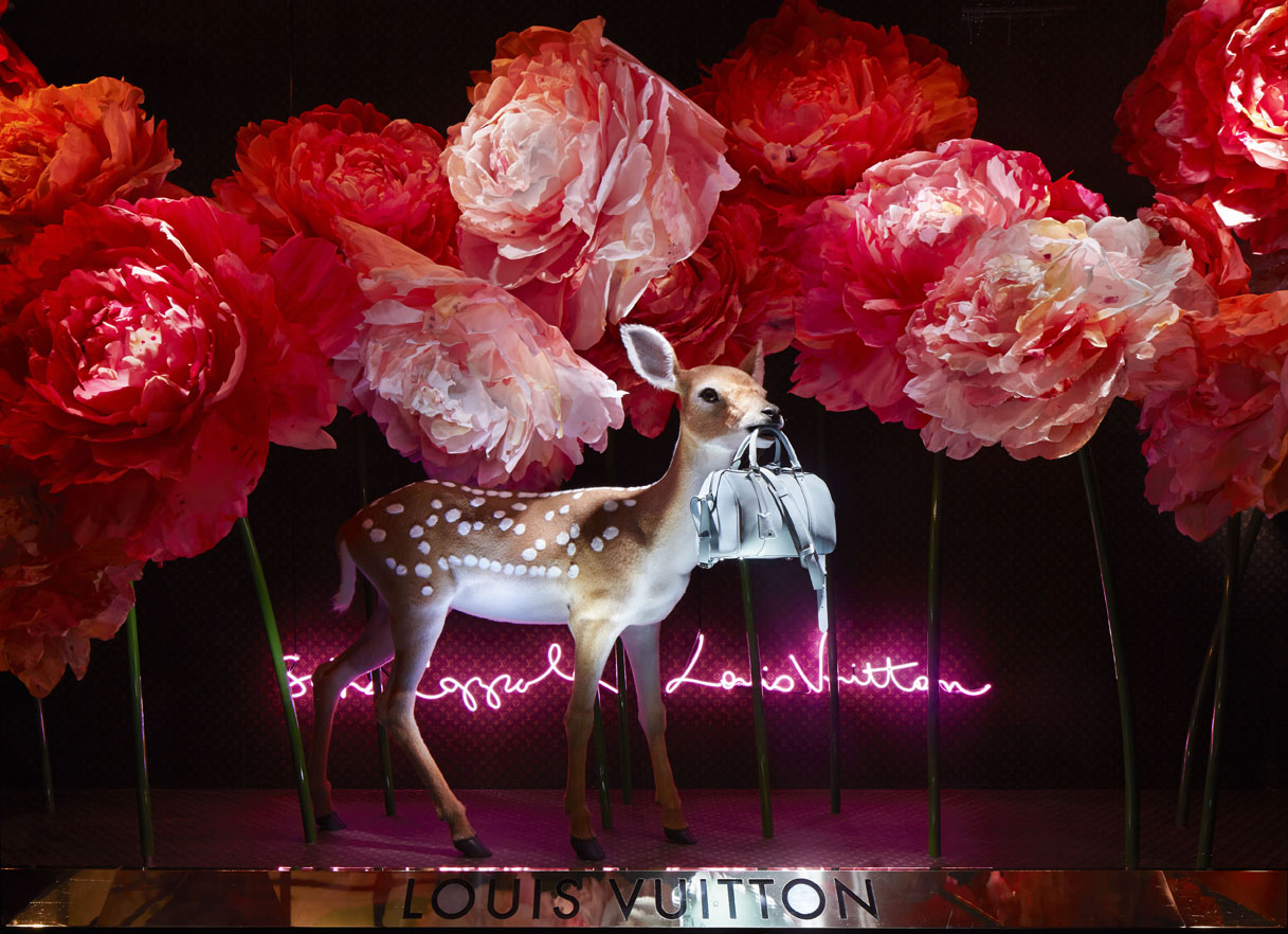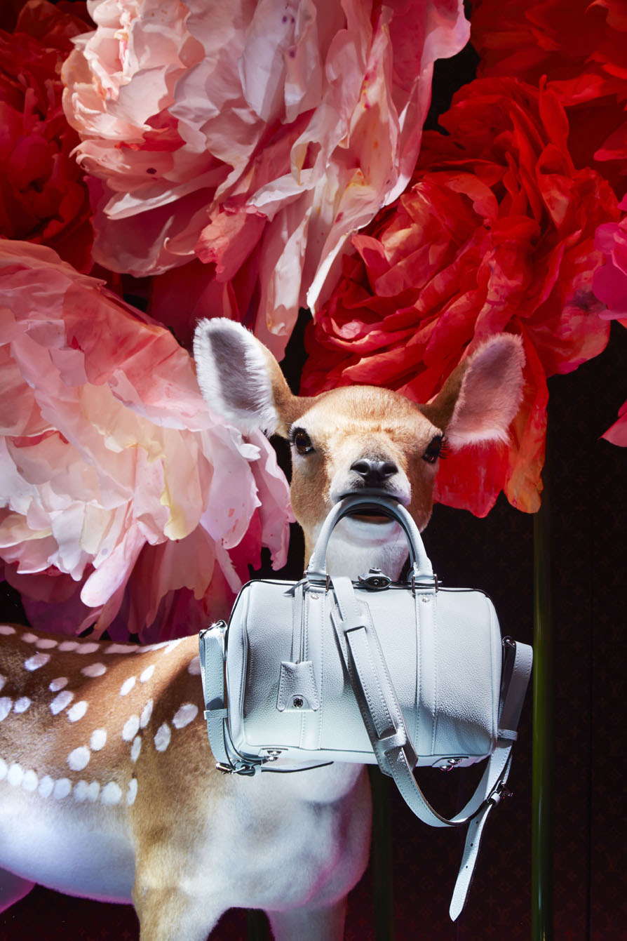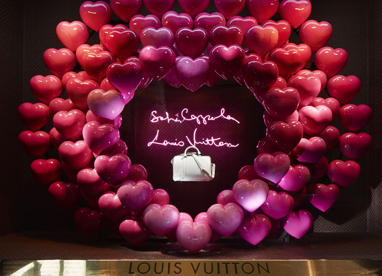 Para celebrar el lanzamiento la marca intervino las vidrieras de Le Bon Marché, uno de los locales favoritos de Sofía en París, íntegramente con un mundo de fantasía en el que los corazones y cerezas gigantes, globos, peonías y un pequeño ciervo se combinan con un fondo de monogramas y lettering en neón. No podría ser de otra forma, el resultado es fantástico.