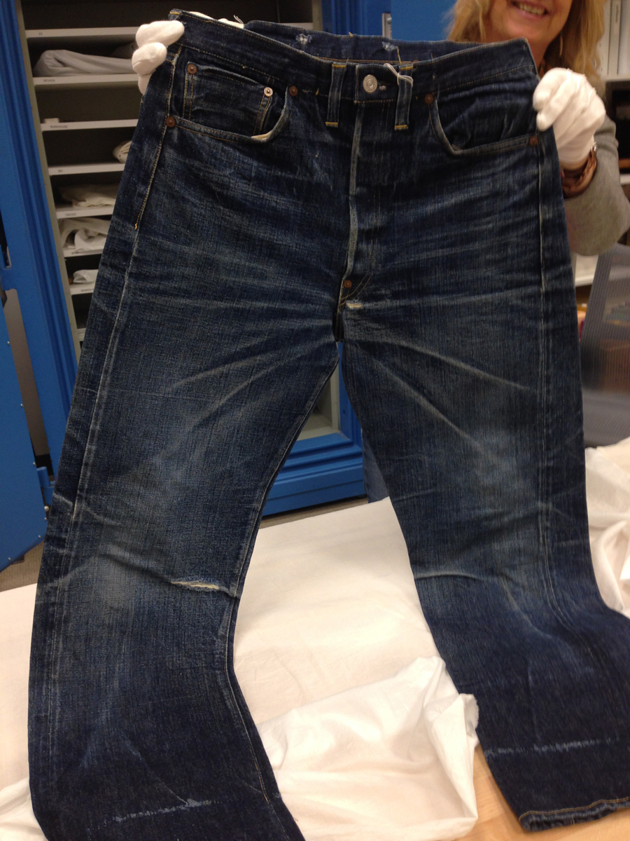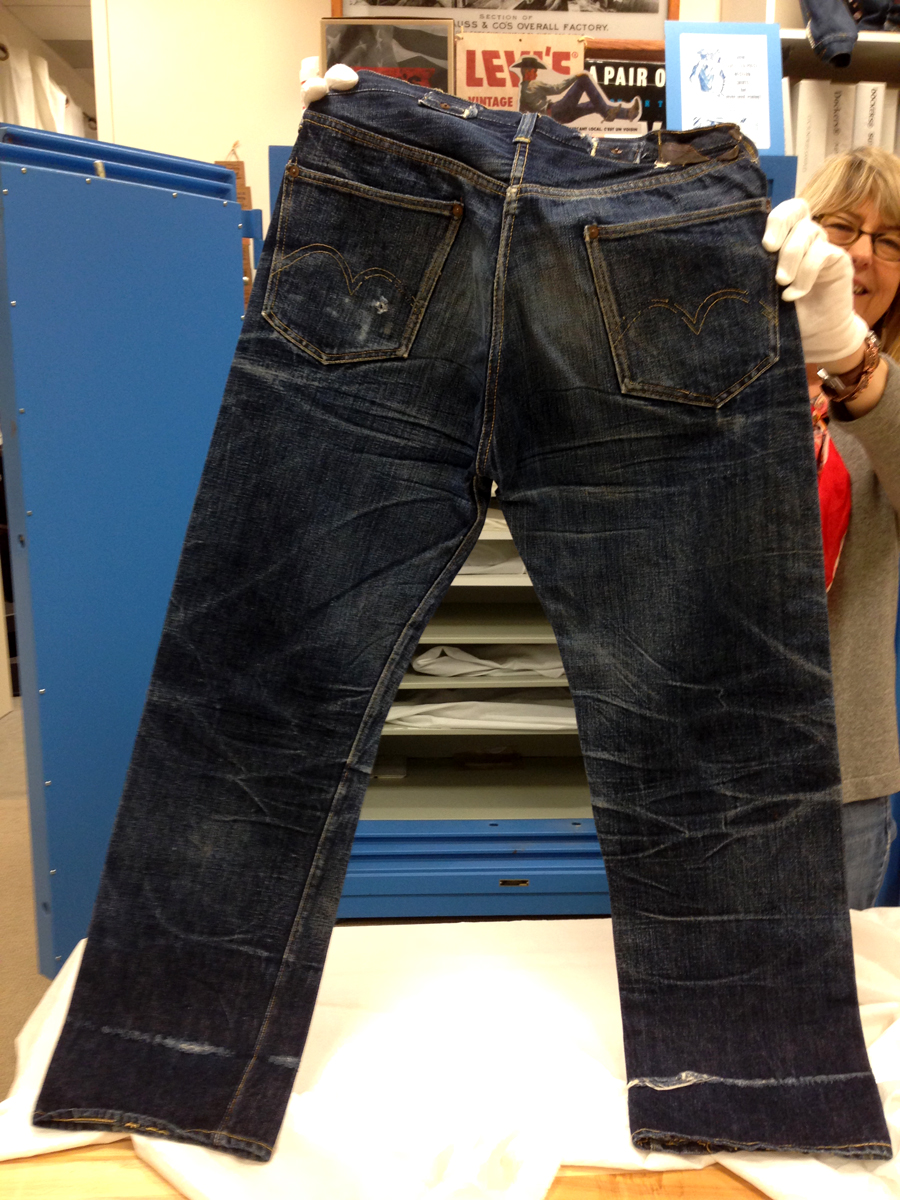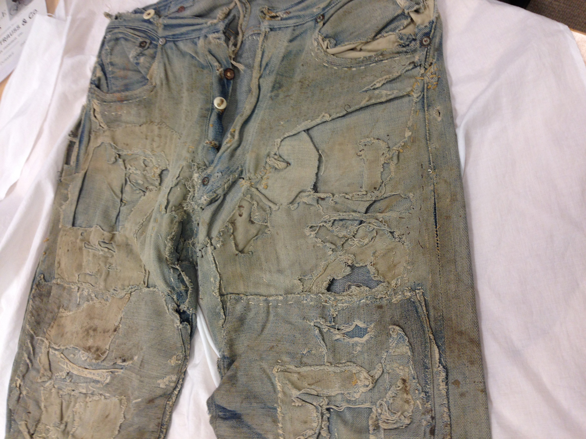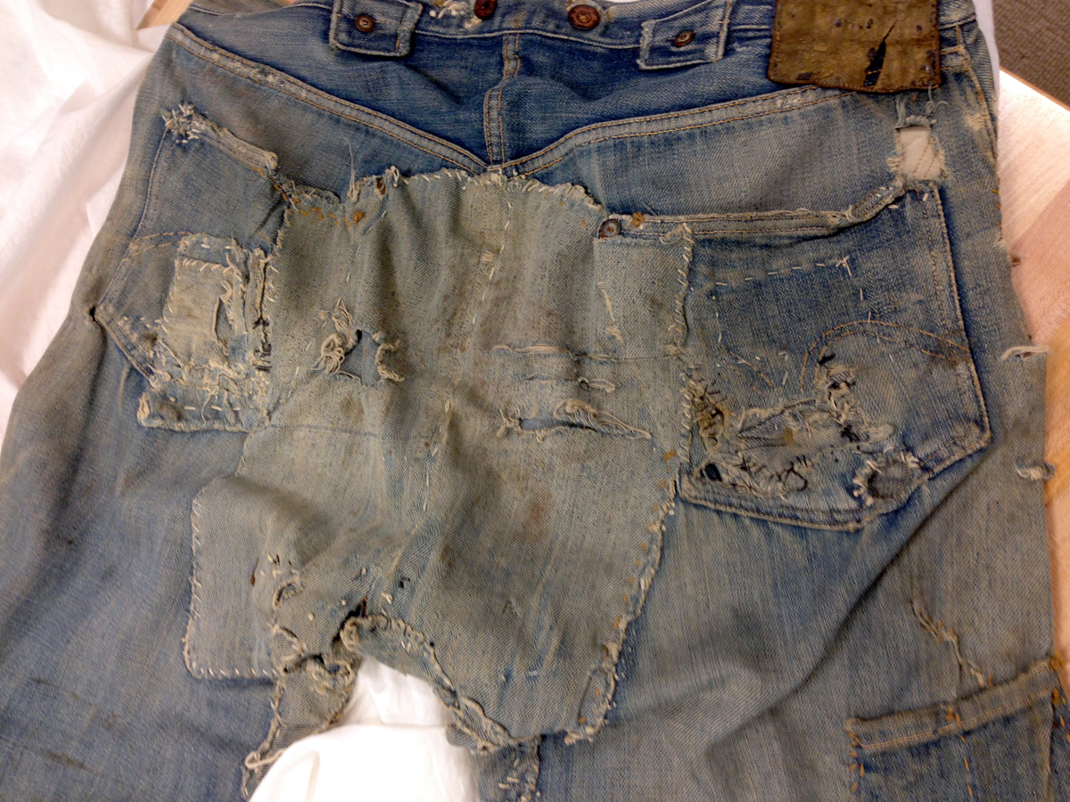 Las dos joyas de la corona del archivo son las primeras en salir de la bóveda. Dos jeans con casi 135 años de antigüedad se descubren entre paños de tela blanca, absolutamente impecables, tanto que, salvo por alguna rotura y el hecho de que al segundo par le falta una pierna (cortarlos era una práctica común entre los mineros, que usaban el género para emparchar sus nuevos pantalones) los dos pares de 501 parecen listos para usar. Traen un solo bolsillo en la parte trasera, ya que el doble bolsillo recién se incorporaría en 1901, bordado con la inconfundible doble costura curva de hilo, los patentados ribetes de cobre y una fortaleza y resistencia sorprendentes, logrando explicar por sí mismos cómo es que los 501 se conviertieron en la prenda más vendida de la historia.