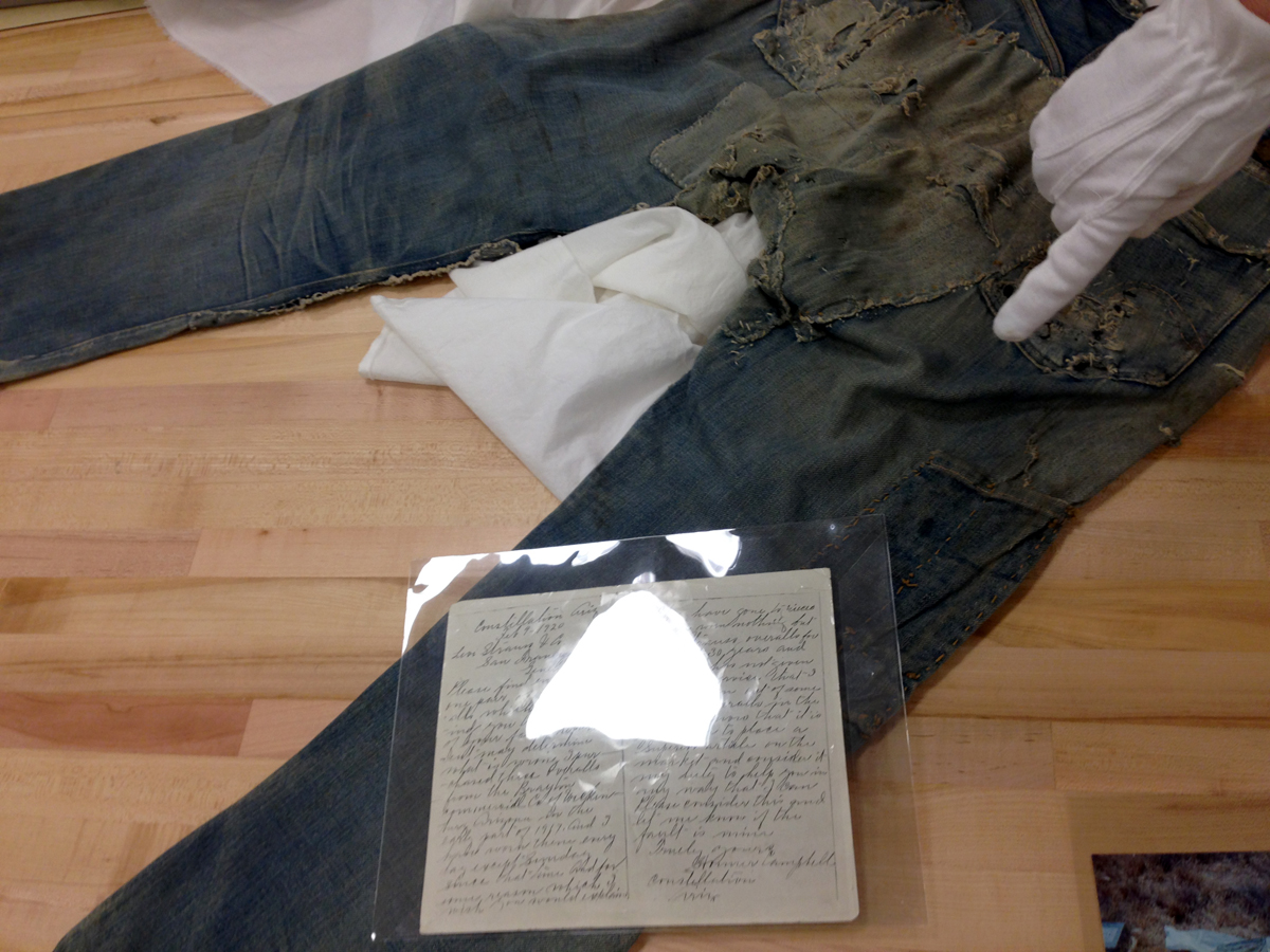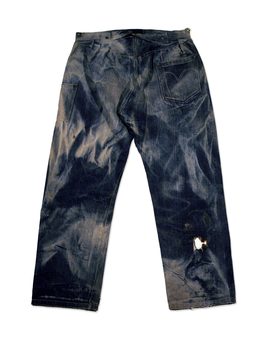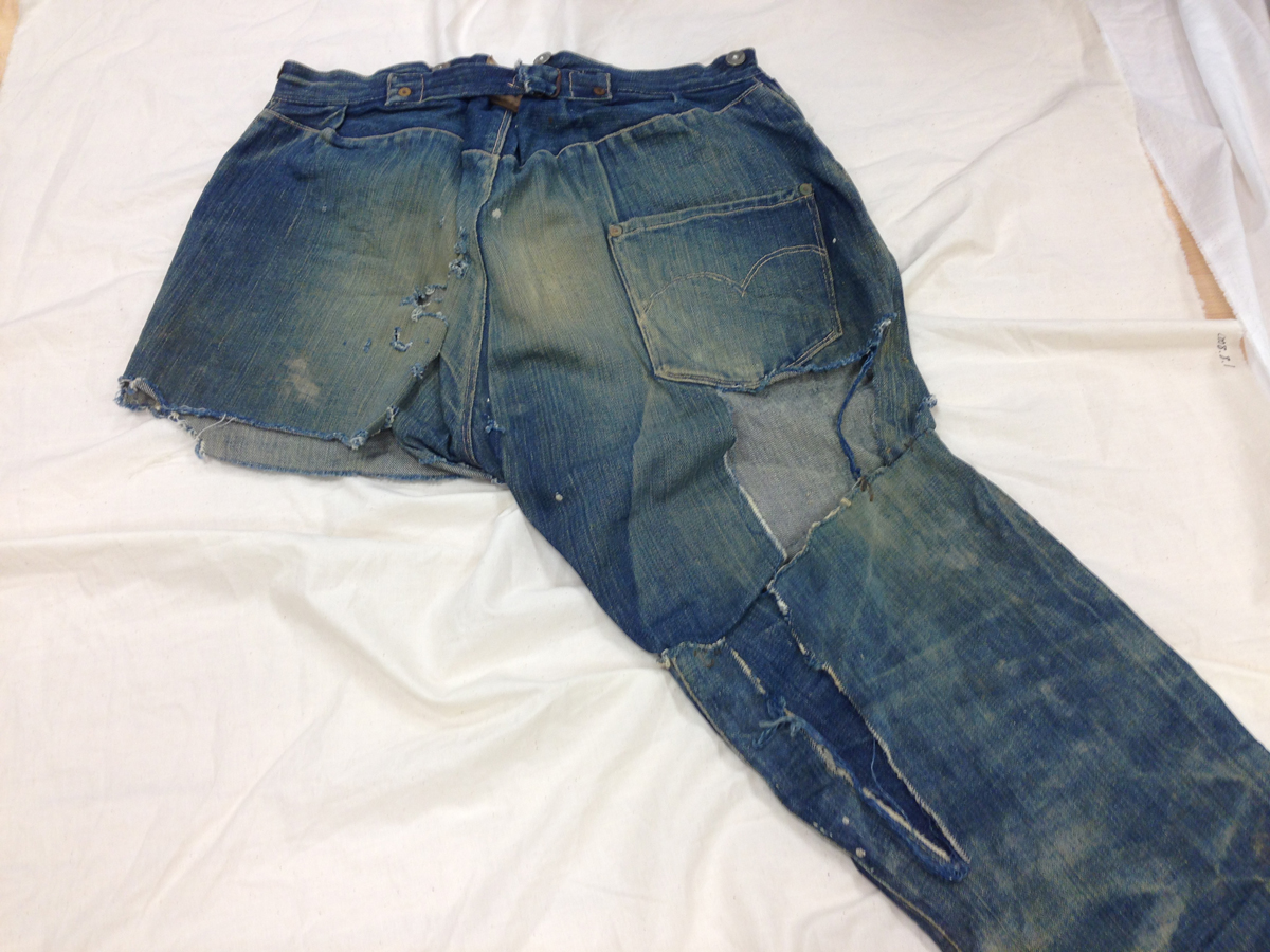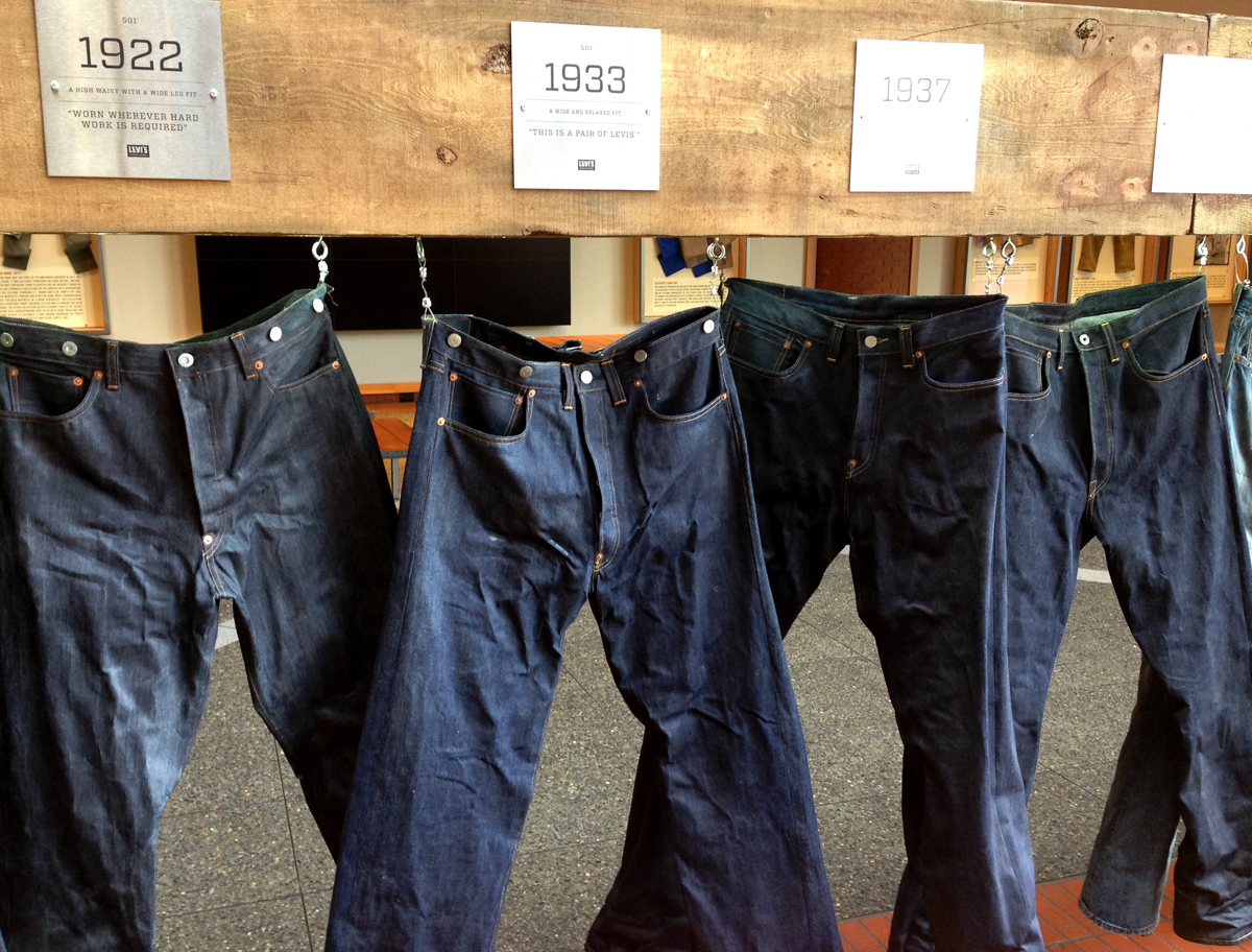 Las dos joyas de la corona del archivo son las primeras en salir de la bóveda. Dos jeans con casi 135 años de antigüedad se descubren entre paños de tela blanca, absolutamente impecables, tanto que, salvo por alguna rotura y el hecho de que al segundo par le falta una pierna (cortarlos era una práctica común entre los mineros, que usaban el género para emparchar sus nuevos pantalones) los dos pares de 501 parecen listos para usar. Traen un solo bolsillo en la parte trasera, ya que el doble bolsillo recién se incorporaría en 1901, bordado con la inconfundible doble costura curva de hilo, los patentados ribetes de cobre y una fortaleza y resistencia sorprendentes, logrando explicar por sí mismos cómo es que los 501 se conviertieron en la prenda más vendida de la historia.