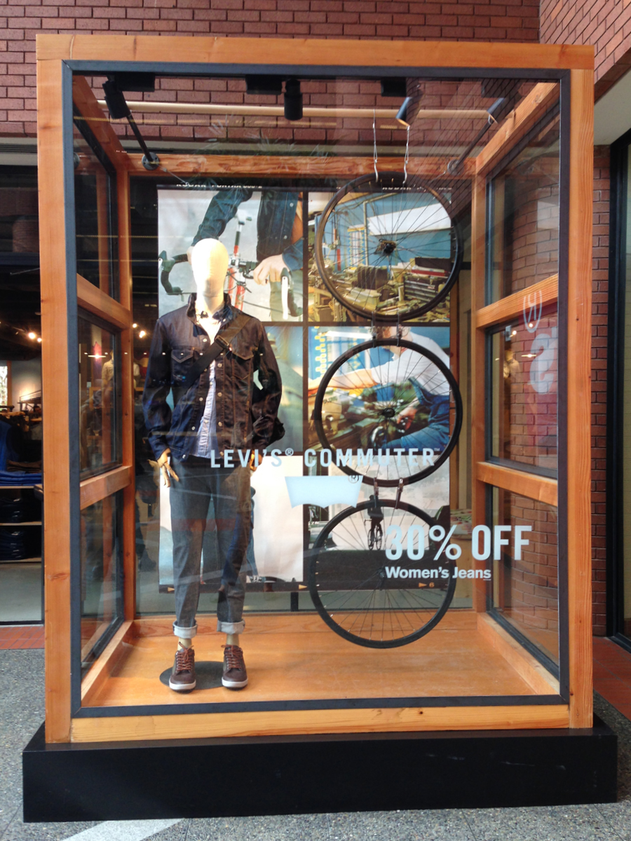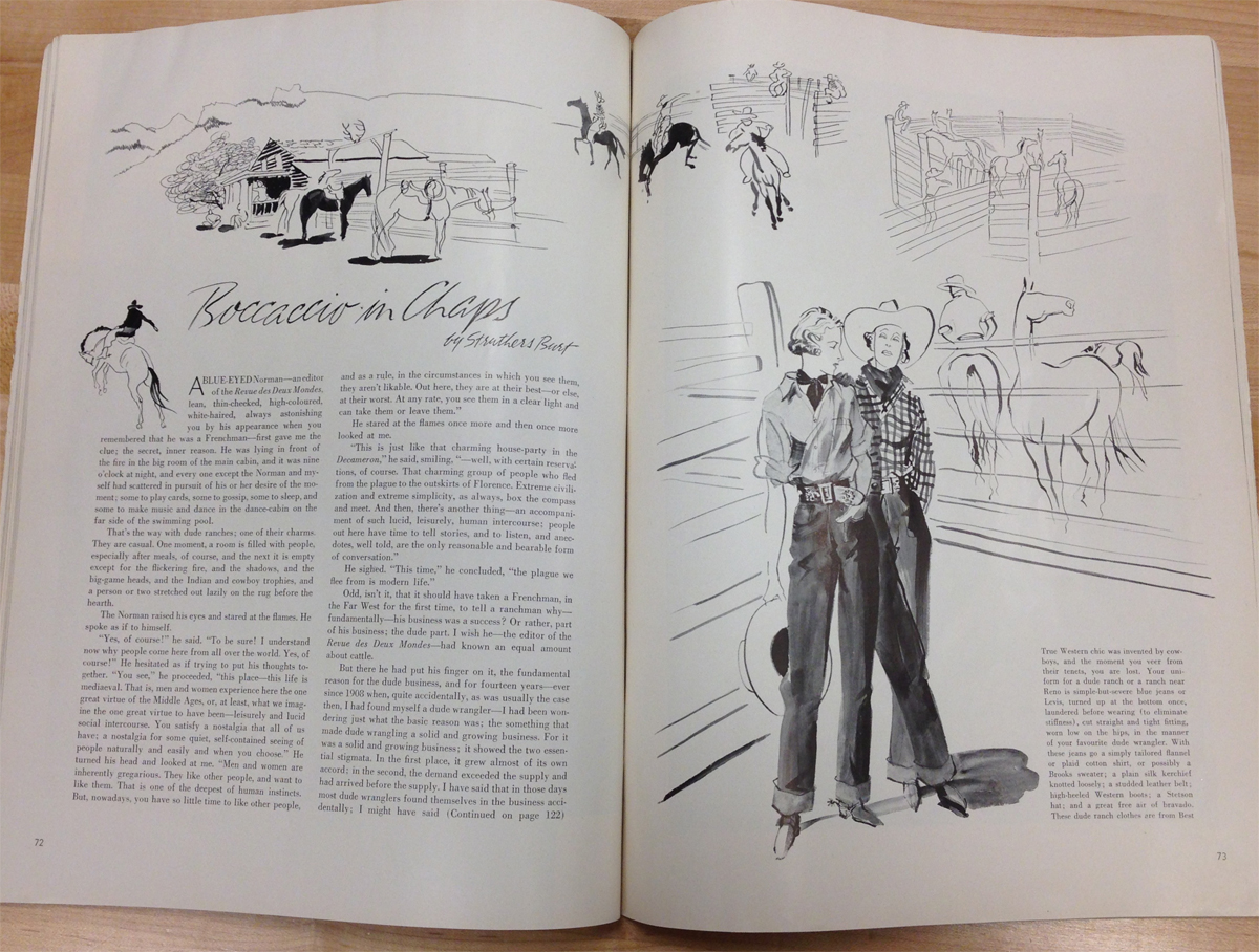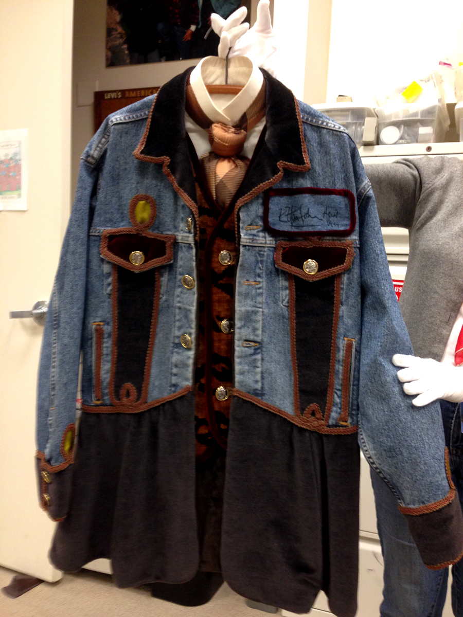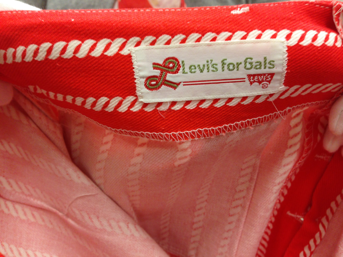 Le sigue una caja con una muy deteriorada campera de jean, que fue encontrada en pésimas condiciones y restaurada por el equipo de la marca, una camisa de rodeo en satén verde agua y los primeros jeans Lady Levi’s creados para la mujer, hace ya 80 años, cuando reemplazar las faldas por pantalones en público era solamente aceptable a la hora vacacionar en los ranchos del oeste americano. Una Vogue ilustrada de 1935 los acompaña, con el primer visionario artículo sobre una nueva tendencia que nacía, un must-have en el guardarropas de toda chica americana.