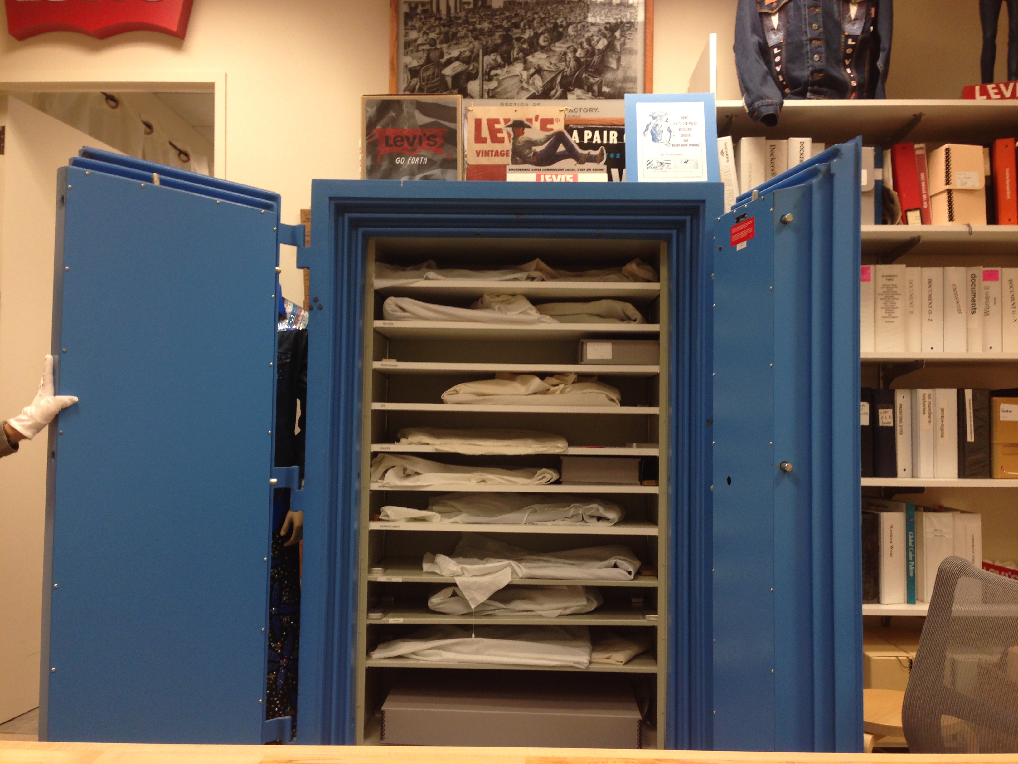 Es un viernes lluvioso y del otro lado de una puerta lateral y enteramente inocua nos recibe Lynn Downey, historiadora y archivista de la marca que un inmigrante de Bavaria llamado Levi Strauss fundaba allá por 1853. Enfundada en guantes blancos y una sonrisa imperturbable, Lynn abre un placard metálico azul brillante, una suerte de caja fuerte a prueba de terremotos, fuego y agua, en la que fila tras fila se esconden los tesoros mas valiosos del archivo de Levi Strauss & Co. Parece exagerado, pero la marca ya tuvo la amarga experiencia de haber perdido una enorme parte de su historia con el famoso terremoto que sacudió a San Francisco en 1906, en el que la casa central de Levi’s y dos de las fábricas fueron totalmente destruidas.